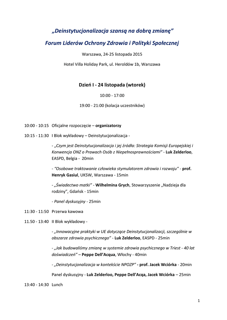 „Deinstytucjonalizacja szansą na dobrą zmianę” Forum Liderów Ochrony Zdrowia i Polityki Społecznej Warszawa, 24-25 listopada 2015 Hotel Villa Holiday Park, ul. Heroldów 1b, Warszawa Dzień I - 24 listopada (wtorek) 10:00 - 17:00 19:00 - 21:00 (kolacja uczestników) 10:00 - 10:15 Oficjalne rozpoczęcie – organizatorzy 10:15 - 11:30 I Blok wykładowy – Deinstytucjonalizacja - „Czym jest Deinstytucjonalizacja i jej źródła: Strategia Komisji Europejskiej i Konwencja ONZ o Prawach Osób z Niepełnosprawnościami” - Luk Zelderloo, EASPD, Belgia - 20min - “Osobowe traktowanie człowieka stymulatorem zdrowia i rozwoju” - prof. Henryk Gasiul, UKSW, Warszawa - 15min - „Świadectwo matki” - Wilhelmina Grych, Stowarzyszenie „Nadzieja dla rodziny”, Gdańsk - 15min - Panel dyskusyjny - 25min 11:30 - 11:50 Przerwa kawowa 11.50 - 13:40 II Blok wykładowy - „Innowacyjne praktyki w UE dotyczące Deinstytucjonalizacji, szczególnie w obszarze zdrowia psychicznego” - Luk Zelderloo, EASPD - 25min - „Jak budowaliśmy zmianę w systemie zdrowia psychicznego w Triest - 40 lat doświadczeń” – Peppe Dell’Acqua, Włochy - 40min - „Deinstytucjonalizacja w kontekście NPOZP” - prof. Jacek Wciórka - 20min Panel dyskusyjny - Luk Zelderloo, Peppe Dell’Acqa, Jacek Wciórka – 25min 13:40 - 14:30 Lunch 1 14:30 - 15:45 Warsztatowe grupy eksperckie - Obszar "centralny" - ekspercki (okrągły stół) // (1 grupa) - Obszar "regionalny" - samorządy regionalne (województwa+miasta wojewódzkie) i NGO wykorzystanie obecnych możliwości (np. fundusze unijne) w procesie Deinstytucjonalizacji // kilka grup - Obszar "lokalny" - klienci i profesjonaliści, samorządy lokalne, pracodawcy (gminy+powiaty) // jakość usług społecznych // kilka grup 15:45 - 16:05 Przerwa kawowa 16:05 - 16:30 Grupy eksperckie - podsumowanie na forum (reprezentanci z każdej grupy) 16:30 - 16:40 „Co posłowie myślą o NPOZP – prezentacja wyników ankiety” - 10min 16:40 - 17:00 Panel dyskusyjny - Marek Balicki, Regina Bisikiewicz, dr Andrzej Cechnicki, Peppe Dell’Acqua, prof. Jacek Wciórka, Luk Zelderloo 17.00 – 17.15 Podsumowanie pierwszego dnia 19.00 – 21.00 Wspólna kolacja uczestników konferencji (w hotelu) Dzień II - 25 listopada (środa) 9:00 - 15:00 9:00 – 9:20 Wprowadzenie do drugiego dnia konferencji – inspiracje z dnia pierwszego 9:20 – 10:20 Polskie dobre praktyki i wyzwania w zakresie Deinstytucjonalizacji: - „Perspektywa dużego szpitala psychiatrycznego” - Stanisław Kracik, Kraków - „Jak pracujemy w podejściu Otwartego Dialogu” - Izabella Ciuńczyk, Koszalin - „Doświadczenia Sekcji Psychiatrii Środowiskowej” - Artur Kochański, Lublin 10:20 – 10:50 „Proces zdrowienia i nowi eksperci - widziane oczami klienta systemu i rodziny” – wywiad, prowadzi prof. Jacek Wciórka 10:50 – 11:10 Przerwa kawowa 11:10 – 11:30 „Źródła finansowania transformacji polskiego systemu” – Luk Zelderloo, EASPD 2 11:30 - 11:50 „Rola liderów w zarządzaniu zmianą” - Regina Bisikiewicz, LMI, Wrocław 11:50 – 13:05 „Praca w grupach: „Jak wykorzystać u siebie europejskie i polskie dobre praktyki czyli Deinstytucjonalizacja z różnych perspektyw” (klienci i rodziny, profesjonaliści, pracodawcy, samorząd). 13:05 - 13:50 Lunch 13:50 – 14:20 Podsumowanie pracy w grupach i dyskusja 14:20 – 15:00 „Jak możemy pomóc polskim liderom w zmianie systemowej?” - Peppe Dell’Acqua, Luk Zelderloo 15:00 Zakończenie konferencji 3