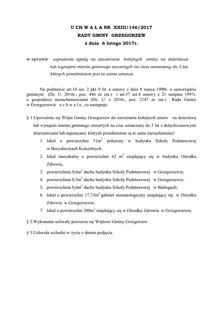 U CH W A Ł A NR XXIII/146/2017 RADY GMINY GRZEGORZEW z dnia 6 lutego 2017r. w sprawie wyrażenia zgody na zawieranie kolejnych umów na dzierżawę lub wynajem mienia gminnego zawartych na czas oznaczony do 3 lat, których przedmiotem jest ta sama umowa. Na podstawie art.18 ust. 2 pkt 9 lit. a ustawy z dnia 8 marca 1990r. o samorządzie gminnym (Dz. U. 2016r., poz. 446 ze zm.) i art.37 ust.4 ustawy z 21 sierpnia 1997r. o gospodarce nieruchomościami (Dz. U. z 2016r., poz. 2147 ze zm.) Rada Gminy w Grzegorzewie u c h w a l a , co następuje: § 1.Upoważnia się Wójta Gminy Grzegorzew do zawierania kolejnych umów na dzierżawę lub wynajem mienia gminnego zawartych na czas oznaczony do 3 lat z dotychczasowymi dzierżawcami lub najemcami, których przedmiotem są te same nieruchomości: 1. lokal o powierzchni 51m2 położony w budynku Szkoły Podstawowej w Borysławicach Kościelnych. 2. lokal mieszkalny o powierzchni 62 m2 znajdujący się w budynku Ośrodka Zdrowia, 3. powierzchnia 0,6m2 dachu budynku Szkoły Podstawowej w Grzegorzewie; 4. powierzchnia 0,5m2 dachu budynku Szkoły Podstawowej w Grzegorzewie; 5. powierzchnia 0,6m2 dachu budynku Szkoły Podstawowej w Barłogach; 6. lokal o powierzchni 17,73m2 gabinet stomatologiczny znajdujący się w Ośrodku Zdrowia w Grzegorzewie; 7. lokal o powierzchni 200m2 znajdujący się w Ośrodku Zdrowia w Grzegorzewie; § 2.Wykonanie uchwały powierza się Wójtowi Gminy Grzegorzew. § 3.Uchwała wchodzi w życie z dniem podjęcia. UZASADNIENIE do uchwały Nr XXIII/146/2017 Rady Gminy Grzegorzew z dnia 6 lutego 2017r. w sprawie wyrażenia zgody na zawieranie kolejnych umów na dzierżawę lub wynajem mienia gminnego zawartych na czas oznaczony do 3 lat, których przedmiotem jest ta sama umowa. Zgodnie z art.18 ust. pkt. 9 lit. a ustawy o samorządzie gminnym do wyłącznej właściwości rady gminy należy podejmowanie uchwał w sprawach majątkowych gminy, przekraczających zakres zwykłego zarządu, dotyczących zasad nabywania, zbywania i obciążania nieruchomości oraz ich wydzierżawiania lub wynajmowania na czas dłuższy niż 3 lata lub na czas nieoznaczony. Uchwała rady gminy jest wymagana również w przypadku, gdy po umowie zawartej na czas oznaczony do 3 lat strony zamierzają zawrzeć kolejne umowy, których przedmiotem jest ta sama nieruchomość. Niniejsza uchwała dotyczy wyrażenia zgody na zawarcie kolejnych umów z dotychczasowymi najemcami i dzierżawcami na okres do 3 lat, a mianowicie: 1.Lokal znajduje się w budynku Szkoły Podstawowej w Borysławicach Kościelnych i jest wynajmowany na potrzeby Filii Gminnej Biblioteki Publicznej. 2.Lokal znajduje się w budynku Ośrodka Zdrowia w Grzegorzewie i jest wynajmowany jako lokal mieszkalny. 3.Powierzchnia dachu znajduje się na budynku Szkoły Podstawowej w Grzegorzewie i dzierżawiona jest na montaż urządzeń do rozsyłu internetu. 4.Powierzchnia dachu znajduje się na budynku Szkoły Podstawowej w Grzegorzewie i dzierżawiona jest na montaż urządzeń do rozsyłu internetu. 5. Powierzchnia dachu znajduje się na budynku Szkoły Podstawowej w Barłogach i dzierżawiona jest na montaż urządzeń do rozsyłu internetu. 6.Lokal znajduje się w budynku Ośrodka Zdrowia w Grzegorzewie i jest wydzierżawiany jako Gabinet Stomatologiczny. 7.Lokal znajduje się w Ośrodka Zdrowia i wydzierżawiany jest na prowadzenie praktyki lekarskiej w ramach kontraktu z Narodowym Funduszem Zdrowia. Najemcy i dzierżawcy należycie wywiązują się z warunków zawartych w umowach. Wobec powyższego podjęcie uchwały jest uzasadnione.