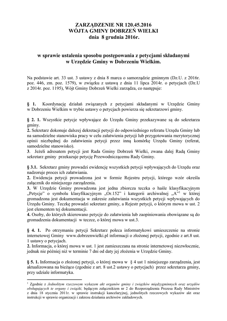 ZARZĄDZENIE NR 120.45.2016 WÓJTA GMINY DOBRZEŃ WIELKI dnia 8 grudnia 2016r. w sprawie ustalenia sposobu postępowania z petycjami składanymi w Urzędzie Gminy w Dobrzeniu Wielkim. Na podstawie art. 33 ust. 3 ustawy z dnia 8 marca o samorządzie gminnym (Dz.U. z 2016r. poz. 446, zm. poz. 1579), w związku z ustawą z dnia 11 lipca 2014r. o petycjach (Dz.U z 2014r. poz. 1195), Wójt Gminy Dobrzeń Wielki zarządza, co następuje: § 1. Koordynację działań związanych z petycjami składanymi w Urzędzie Gminy w Dobrzeniu Wielkim w trybie ustawy o petycjach powierza się sekretarzowi gminy. § 2. 1. Wszystkie petycje wpływające do Urzędu Gminy przekazywane są do sekretarza gminy. 2. Sekretarz dokonuje dalszej dekretacji petycji do odpowiedniego referatu Urzędu Gminy lub na samodzielne stanowiska pracy w celu załatwienia petycji lub przygotowania merytorycznej opinii niezbędnej do załatwienia petycji przez inną komórkę Urzędu Gminy (referat, samodzielne stanowisko). 3. Jeżeli adresatem petycji jest Rada Gminy Dobrzeń Wielki, zwana dalej Radą Gminy sekretarz gminy przekazuje petycję Przewodniczącemu Rady Gminy. § 3.1. Sekretarz gminy prowadzi ewidencję wszystkich petycji wpływających do Urzędu oraz nadzoruje proces ich załatwiania. 2. Ewidencja petycji prowadzona jest w formie Rejestru petycji, którego wzór określa załącznik do niniejszego zarządzenia. 3. W Urzędzie Gminy prowadzona jest jedna zbiorcza teczka o haśle klasyfikacyjnym „Petycje” o symbolu klasyfikacyjnym „Or.152” i kategorii archiwalnej „A”1 w której gromadzona jest dokumentacja w zakresie załatwiania wszystkich petycji wpływających do Urzędu Gminy. Teczkę prowadzi sekretarz gminy, a Rejestr petycji, o którym mowa w ust. 2 jest elementem tej dokumentacji. 4. Osoby, do których skierowano petycje do załatwienia lub zaopiniowania obowiązane są do gromadzenia dokumentacji w teczce, o której mowa w ust.3. § 4. 1. Po otrzymaniu petycji Sekretarz poleca informatykowi umieszczenie na stronie internetowej Gminy www.dobrzenwielki.pl informacji o złożonej petycji, zgodnie z art.8 ust. 1 ustawy o petycjach. 2. Informacja, o której mowa w ust. 1 jest zamieszczana na stronie internetowej niezwłocznie, jednak nie później niż w terminie 7 dni od daty jej złożenia w Urzędzie Gminy. § 5. 1. Informacja o złożonej petycji, o której mowa w § 4 ust 1 niniejszego zarządzenia, jest aktualizowana na bieżąco (zgodnie z art. 8 ust.2 ustawy o petycjach) przez sekretarza gminy, przy udziale informatyka. Zgodnie z Jednolitym rzeczowym wykazem akt organów gminy i związków międzygminnych oraz urzędów obsługujących te organy i związki, będącym załącznikiem nr 2 do Rozporządzenia Prezesa Rady Ministrów z dnia 18 stycznia 2011r. w sprawie instrukcji kancelaryjnej, jednolitych rzeczowych wykazów akt oraz instrukcji w sprawie organizacji i zakresu działania archiwów zakładowych. 1 2. Za przekazywanie sekretarzowi gminy dokumentów oraz danych niezbędnych do bieżącej aktualizacji informacji o petycji, odpowiedzialny jest kierownik referatu lub pracownik na samodzielnym stanowisku pracy, do którego skierowano petycję do załatwienia lub zaopiniowania. § 6. Informację o petycji skierowanej do Rady Gminy oraz jej aktualizację zapewnia sekretarz gminy z udziałem informatyka na podstawie informacji i dokumentów uzyskanych od Rady Gminy. § 7. Zawiadomienie podmiotu wnoszącego petycję o sposobie jej załatwienia lub informacje o pozostawieniu petycji bez rozpatrzenia podpisuje Wójt lub Sekretarz Gminy, z wyłączeniem petycji których adresatem jest Rada Gminy. § 8. 1. Stosownie do art. 14 ustawy o petycjach, sekretarz gminy przygotowuje corocznie zbiorczą informację o petycjach rozpatrzonych w roku poprzednim 2. Informacja, o której mowa w ust. 1 zamieszczana jest na stronie www.dobrzenwielki.pl w pozycji menu „Petycje” w terminie do 30 czerwca. § 9. Wykonanie zarządzenia powierza się sekretarzowi gminy. § 10. Zarządzenie wchodzi w życie z dniem 1 stycznia 2017r. Załącznik do Zarządzenia Nr 120.45.2016 Wójta Gminy Dobrzeń Wielki z dnia 8 grudnia 2016r. -WZÓROr.152.1. REJESTR PETYCJI ……………………. rok PETYCJA NR …………………………… 1. 2. 3. 4. 4a 5. 5a 6. 7. 8. 9. 10. 11. 12. Nadany numer kancelaryjny Data wpływu petycji do Urzędu Gminy Form złożenia petycji (pisemna, e-puap,e-mail) Imię i nazwisko albo nazwa podmiotu wnoszącego petycję Zgoda na ujawnienie danych z poz. 4 w informacji o petycji zamieszczonej na stronie internetowej Gminy Imię i nazwisko oraz nazwa podmiotu trzeciego (w przypadku, gdy petycja jest składana w interesie podmiotu trzeciego) Zgoda na ujawnienie danych z poz. 5 w informacji o petycji zamieszczonej na stronie internetowej Przedmiot petycji Treść petycji Data zamieszczenia informacji o petycji na stronie internetowej Gminy Wskazanie podmiotu odpowiadającego za terminowe załatwienie petycji Wyznaczony termin rozpatrzenia petycji Sposób załatwienia petycji Data zawiadomienia podmiotu wnoszącego petycję o sposobie jej załatwienia TAK/ NIE* TAK/ NIE* * niepotrzebne skreślić PETYCJA NR …………………………… 1. 2. 3. 4. 4a 5. Nadany numer kancelaryjny Data wpływu petycji do Urzędu Gminy Form złożenia petycji (pisemna, e-puap, e-mail) Imię i nazwisko albo nazwa podmiotu wnoszącego petycję Zgoda na ujawnienie danych z poz. 4 w informacji o petycji zamieszczonej na stronie internetowej Gminy Imię i nazwisko oraz nazwa podmiotu trzeciego TAK/ NIE* 5a 6. 7. 8. 9. 10. 11. 12. (w przypadku, gdy petycja jest składana w interesie podmiotu trzeciego) Zgoda na ujawnienie danych z poz. 5 w informacji o petycji zamieszczonej na stronie internetowej Przedmiot petycji Treść petycji Data zamieszczenia informacji o petycji na stronie internetowej Gminy Wskazanie podmiotu odpowiadającego za terminowe załatwienie petycji Wyznaczony termin rozpatrzenia petycji Sposób zał
