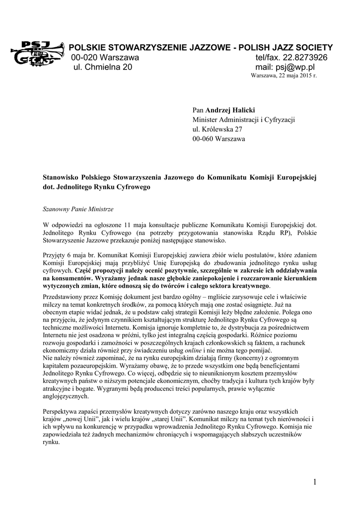 POLSKIE STOWARZYSZENIE JAZZOWE - POLISH JAZZ SOCIETY 00-020 Warszawa tel/fax. 22.8273926 ul. Chmielna 20 mail: [email protected] Warszawa, 22 maja 2015 r. Pan Andrzej Halicki Minister Administracji i Cyfryzacji ul. Królewska 27 00-060 Warszawa Stanowisko Polskiego Stowarzyszenia Jazowego do Komunikatu Komisji Europejskiej dot. Jednolitego Rynku Cyfrowego Szanowny Panie Ministrze W odpowiedzi na ogłoszone 11 maja konsultacje publiczne Komunikatu Komisji Europejskiej dot. Jednolitego Rynku Cyfrowego (na potrzeby przygotowania stanowiska Rządu RP), Polskie Stowarzyszenie Jazzowe przekazuje poniżej następujące stanowisko. Przyjęty 6 maja br. Komunikat Komisji Europejskiej zawiera zbiór wielu postulatów, które zdaniem Komisji Europejskiej mają przybliżyć Unię Europejską do zbudowania jednolitego rynku usług cyfrowych. Część propozycji należy ocenić pozytywnie, szczególnie w zakresie ich oddziaływania na konsumentów. Wyrażamy jednak nasze głębokie zaniepokojenie i rozczarowanie kierunkiem wytyczonych zmian, które odnoszą się do twórców i całego sektora kreatywnego. Przedstawiony przez Komisję dokument jest bardzo ogólny ‒ mgliście zarysowuje cele i właściwie milczy na temat konkretnych środków, za pomocą których mają one zostać osiągnięte. Już na obecnym etapie widać jednak, że u podstaw całej strategii Komisji leży błędne założenie. Polega ono na przyjęciu, że jedynym czynnikiem kształtującym strukturę Jednolitego Rynku Cyfrowego są techniczne możliwości Internetu. Komisja ignoruje kompletnie to, że dystrybucja za pośrednictwem Internetu nie jest osadzona w próżni, tylko jest integralną częścią gospodarki. Różnice poziomu rozwoju gospodarki i zamożności w poszczególnych krajach członkowskich są faktem, a rachunek ekonomiczny działa również przy świadczeniu usług online i nie można tego pomijać. Nie należy również zapominać, że na rynku europejskim działają firmy (koncerny) z ogromnym kapitałem pozaeuropejskim. Wyrażamy obawę, że to przede wszystkim one będą beneficjentami Jednolitego Rynku Cyfrowego. Co więcej, odbędzie się to nieuniknionym kosztem przemysłów kreatywnych państw o niższym potencjale ekonomicznym, choćby tradycja i kultura tych krajów były atrakcyjne i bogate. Wygranymi będą producenci treści popularnych, prawie wyłącznie anglojęzycznych. Perspektywa zapaści przemysłów kreatywnych dotyczy zarówno naszego kraju oraz wszystkich krajów „nowej Unii”, jak i wielu krajów „starej Unii”. Komunikat milczy na temat tych nierówności i ich wpływu na konkurencję w przypadku wprowadzenia Jednolitego Rynku Cyfrowego. Komisja nie zapowiedziała też żadnych mechanizmów chroniących i wspomagających słabszych uczestników rynku. 1 Już na samym wstępie Komunikatu, zwraca uwagę cytat z wypowiedzi Przewodniczącego Komisji Europejskiej, Jean-Claude Junckera, uzasadniający cel reformy, z którym absolutnie nie możemy się zgodzić. „Będziemy potrzebowali odwagi, aby rozbić istniejące sztywne struktury krajowe w takich obszarach, jak […] przepisy dotyczące praw autorskich”. Jesteśmy przeciwni tezie, iż prawo autorskie jest ‒ zdaniem Komisji Europejskiej ‒ jedną z podstawowych przeszkód w rozwoju rynku usług cyfrowych i należy znieść zasadę jego terytorialnej odrębności. Ze zdumieniem dostrzegamy, że nieprawdziwa i demagogiczna teza o rzekomych barierach wynikających z istnienia praw autorskich została bezkrytycznie przyjęta i włączona jako oficjalne stanowisko Komisji Europejskiej. Nie trzeba dokonywać rewolucji w istniejących zasadach ochrony prawnoautorskiej by zrealizować podstawowy postulat Przewodniczącego Junckera wyrażony we wstępie do Komunikatu: „Otworzymy w ten sposób konsumentom dostęp do usług, muzyki, filmów i wydarzeń sportowych za pośrednictwem urządzeń elektronicznych w każdym miejscu w Europie, bez względu na granice krajowe”. Trzeba pamiętać, że do istnienia i rozwoju całego opartego na wiedzy rynku cyfrowego niezbędni są twórcy, którzy z kolei żyją właśnie z praw do swojej twórczości. Tylko zrównoważony system, uwzględniający interesy podmiotów uprawnionych z tytułu praw autorskich zapewnia rozwój tego rynku. Zmarginalizowanie roli twórców, producentów, wydawców, a także dystrybutorów i nadawców, w dłuższej perspektywie będzie prowadzić do jego osłabienia, a docelowo zaniku. Zagrożenia dla przemysłów kreatywnych i konsumentów związane ze zniesieniem geoblockingu i ograniczeniem zasady terytorialności praw autorskich Komisja dąży do wprowadzenia ułatwień w transgranicznym dostępie online do utworów. Jako główną przyczynę trudności w takim dostępie błędnie wskazuje na zasadę terytorializmu praw autorskich. Należy wyraźnie podkreślić, że zasada terytorializmu prawa autorskiego w żadnym razie nie stoi na przeszkodzie udostępnianiu filmów czy muzyki na skalę ogólnoeuropejską – jest to kwestia nabycia odpowiednich licencji. O prawdziwości tego stwierdzenia świadczą statystyki ‒ obecnie na rynku europejskim działa prawie 300 serwisów muzycznych on-line (takich jak Spotify czy Deezer) oraz prawie 3000 serwisów wideo na żądanie (video-on demand). Ich popularność i sukces finansowy są najlepszym dowodem na to, że obecny system prawa autorskiego nie jest przeszkodą w prowadzeniu działalności tego rodzaju. Żaden uprawniony nie stwarza sztucznych barier dostępu do wytworzonych przez siebie treści. Wprost przeciwnie, wszystkim im zależy na jak najszerszym upowszechnieniu oferowanych utworów. Jest natomiast sprawą pośrednika decyzja, w jakim zakresie zamierza nabyć prawa do eksploatacji utworów i jaką kwotę ma w związku z tym zapłacić. Europejskie serwisy oferujące filmy i muzykę działają głównie na swoich krajowych rynkach i nie są zainteresowane nabyciem paneuropejskich licencji ze względu na brak o