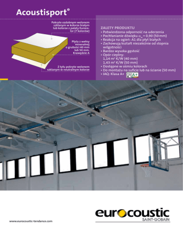 Acoustisport® Pokryte ozdobnym welonem szklanym w kolorze białym lub kolorze z palety Eurocolor (7 kolorów) Płyta z wełny mineralnej o grubości 40 mm lub 50 mm. Krawędzie A Z tyłu pokryte welonem szklanym w neutralnym kolorze ZALETY PRODUKTU • Potwierdzona odporność na uderzenia • Pochłanianie dźwięku αw = 0,90 (50 mm) •R eakcja na ogień: A1 dla płyt białych •Z achowują kształt niezależnie od stopnia wilgotności •B ardzo wysoka gęstość •O pór cieplny: 1,14 m² K/W (40 mm) 1,43 m² K/W (50 mm) •D ostępne w ośmiu kolorach •D o montażu na suficie lub na ścianie (50 mm) • I AQ: Klasa A+ EMISJA WEWNĄTRZ POMIESZCZEŃ* www.eurocoustic-tendance.com Biały 06 EC02 EC07 EuroTournesol EuroPomme EC16 EuroAzur EC27 EuroBruyère EC28 EuroFraise Acoustisport® > Sztywna płyta samonośna z wełny mineralnej. > Wzmocnione z tyłu welonem szklanym w neutralnym kolorze. > Przeznaczone do osadzania na ramach T24 lub T35. EC45 EuroPerle kotwórczych (zgodnie z Rozporządzeniem Parlamentu Europejskiego i Rady (WE) nr 1272/2008 zmienionym Rozporządzeniem 790/2009). Według Międzynarodowej Agencji Badań nad Rakiem, wełny mineralnej nie można zaklasyfikować ze względu na działanie rakotwórcze na człowieka (grupa 3). Jakość powietrza wewnątrz pomieszczeń • Przegrody akustyczne z serii Acoustisport® charakteryzują się klasą A+ dotycząca jakości powietrza wewnątrz pomieszczeń. EMISJA WEWNĄTRZ POMIESZCZEŃ* Pochłanianie dźwięku 1,0 0,8 0,6 0,4 0,2 0 125 250 n 40 mm αw = 0,85 H: klasa B 500 1000 2000 n 50 mm αw = 0,90: klasa A 4000 Hz Odbicie światła • Dla płyt białych współczynnik odbicia światła przekracza 85%. eakcja na ogień R Zgodnie z normą EN 13501-1: • Euroklasa A1 dla płyt białych. •E uroklasa A2-s1, d0 dla płyt kolorowych. Odporność ogniowa Przegrody akustyczne Acoustisport® (1200 x 600 mm) na ramie T24 (patrz karta danych technicznych) wykazują odporność ogniową SF 30 według normy NBN 713-020. Odporność na wilgoć • Zachowują kształt niezależnie od stopnia wilgotności. znakowanie CE O • Nr DOP: 0007-01 dla płyt białych oraz 0007-03 dla płyt kolorowych. Odporność na uderzenia Próba CRIR: • Przegrody akustyczne: Próba uderzenia miękkim przedmiotem zgodnie z normą NFT 08302 ; piłka o masie 5 kg: uderzenia nie powodują powstania uszkodzeń. • Ściany: należy chronić płyty. Opór cieplny Przegrody akustyczne Acoustisport® charakteryzują się następującym oporem cieplnym: Grubości Opór cieplny 40 mm R= 1,14 m2 K/W 50 mm R= 1,43 m2 K/W Wpływ na zdrowie i środowisko Środowisko • Wyroby z wełny mineralnej można poddawać recyklingowi, a odpady produkcyjne są w większości przypadków ponownie używane. • W przypadku zastosowań zgodnych z normą HQE (francuska norma dotycząca standardów środowiskowych wysokiej jakości) można skorzystać z kart charakterystyki dostępnych na stronie www.inies.fr. • Eurocoustic posiada certyfikat ISO 14001 : 2004, dotyczący zarządzania środowiskiem. Zdrowie • Płyty z wełny mineralnej wytwarzane są z włókien wyłączonych z klasyfikacji dotyczącej substancji ra- Montaż Przegrody akustyczne • Należy postępować zgodnie z zaleceniami ujednoliconej dokumentacji technicznej (UDT) 58.1 zawartymi w normie NFP 68203-1 i 2 oraz innymi lokalnie obowiązującymi UDT. • Płyty Acoustisport® są sztywnymi płytami, które można łatwo obrabiać i przycinać nożykiem oraz montować na ramie T24 lub T35. • Płyty są podtrzymywane z czterech stron i zabezpieczone w odpowiedni sposób przed podnoszeniem się. • Zaleca się zapewnienie cyrkulacji powietrza pomiędzy płytami a plenum, tak aby móc wyrównać temperaturę i ciśnienie po obu stronach podwieszonego sufitu. Ściany • Grubość: 50 mm • Minimalna wysokość: Dwa metry nad podłożem • Profile nośne należy rozmieścić równolegle, co 1500 mm i zamontować na ścianie za pomocą odpowiednich mocowań. Co 1000 mm należy umieścić pod kątem prostym profil poprzeczny o długości 1500 mm. •N ie zaleca się montażu płyt l’Acoustisport® na ścianach narażonych na częste uderzenia (na przykład za bramką do piłki ręcznej). Konserwacja • Przegrody akustyczne Acoustisport® można czyścić miękką szczotką lub odkurzaczem, dzięki czemu wydłuża się ich trwałość. Podsumowanie Kolorystyka Biały (06) / EuroTournesol (EC02) / EuroPomme (EC07) EuroAzur (EC16) / EuroBruyère (EC27)/ EuroFraise (EC28) / EuroNoir (EC43) / EuroPerle (EC45) Krawędź Ramy Wymiary modułów (w mm) Szerokość 600 Długość 1200 Grubość 40 Opakowanie 10 Płyt/paczka 2 m /paczka 7,20 Paczka/paleta 12 Klasa serwisowa B  A T24 – T35 1000 1500 50 4 6 12 B Wszystkie paczki Eurocoustic są zabezpieczone folią termokurczliwą. Palety są opakowane w folię i należy je przechowywać pod zadaszeniem. 03/2014 – Saint-Gobain Eurocoustic - spółka akcyjna z kapitałem o wysokości 4 000 000 euro – 307 390 104 RCS GUERET – Siedziba: ZI Bellevue, 23350 Genouillac, France α EC43 EuroNoir odporność na uderzenia