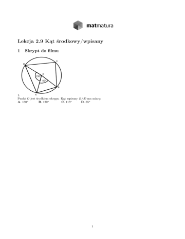 Lekcja 2.9 Kąt środkowy/wpisany 1 Skrypt do filmu 1. Punkt O jest środkiem okręgu. Kąt wpisany BAD ma miarę: A. 150o B. 120o C. 115o D. 85o 1 2. Punkty A, B i C leżą na okręgu o środku S (zobacz rysunek). Miara zaznaczonego kąta wpisanego ACB jest równa : A. 65o B. 100o C. 115o D. 130o 3. Kąt środkowy i kąt wpisany są oparte na tym samym łuku. Suma ich miar jest równa 180o . Jaka jest miara kąta środkowego? A. 60o B. 90o C. 120o D. 135o 2 2 Zadania do samodzielnego opracowania 1. Wiedząc, że α = 45◦ , miara kąta β to A. 270◦ B. 315◦ C. 225◦ D. 305◦ 2. Wiedząc, że kąt wpisany BAD ma miarę 120◦ , kąt α ma miarę A. 240◦ B. 260◦ C. 220◦ D. 250◦ 3