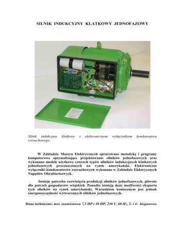 SILNIK INDUKCYJNY KLATKOWY JEDNOFAZOWY Silnik indukcyjny rozruchowego. klatkowy z elektronicznym wyłącznikiem kondensatora W Zakładzie Maszyn Elektrycznych opracowano metodykę i programy komputerowe optymalizujące projektowanie silników jednofazowych oraz wykonano modele uŜytkowe czterech typów silników indukcyjnych klatkowych jednofazowych przeznaczonych na rynek amerykański. Elektroniczne wyłączniki kondensatorów rozruchowych wykonano w Zakładzie Elektrycznych Napędów Obrabiarkowych. Istnieje potrzeba rozwinięcia produkcji silników jednofazowych, głównie dla potrzeb gospodarstw wiejskich. Ponadto istnieją duŜe moŜliwości eksportu tych silników na rynek amerykański. Warunkiem koniecznym jest jednak energooszczędność wytwarzanych silników jednofazowych. Dane techniczne: moc znamionowa 7,5 HP i 10 HP, 230 V, 60 Hz, 2- i 4- biegunowe.