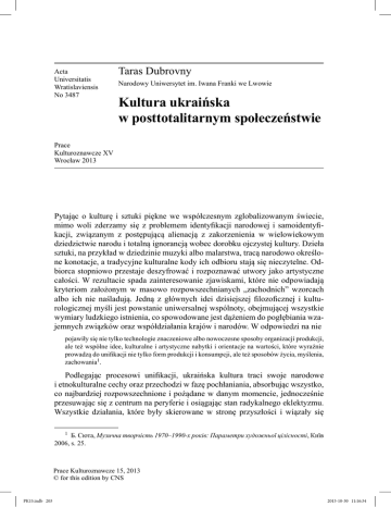 Acta Universitatis Wratislaviensis No 3487 Taras Dubrovny Narodowy Uniwersytet im. Iwana Franki we Lwowie Kultura ukraińska w posttotalitarnym społeczeństwie Prace Kulturoznawcze XV Wrocław 2013 Pytając o kulturę i sztuki piękne we współczesnym zglobalizowanym świecie, mimo woli zderzamy się z problemem identyfikacji narodowej i samoidentyfikacji, związanym z postępującą alienacją z zakorzenienia w wielowiekowym dziedzictwie narodu i totalną ignorancją wobec dorobku ojczystej kultury. Dzieła sztuki, na przykład w dziedzinie muzyki albo malarstwa, tracą narodowo określone konotacje, a tradycyjne kulturalne kody ich odbioru stają się nieczytelne. Odbiorca stopniowo przestaje deszyfrować i rozpoznawać utwory jako artystyczne całości. W rezultacie spada zainteresowanie zjawiskami, które nie odpowiadają kryteriom założonym w masowo rozpowszechnianych „zachodnich” wzorcach albo ich nie naśladują. Jedną z głównych idei dzisiejszej filozoficznej i kulturologicznej myśli jest powstanie uniwersalnej wspólnoty, obejmującej wszystkie wymiary ludzkiego istnienia, co spowodowane jest dążeniem do pogłębiania wzajemnych związków oraz współdziałania krajów i narodów. W odpowiedzi na nie pojawiły się nie tylko technologie znaczeniowe albo nowoczesne sposoby organizacji produkcji, ale też wspólne idee, kulturalne i artystyczne nabytki i orientacje na wartości, które wyraźnie prowadzą do unifikacji nie tylko form produkcji i konsumpcji, ale też sposobów życia, myślenia, zachowania1. Podlegając procesowi unifikacji, ukraińska kultura traci swoje narodowe i etnokulturalne cechy oraz przechodzi w fazę pochłaniania, absorbując wszystko, co najbardziej rozpowszechnione i pożądane w danym momencie, jednocześnie przesuwając się z centrum na peryferie i osiągając stan radykalnego eklektyzmu. Wszystkie działania, które były skierowane w stronę przyszłości i wiązały się 1 Б. Сюта, Музична творчість 1970–1990-х років: Параметри художньої цілісності, Київ 2006, s. 25. Prace Kulturoznawcze 15, 2013 © for this edition by CNS PK15.indb 203 2013-10-30 11:16:34 204 Taras Dubrovny z rozwojowymi projektami dotyczącymi świadomości artystycznej, opinii publicznej czy samej kultury, teraz zastępuje naśladownictwo „zachodniej” sztuki. Bez przymusu, przy użyciu populistycznych środków, sprowadza to rodzimą, ukraińską kulturę do statusu erzacu czy namiastki (mimo oryginalnego i imponującego narodowo-etnicznego dziedzictwa w dziedzinie folkloru, sztuki stosowanej itp.). Wygląda na to, że kultura narodowa, poruszając się po dialektycznej spirali, przebywa ponownie przeżyte kiedyś własne stadia, zmieniając tylko, stosownie do wymogów czasu, swoją semantykę. Kultura-surogat jako produkt masowego społeczeństwa pojawiła się już wcześniej w historii Ukrainy w okresie politycznego totalitaryzmu, z konstytutywną dla niej zasadą konformizmu, popieraniem i akceptacją wyłącznie tych dzieł, które odpowiadały dominującej, oficjalnie uznawanej za artystyczną metodzie realizmu socjalistycznego. Rosyjski badacz Wsiewołod Zadierackij zauważa: reżim totalitarny na ogół dba o stworzenie erzac-kultury (która przeważnie niesie w sobie zestaw tradycyjnych składników, zmieniając jedynie ich semantykę i funkcje)2. Warto zauważyć, że zasady określające funkcjonowanie tej kultury dziś właściwie się nie zmieniły, poza iluzorycznym wrażeniem artysty, że przedmiot jego pracy jest efektem osobistego wyboru. Jednak w rzeczywistości „mody” w warunkach rynkowych nie są kształtowane przez twórcę i odbiorcę, których zastępują bezosobowe mass media (na przykład Internet) w ustalaniu, co warte uwagi, a co nie, i co w tym sezonie będzie głównym przedmiotem konsumpcji. Jak słusznie zauważa jeden z wybitniejszych literatów współczesnej Ukrainy Andrij Sodomora: dzisiaj dominują tendencje do depersonalizacji. Nasza epoka jest epoką wielkich rozstań — z piosenką, z piórem, długopisem i w rezultacie — z samym sobą3. Żeby stać się popularnym, oficjalnie uznanym, przetrwać w rywalizacji na rynku sztuki, artysta już bez przymusu, z własnej woli korzysta z przyjętych i traktowanych jako wzorcowe stylów i gatunków. Zatem w konsekwencji stosunkowo rzadko pojawiają się oryginalne dzieła i niezależni artyści, a ich twórczość adresowana jest do nielicznej, elitarnej grupy wielbicieli „wysokiej” sztuki i przeważnie w ogóle nie odwołuje się do szerszej publiczności. Zarówno w pierwszym, jak i w drugim przypadku odbiorca-słuchacz odnosi wrażenie udziału w tym, co już znane i doświadczone. Jest przekonany, że słyszał już tę muzykę, choć nie potrafi rozpoznać utworu i okoliczności jego wykonania. To odczucie jest nieweryfikowalne, ponieważ oznacza zetknięcie się z typowym dla postmodernizmu zjawiskiem stylizacji i adaptacji najbardziej typowych formuł i gatunków, podczas gdy autor rozpaczliwie balansuje na krawędzi autentyczności, stale grzęznąc w labiryntach konwencjonalnej gry. 2 В. Задерацкий, Семантическое поле музыки в прошлом и настоящем, [w:] Проблемы национальнх культур на рубеже третьего тысячелетия, Минск 1999, s. 11. 3 Na spotkaniu na lwowskim uniwersytecie wiosną 2012 roku. Prace Kulturoznawcze 15, 2013 © for this edition by CNS PK15.indb 204 2013-10-30 11:16:34 Kultura ukraińska w posttotalitarnym społeczeństwie 205 W niniejszym tekście podejmuję próbę sprecyzowania współczesnych problemów, związanych z określeniem sposobu pojmowania narodowej kultury ukraińskiej — jej tradycji (w tym kształtowania się narodowego języka muzycznego), struktury i funkcji, a także szczególnych form, w jakich przejawiała się w różnych historycznych okresach swojego istn