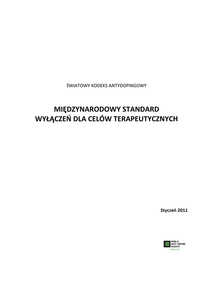 ŚWIATOWY KODEKS ANTYDOPINGOWY MIĘDZYNARODOWY STANDARD WYŁĄCZEŃ DLA CELÓW TERAPEUTYCZNYCH Styczeń 2011 Międzynarodowy Standard Wyłączeń dla Celów Terapeutycznych Międzynarodowy Standard Wyłączeń dla Celów Terapeutycznych został przyjęty po raz pierwszy w roku 2004 i wszedł w życie w roku 2005. Poniższy dokument jest wersją 5.0 Standardu i zawiera poprawki do Międzynarodowego Standardu Wyłączeń dla Celów Terapeutycznych przyjęte przez Komitet Wykonawczy Światowej Agencji Antydopingowej 18 września 2010 r. Zmieniony Międzynarodowy Standard Wyłączeń dla Celów Terapeutycznych obowiązuje od 1 stycznia 2011 r. Opublikowany 1 października 2010 r. przez: World Anti-Doping Agency Stock Exchange Tower 800 Place Victoria (Suite 1700) PO Box 120 Montreal, Quebec Canada H4Z 1B7 URL: www.wada-ama.org Tel.: +1 514 904 9232 Faks: +1 514 904 8650 E-mail: [email protected] Międzynarodowy Standard Wyłączeń dla Celów Terapeutycznych Styczeń 2011 r. 2 PREAMBUŁA Międzynarodowy Standard Wyłączeń dla Celów Terapeutycznych Światowego Kodeksu Antydopingowego (TUE) jest międzynarodowym standardem szczebla 2 opracowanym w ramach Światowego Programu Zwalczania Dopingu. Tekst oficjalny Międzynarodowego Standardu Wyłączeń dla Celów Terapeutycznych znajduje się w WADA i został opublikowany w języku angielskim i francuskim. W razie jakiejkolwiek sprzeczności między wersją angielską i francuską, wersją obowiązującą jest wersja w języku angielskim. Międzynarodowy Standard TUE (wersja 5.0) wchodzi w życie 1 stycznia 2011 r. Międzynarodowy Standard Wyłączeń dla Celów Terapeutycznych Styczeń 2011 r. 3 SPIS TREŚCI CZĘŚĆ PIERWSZA: WSTĘP, POSTANOWIENIA KODEKSU I DEFINICJE 5 1.0 Wstęp i zakres 5 2.0 Postanowienia Kodeksu 6 3.0 Pojęcia i definicje 8 CZĘŚĆ DRUGA: STANDARDY UDZIELANIA WYŁĄCZEŃ NA STOSOWANIE SUBSTANCJI I METOD ZABRONIONYCH DLA CELÓW TERAPEUTYCZNYCH 13 4.0 Kryteria udzielania wyłączeń dla celów terapeutycznych 13 5.0 Poufność informacji 14 6.0 Komisje ds. Wyłączeń dla Celów Terapeutycznych (TUEC) 15 7.0 Obowiązki federacji międzynarodowych i krajowych organizacji antydopingowych 15 8.0 Proces wnioskowania o wyłączenia dla celów terapeutycznych 17 9.0 Deklaracja używania 18 10.0 Ocena decyzji TUE przez WADA 19 11.0 Wcześniejsze przyznane skrócone wyłączenia dla celów terapeutycznych (ATUE) 19 ANEKS 1 Międzynarodowy Standard Wyłączeń dla Celów Terapeutycznych Styczeń 2011 r. 20 4 CZĘŚĆ PIERWSZA: WSTĘP, POSTANOWIENIA KODEKSU I DEFINICJE 1.0 Wstęp i zakres Zasadniczym celem Międzynarodowego Standardu Wyłączeń dla Celów Terapeutycznych (TUE) jest zharmonizowanie procesu udzielania zgody na stosowanie substancji i metod zabronionych dla celów terapeutycznych we wszystkich sportach i we wszystkich krajach. Kodeks zezwala sportowcom i ich lekarzom na stosowanie wyłączeń dla celów terapeutycznych, tzn. używanie, dla celów terapeutycznych, substancji zabronionych i metod zabronionych, których używanie jest w innych sytuacjach zabronione. Międzynarodowy Standard TUE zawiera kryteria udzielania zgody na wyłączenia dla celów terapeutycznych, poufności informacji, tworzenia Komisji ds. Wyłączeń dla Celów Terapeutycznych oraz procesu stosowania TUE. Niniejszy standard stosuje się do wszystkich sportowców zdefiniowanych przez i podlegających Kodeksowi, tzn. sportowców pełnosprawnych oraz sportowców z upośledzeniami. [Komentarz: Niniejszy Standard stosuje się indywidualnie do danego sportowca, w zależności od okoliczności. Na przykład, wyłączenie, które jest stosowane wobec sportowca upośledzonego może nie mieć zastosowania do innych sportowców]. Światowy Program Zwalczania Dopingu obejmuje wszystkie elementy niezbędne do zapewnienia optymalnej harmonizacji i najlepszych praktyk w międzynarodowych i krajowych programach zwalczania dopingu. Do głównych elementów tych programów należą Kodeks (Szczebel 1), standardy międzynarodowe (Szczebel 2) oraz Modele Najlepszych Praktyk (Szczebel 3). We wstępie do Kodeksu cele i wdrożenie międzynarodowych standardów opisano w następujący sposób: „Standardy międzynarodowe dotyczące różnych obszarów technicznych i operacyjnych w programie zwalczania dopingu są opracowywane w porozumieniu z sygnatariuszami i rządami oraz zatwierdzane przez WADA. Celem standardów międzynarodowych jest zharmonizowanie działań prowadzonych przez organizacje antydopingowe odpowiedzialne za konkretne techniczne i operacyjne części programów zwalczania dopingu. Zgodnie z Kodeksem, przestrzeganie standardów międzynarodowych jest obowiązkowe. Standardy międzynarodowe mogą być okresowo poprawiane przez Komitet Wykonawczy WADA po uzasadnionych konsultacjach z sygnatariuszami i rządami. Jeśli w Kodeksie nie postanowiono inaczej, standardy międzynarodowe oraz wszystkie poprawki wchodzą w życie w dniu podanym w standardzie międzynarodowym lub poprawce.”. Zgodność ze standardem międzynarodowym (w przeciwieństwie do innego alternatywnego standardu, praktyki lub procedury) wystarcza do stwierdzenia, że procedury objęte standardem międzynarodowym zostały wykonane poprawnie. Pojęcia zdefiniowane w Kodeksie zostały napisane kursywą. Pojęcia, które definiowane są tylko w niniejszym Międzynarodowym Standardzie TUE, zostały podkreślone. Międzynarodowy Standard Wyłączeń dla Celów Terapeutycznych Styczeń 2011 r. 5 2.0 Postanowienia Kodeksu Poniższe artykuły w Kodeksie 2009 bezpośrednio dotyczą międzynarodowego standardu TUE: Artykuł 4.4 Kodeksu: Użycie terapeutyczne WADA przyjęła standard międzynarodowy określający zasady, na jakich stosowane są wyłączenia od zakazu używania substancji i metod zabronionych z przyczyn terapeutycznych. Każda federacja międzynarodowa jest odpowiedzialna za wdrożenie zasad wyłączeń od zakazu używania substancji i metod zabronionych w stosunku do sportowców 