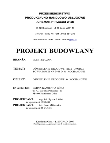 PRZEDSIĘBIORSTWO PRODUKCYJNO-HANDLOWO-USŁUGOWE „CHEMAR-I” Ryszard Wiatr 58-420 Lubawka , ul. 40 Lecia WOP 13 Tel/ Fax : (075) 7411216 , 0605 554 232 NIP: 614-120-79-99 email: [email protected] PROJEKT BUDOWLANY BRANŻA: ELEKTRYCZNA TEMAT: OŚWIETLENIE DROGOWE PRZY DRODZE POWIATOWEJ NR 3468 D W KOCHANOWIE OBIEKT: OŚWIETLENIE DROGOWE W KOCHANOWIE INWESTOR: GMINA KAMIENNA GÓRA ul. Al. Wojska Polskiego 10 58-400 Kamienna Góra PROJEKTANT: mgr inż. Ryszard Wiatr nr uprawnień 10/98/JG PROJEKTANT: inż. Leon Miśkowicz nr uprawnień 24 24/93/E Kamienna Góra – LISTOPAD 2009 Projekt posiada ........ponumerowanych na odwrocie stron. SPIS TREŚCI STRONA TYTUŁOWA I ZAŁĄCZNIKI strony od……….do……… Opinia ZUDP Nr 174/2009 z dnia 03.12.2009. Decyzja ustalająca lokalizację inwestycji celu publicznego Warunki przyłączenia podmiotu do sieci elektroenergetycznej 2009/814 z dnia 2009.07.27. Warunki przyłączenia podmiotu do sieci elektroenergetycznej 2009/815 z dnia 2009.07.27. Uzgodnienie z EnergiaPro Koncern Energetyczny SA Rejon Energetyczny Jelenia Góra Uzgodnienie z Telekomunikacją Polską S.A. Nr 59275/09 z dnia 03.12.2009. Uzgodnienie z Powiatowym Wydziałem Komunikacji i Drogownictwa Wykaz właścicieli i władających Mapa ewidencji gruntów skala 1:5000 Mapa zasadnicza skala 1:1000 II CZĘŚĆ OPISOWA strony od……….do……… OPINIA ZUDP NR 174/2009 Z DNIA 03.12.2009..........................................2 DECYZJA USTALAJĄCA LOKALIZACJĘ INWESTYCJI CELU PUBLICZNEGO ................................................................................................2 WARUNKI PRZYŁĄCZENIA PODMIOTU DO SIECI ELEKTROENERGETYCZNEJ 2009/814 Z DNIA 2009.07.27......................2 WARUNKI PRZYŁĄCZENIA PODMIOTU DO SIECI ELEKTROENERGETYCZNEJ 2009/815 Z DNIA 2009.07.27......................2 WYKAZ WŁAŚCICIELI I WŁADAJĄCYCH...............................................2 PLAN SYTUACYJNY OŚWIETLENIA DROGOWEGO – RYS. NR E-1. .3 PLAN SYTUACYJNY OŚWIETLENIA DROGOWEGO – RYS. NR E-2A3 PLAN SYTUACYJNY OŚWIETLENIA DROGOWEGO – RYS. NR E-2B3 SCHEMAT JEDNOKRESKOWY SZAFKI OŚWIETLENIA DROGOWEGO SO-1 SO-2 RYS. E-3...............................................................3 KARTY KATALOGOWE ................................................................................3 1. WSTĘP.............................................................................................................4 PODSTAWA OPRACOWANIA...........................................................................................4 ZAKRES OPRACOWANIA...............................................................................................4 ZAŁOŻENIA I MATERIAŁY.............................................................................................4 OPIS TECHNICZNY.........................................................................................4 2.1 LINIA NISKIEGO NAPIĘCIA ZASILAJĄCA OŚWIETLENIE DROGOWE....................................4 2.6 INSTALACJA OCHRONY PRZED PRZEPIĘCIAMI..............................................................8 2.7 INSTALACJE OCHRONNE.........................................................................................8 3. INFORMACJA DO PLANU BEZPIECZEŃSTWA I OCHRONY ZDROWIA III CZĘŚĆ RYSUNKOWA Plan sytuacyjny oświetlenia drogowego – rys. nr E-1 Plan sytuacyjny oświetlenia drogowego – rys. nr E-2a Plan sytuacyjny oświetlenia drogowego – rys. nr E-2b Schemat jednokreskowy szafki oświetlenia drogowego SO-1 SO-2 rys. E-3 Karty katalogowe strony od……….do……… 1. WSTĘP Podstawa opracowania Niniejszy projekt został opracowany na zlecenie Gminy Kamienna Góra ul. Aleja Wojska Polskiego 10 58-400 Kamienna Góra. Zakres opracowania Zakresem opracowania jest projekt oświetlenia drogowego drogi powiatowej Nr 3468 D dz. nr 233, 248/5, 260/2, 222/1, 220/2, 220/1, 257, 369, 384. w Kochanowie. Założenia i materiały Za podstawę do opracowania projektu posłużyły materiały: - Mapa terenu - Obowiązujące przepisy budowlane - Normy PN/E - Katalogi branżowe urządzeń elektrycznych - Uzgodnienia z inwestorem - Wizja lokalna w terenie - Uzgodnienia robocze OPIS TECHNICZNY 2.1 Linia niskiego napięcia zasilająca oświetlenie drogowe Zgodnie z określonymi przez inwestora założeniami zaprojektowano cztery obwody oświetlenia drogowego. Zasilanie projektowanego oświetlenia drogowego w miejscowości Kochanów będzie: obwody Nr 1 i Nr 2 ze słupa linii napowietrznej nn EnergiaPro S.A. przy budynku nr 20 i szafki pomiarowej oraz oświetleniowej SO-1 zabudowanej obok słupa zgodnie z warunkami przyłączenia znak 2009/814 z dnia 2009.07.27. wydanymi przez EnergiaPro S.A. Oddział w Jeleniej Górze Rejon Energetyczny Jelenia Góra. Obwody Nr 3 i Nr 4 ze słupa linii napowietrznej nn EnergiaPro S.A. przy budynku nr 62 i szafki pomiarowej oraz oświetleniowej SO-2 zabudowanej przy słupie linii napowietrznej nn w pobliżu budynku Nr 62 zgodnie z warunkami przyłączenia znak 2009/815 z dnia 2009.07.24 wydanymi przez EnergiaPro S.A. Oddział w Jeleniej Górze Rejon Energetyczny Jelenia Góra. Z szafki oświetlenia drogowego SO-1 zasilane będą obwody Nr 1 i Nr 2 oświetlenia drogowego wykonane kablem ASxSn 4 x 35 mm 2 i YKY 5 x 16 mm 2. Z szafki oświetlenia drogowego SO-2 zasilane będą obwody Nr 3 i Nr 4 oświetlenia drogowego wykonane kablem ASxSn 4 x 35 mm 2 i YKY 5 x 16 mm 2. Odległość lica słupa oświetleniowego nie powinna być mniejsza niż 0,8 m od krawędzi jezdni i większa niż 3,5 m od krawędzi jezdni. Do oświetlenia proponuje się zastosować betonowe zbrojone słupy oświetleniowe Typu ŻN-10/200 10 m . Roboty ziemne będą wykonywane bez ograniczeń i wstrzymywania ruchu na drodze. Trasę projektowanego oświetlenia drogowego pokazano na załączonych rysunkach rys. Nr E-1, E-2a i E-2b. 2.1.1 Obliczenie i dobór kabli linii oświetlenia drogowego Do szafki oświetleniowej SO-1 i SO-2 dobiera się kabel uk