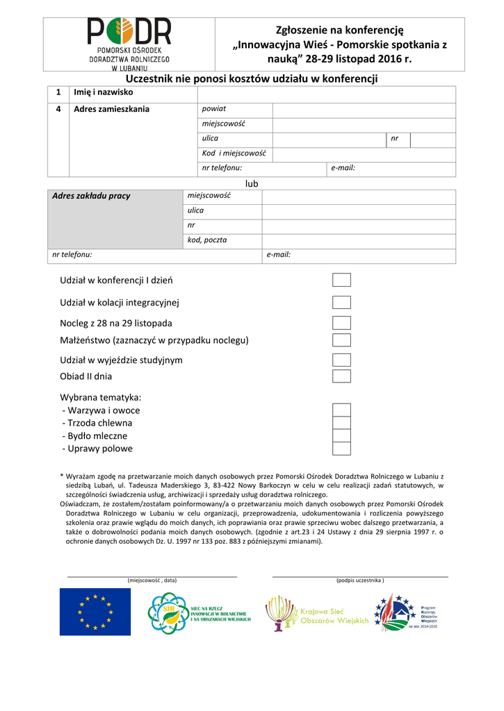 Zgłoszenie na konferencję „Innowacyjna Wieś - Pomorskie spotkania z nauką” 28-29 listopad 2016 r. Uczestnik nie ponosi kosztów udziału w konferencji 1 Imię i nazwisko 4 Adres zamieszkania powiat miejscowość ulica nr Kod i miejscowość nr telefonu: e-mail: lub Adres zakładu pracy miejscowość ulica nr kod, poczta nr telefonu: e-mail: Udział w konferencji I dzień Udział w kolacji integracyjnej Nocleg z 28 na 29 listopada Małżeństwo (zaznaczyć w przypadku noclegu) Udział w wyjeździe studyjnym Obiad II dnia Wybrana tematyka: - Warzywa i owoce - Trzoda chlewna - Bydło mleczne - Uprawy polowe * Wyrażam zgodę na przetwarzanie moich danych osobowych przez Pomorski Ośrodek Doradztwa Rolniczego w Lubaniu z siedzibą Lubań, ul. Tadeusza Maderskiego 3, 83-422 Nowy Barkoczyn w celu w celu realizacji zadań statutowych, w szczególności świadczenia usług, archiwizacji i sprzedaży usług doradztwa rolniczego. Oświadczam, że zostałem/zostałam poinformowany/a o przetwarzaniu moich danych osobowych przez Pomorski Ośrodek Doradztwa Rolniczego w Lubaniu w celu organizacji, przeprowadzenia, udokumentowania i rozliczenia powyższego szkolenia oraz prawie wglądu do moich danych, ich poprawiania oraz prawie sprzeciwu wobec dalszego przetwarzania, a także o dobrowolności podania moich danych osobowych. (zgodnie z art.23 i 24 Ustawy z dnia 29 sierpnia 1997 r. o ochronie danych osobowych Dz. U. 1997 nr 133 poz. 883 z późniejszymi zmianami). (miejscowość , data) (podpis uczestnika )
