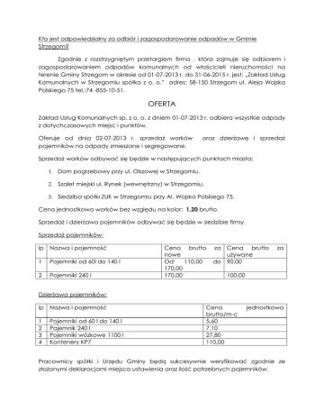Kto jest odpowiedzialny za odbiór i zagospodarowanie odpadów w Gminie Strzegom? Zgodnie z rozstrzygniętym przetargiem firma , która zajmuje się odbiorem i zagospodarowaniem odpadów komunalnych od właścicieli nieruchomości na terenie Gminy Strzegom w okresie od 01-07-2013 r. do 31-06-2015 r. jest: „Zakład Usług Komunalnych w Strzegomiu spółka z o. o.” adres: 58-150 Strzegom ul. Aleja Wojska Polskiego 75 tel.:74 -855-10-51. OFERTA Zakład Usług Komunalnych sp. z o. o. z dniem 01-07-2013 r. odbiera wszystkie odpady z dotychczasowych miejsc i punktów. Oferuje od dnia 02-07-2013 r. sprzedaż worków pojemników na odpady zmieszane i segregowane. oraz dzierżawę i sprzedaż Sprzedaż worków odbywać się będzie w następujących punktach miasta: 1. Dom pogrzebowy przy ul. Olszowej w Strzegomiu, 2. Szalet miejski ul. Rynek (wewnętrzny) w Strzegomiu, 3. Siedziba spółki ZUK w Strzegomiu przy Al. Wojska Polskiego 75. Cena jednostkowa worków bez względu na kolor: 1,20 brutto. Sprzedaż i dzierżawa pojemników odbywać się będzie w siedzibie firmy. Sprzedaż pojemników: lp Nazwa i pojemność 1 Pojemniki od 60l do 140 l 2 Pojemniki 240 l Cena brutto nowe Od 110,00 170,00 170,00 za Cena brutto używane do 90,00 za 100,00 Dzierżawa pojemników: lp Nazwa i pojemność 1 2 3 4 Pojemniki od 60 l do 140 l Pojemnik 240 l Pojemniki wózkowe 1100 l Kontenery KP7 Cena brutto/m-c 5,60 7,10 27,80 110,00 jednostkowa Pracownicy spółki i Urzędu Gminy będą sukcesywnie weryfikować zgodnie ze złożonymi deklaracjami miejsca ustawienia oraz ilość potrzebnych pojemników. Obowiązujące oznakowanie na workach i pojemnikach ( wzór w załączeniu).