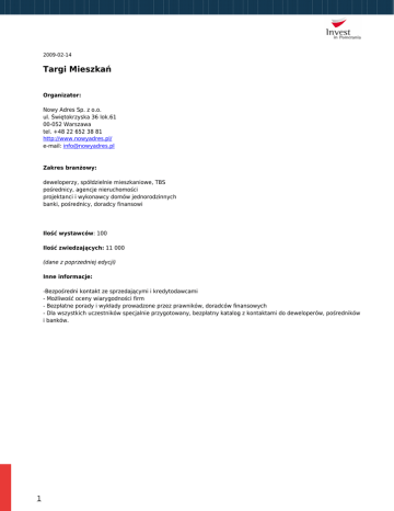 2009-02-14 Targi Mieszkań Organizator: Nowy Adres Sp. z o.o. ul. Świętokrzyska 36 lok.61 00-052 Warszawa tel. +48 22 652 38 81 http://www.nowyadres.pl/ e-mail: [email protected] Zakres branżowy: deweloperzy, spółdzielnie mieszkaniowe, TBS pośrednicy, agencje nieruchomości projektanci i wykonawcy domów jednorodzinnych banki, pośrednicy, doradcy finansowi Ilość wystawców: 100 Ilość zwiedzających: 11 000 (dane z poprzedniej edycji) Inne informacje: -Bezpośredni kontakt ze sprzedającymi i kredytodawcami - Możliwość oceny wiarygodności firm - Bezpłatne porady i wykłady prowadzone przez prawników, doradców finansowych - Dla wszystkich uczestników specjalnie przygotowany, bezpłatny katalog z kontaktami do deweloperów, pośredników i banków. 1