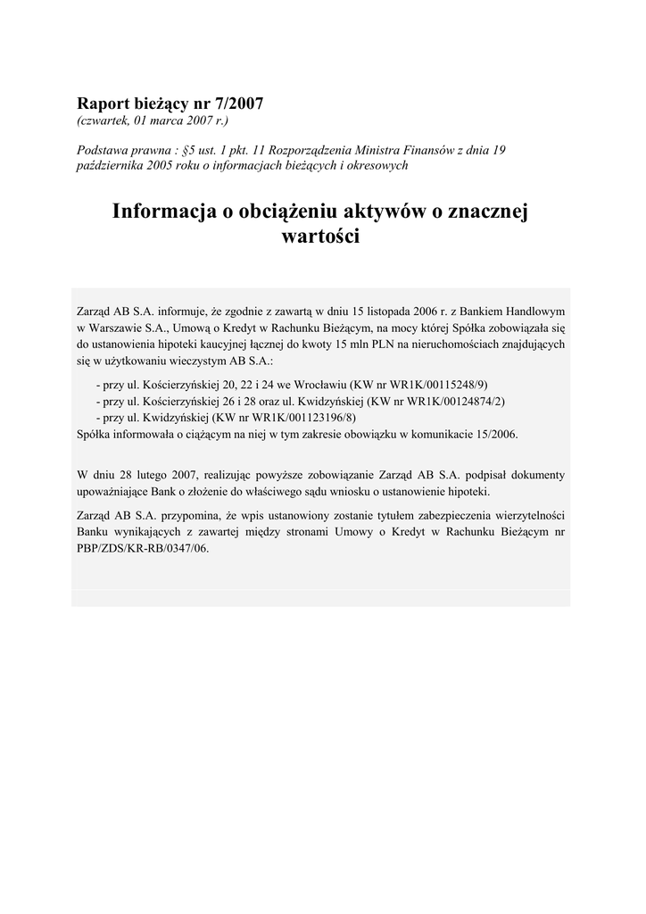 Raport bieŜący nr 7/2007 (czwartek, 01 marca 2007 r.) Podstawa prawna : §5 ust. 1 pkt. 11 Rozporządzenia Ministra Finansów z dnia 19 października 2005 roku o informacjach bieŜących i okresowych Informacja o obciąŜeniu aktywów o znacznej wartości Zarząd AB S.A. informuje, Ŝe zgodnie z zawartą w dniu 15 listopada 2006 r. z Bankiem Handlowym w Warszawie S.A., Umową o Kredyt w Rachunku BieŜącym, na mocy której Spółka zobowiązała się do ustanowienia hipoteki kaucyjnej łącznej do kwoty 15 mln PLN na nieruchomościach znajdujących się w uŜytkowaniu wieczystym AB S.A.: - przy ul. Kościerzyńskiej 20, 22 i 24 we Wrocławiu (KW nr WR1K/00115248/9) - przy ul. Kościerzyńskiej 26 i 28 oraz ul. Kwidzyńskiej (KW nr WR1K/00124874/2) - przy ul. Kwidzyńskiej (KW nr WR1K/001123196/8) Spółka informowała o ciąŜącym na niej w tym zakresie obowiązku w komunikacie 15/2006. W dniu 28 lutego 2007, realizując powyŜsze zobowiązanie Zarząd AB S.A. podpisał dokumenty upowaŜniające Bank o złoŜenie do właściwego sądu wniosku o ustanowienie hipoteki. Zarząd AB S.A. przypomina, Ŝe wpis ustanowiony zostanie tytułem zabezpieczenia wierzytelności Banku wynikających z zawartej między stronami Umowy o Kredyt w Rachunku BieŜącym nr PBP/ZDS/KR-RB/0347/06.