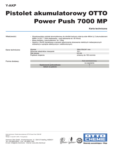 Y-AKP Pistolet akumulatorowy OTTO Power Push 7000 MP Karta techniczna Właściwości: - Wysokowydajny pistolet akumulatorowy do obróbki kartuszy side-by-side 490ml (z 2 akumulatorami NiMH (14,4V / 1,4Ah) iładowarką - czas ładowania ok. 50 minut) - Masa pistoletu z akumulatorem: ok. 3,9kg - Zgodny z RoHS (dyrektywą w sprawie ograniczenia stosowania niektórych niebezpiecznych substancji w sprzęcie elektrycznym i elektronicznym) Dane techniczne: Wymiar Stosunek składników mieszanki Siła osiowa Prędkość drążenia Forma dostawy: Opakowanie jednostkowe Sztuk na palecie Karta techniczna Pistolet akumulatorowy OTTO Power Push 7000 MP Strona 1 Wersja: 2 / 3pl (29.11.2016, 11:32 godzina) Hermann Otto GmbH · Krankenhausstr. 14 · 83413 Fridolfing, NIEMCY Tel.:+49 8684-908-0 · Fax: +49 8684-1260 E-mail: [email protected] · Internet: www.otto-chemie.pl 384x100x341 mm 10:1 6,5 kN zmienny do 150 mm/min Kod zamówieniowy na zapytanie 1 -