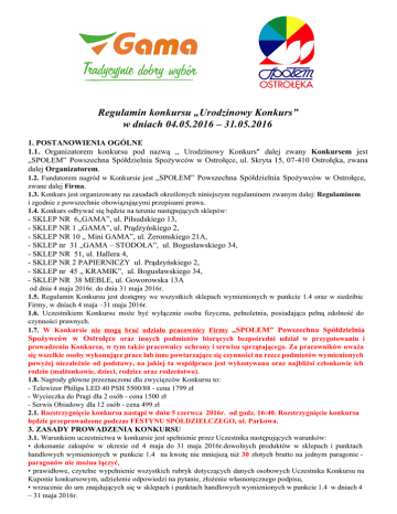 Regulamin konkursu „Urodzinowy Konkurs” w dniach 04.05.2016 – 31.05.2016 1. POSTANOWIENIA OGÓLNE 1.1. Organizatorem konkursu pod nazwą ,, Urodzinowy Konkurs" dalej zwany Konkursem jest „SPOŁEM” Powszechna Spółdzielnia Spożywców w Ostrołęce , ul. Skryta 15 , 07410 Ostrołęka , zwana dalej Organizatorem . 1.2. Fundatorem nagród w Konkursie jest „SPOŁEM” Powszechna Spółdzielnia Spożywców w Ostrołęce, zwane dalej Firma . 1.3. Konkurs jest organizowany na zasadach określonych niniejszym regulaminem zwanym dalej: Regulaminem i zgodnie z powszechnie obowiązującymi przepisami prawa. 1.4. Konkurs odbywać się będzie na terenie następujących sklepów: SKLEP NR 6„GAMA”, ul. Piłsudskiego 13, SKLEP NR 1 „GAMA”, ul. Prądzyńskiego 2, SKLEP NR 10 „ Mini GAMA”, ul. Żeromskiego 21A, SKLEP nr 31 „GAMA – STODOŁA”, ul. Bogusławskiego 34, SKLEP NR 51, ul. Hallera 4, SKLEP NR 2 PAPIERNICZY ul. Prądzyńskiego 2, SKLEP nr 45 „ KRAMIK”, ul. Bogusławskiego 34, SKLEP NR 38 MEBLE, ul. Goworowska 13A od dnia 4 maja 2016r. do dnia 31 maja 2016r. 1.5. Regulamin Konkursu jest dostępny we wszystkich sklepach wymienionych w punkcie 1.4 oraz w siedzibie Firmy, w dniach 4 maja –31 maja 2016r. 1.6. Uczestnikiem Konkursu może być wyłącznie osoba fizyczna, pełnoletnia, posiadająca pełną zdolność do czynności prawnych. 1.7. W Konkursie nie mogą brać udziału pracownicy Firmy „SPOŁEM” Powszechna Spółdzielnia Spożywców w Ostrołęce oraz innych podmiotów biorących bezpośredni udział w przygotowaniu i prowadzeniu Konkursu, w tym także pracownicy ochrony i serwisu sprzątającego. Za pracowników uważa się wszelkie osoby wykonujące prace lub inne powtarzające się czynności na rzecz podmiotów wymienionych powyżej niezależnie od podstawy, na jakiej ta współpraca jest wykonywana oraz najbliżsi członkowie ich rodzin (małżonkowie, dzieci, rodzice oraz rodzeństwo). 1.8. Nagrody główne przeznaczone dla zwycięzców Konkursu to: Telewizor Philips LED 40 PSH 5500/88 cena 1799 zł Wycieczka do Pragi dla 2 osób cena 1500 zł Serwis Obiadowy dla 12 osób cena 499 zł 2.1. Rozstrzygnięcie konkursu nastąpi w dniu 5 czerwca 2016r. od godz. 16:40. Rozstrzygnięcie konkursu będzie przeprowadzone podczas FESTYNU SPÓŁDZIELCZEGO, ul. Parkowa. 3. ZASADY PROWADZENIA KONKURSU 3.1. Warunkiem uczestnictwa w konkursie jest spełnienie przez Uczestnika następujących warunków: • dokonanie zakupów w okresie od 4 maja do 31 maja 2016r.dowolnych produktów w sklepach i punktach handlowych wymienionych w punkcie 1.4 na kwotę nie mniejszą niż 30 złotych brutto na jednym paragonie paragonów nie można łączyć , • prawidłowe, czytelne wypełnienie wszystkich rubryk dotyczących danych osobowych Uczestnika Konkursu na Kuponie konkursowym, udzielenie odpowiedzi na pytanie, złożenie własnoręcznego podpisu, • wrzucenie do urn znajdujących się w sklepach i punktach handlowych wymienionych w punkcie 1.4 w dniach 4 – 31 maja 2016r. ● Poprawnie wypełniony Kupon powinien zawierać czytelnie wpisane przez Uczestnika następujące informacje: imię i nazwisko, numer telefonu, numer i wartość paragonu, podpis pod zgodą na wykorzystanie i przetwarzanie swoich danych osobowych , a także prawidłową odpowiedź na zadane pytanie . Tylko tak wypełnione i podpisane Kupony uważa się za prawidłowe, ważne i uprawniające do wzięcia udziału w Konkursie. 3.2. Uczestnik może wrzucić do urny dowolną ilość Kuponów pod warunkiem spełnienia wymogów określonych w punkcie 3.1. tego Regulaminu. 3.3. Kupony konkursowe są dostępne w sklepach i punktach handlowych wymienionych w punkcie 1.4 podczas trwania Konkursu. 3.4. Warunkiem odbioru nagrody jest osobista obecność Uczestnika podczas ogłoszenia wyników lub obecność pełnoletniego przedstawiciela Uczestnika Konkursu posiadającego dowód osobisty osoby zwycięskiej. Za zwycięzcę może być uznana tylko ta osoba, której dane osobowe umieszczone są na kuponie. Zwycięzca zobowiązany jest do przedstawienia dowodu osobistego, potwierdzającego jego dane osobowe z danymi znajdującymi się na Kuponie konkursowym oraz paragonu, potwierdzającego zakup. 3.5. Osoba, która zostanie wytypowana jako zwycięska będzie miała za zadanie udzielić prawidłowych odpowiedzi na pytanie związane z Firmą „SPOŁEM” PSS, a także przedstawić paragon zgodny z danymi podanymi na kuponie. 3.6. Przystąpienie do Konkursu, zgodnie z postanowieniami niniejszego Regulaminu jest równoznaczne ze złożeniem przez uczestnika oświadczenia w przedmiocie akceptacji niniejszego Regulaminu i zgody, na przetwarzanie jego danych osobowych przez Organizatora wyłącznie dla celów związanych z Konkursem zgodnie z przepisami ustawy z dnia 29 sierpnia 1997r o ochronie danych osobowych (Dz.U. z 2002r. Nr 101, poz.926) 3.7. Komisja Konkursowa dokona weryfikacji wyłonionego zwycięscy pod kątem poprawności wypełnienia wymaganych danych na Kuponie Konkursowym oraz wymogów Konkursu. 3.8. Podczas rozstrzygnięcia Konkursu osoby zwycięskie będą, wyczytywane przez konferansjera. Jeżeli nie zgłoszą się po trzykrotnym wywołaniu ich nazwiska w odstępach pół minuty nagroda przepada i zostaje wręczona następnej osobie, która spełni wymagania punktu 3.1 niniejszego regulaminu i będzie obecna podczas rozstrzygnięcia Konkursu. 3.9. Rozstrzygnięcie konkursu nastąpi w dniu 5 czerwca 2016r. od godz. 16:40. Rozstrzygnięcie konkursu będzie przeprowadzone podczas FESTYNU SPÓŁDZIELCZEGO, ul. Parkowa. 4. ODBIÓR NAGRODY 4.1. Organizator zobowiązuje się do odprowadzenia należnego zryczałtowanego podatku dochodowego od wygranej w wysokości 10% jej wartości. 4.2. Nagrody nie można przenieść na osobę trzecią. 4.3. Decyzje Komisji Konkursowej są ostateczne i nie przysługuje od nich odwołanie. 4.4. Komisja Konkursowa sporządzi protokół z posiedzenia komisji. 4.5. Nagrody nie po