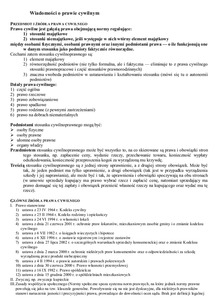 Wiadomości o prawie cywilnym P RZEDMIOT I ŹRÓDŁ A PRAWA CYWILNEGO Prawo cywilne jest gałęzią prawa obejmującą normy regulujące: 1) stosunki majątkowe 2) stosunki niemajątkowe, jeśli występuje w nich wtórny element majątkowy między osobami fizycznymi, osobami prawnymi oraz innymi podmiotami prawa — o ile funkcjonują one w danym stosunku jako podmioty faktycznie równorzędne. Cechami zatem stosunku cywilnoprawnego są: 1) element majątkowy 2) równorzędność podmiotów (nie tylko formalna, ale i faktyczna — eliminuje to z prawa cywilnego stosunki prawnopracowe i część stosunków prawnorodzinnych) 3) znaczna swoboda podmiotów w ustanawianiu i kształtowaniu stosunku (mówi się tu o autonomii podmiotów) Działy prawa cywilnego: 1) część ogólna 2) prawo rzeczowe 3) prawo zobowiązaniowe 4) prawo spadkowe 5) prawo rodzinne (z pewnymi zastrzeżeniami) 6) prawo na dobrach niematerialnych Podmiotami stosunku cywilnoprawnego mogą być: Ø osoby fizyczne Ø osoby prawne Ø ułomne osoby prawne Ø organy władzy Przedmiotem stosunku cywilnoprawnego może być wszystko to, na co skierowane są prawa i obowiązki stron tego stosunku, np. zapłacenie ceny, wydanie rzeczy, przechowanie towaru, konieczność wypłaty odszkodowania, konieczność przeproszenia kogoś za wyrządzoną mu krzywdę. Treścią stosunku cywilnoprawnego są z jednej strony uprawnienie, a z drugiej strony obowiązek. Może być tak, że jeden podmiot ma tylko uprawnienie, a drugi obowiązek (tak jest w przypadku wyrządzenia szkody i jej naprawiania), ale może być i tak, że uprawnienia i obowiązki spoczywają na obu stronach (w umowie sprzedaży kupujący ma prawo wybrać rzecz i zapłacić cenę, natomiast sprzedający ma prawo domagać się tej zapłaty i obowiązek przenieść własność rzeczy na kupującego oraz wydać mu tę rzecz). G ŁÓWNE ŹRÓDŁA PRAWA CYWILNEGO I. Prawo stanowione 1) ustawa z 23 IV 1964 r. Kodeks cywilny 2) ustawa z 25 II 1964 r. Kodeks rodzinny i opiekuńczy 3) ustawa z 24 VI 1994 r. o własności lokali 4) ustawa z dnia 21 czerwca 2001 r. ochronie praw lokatorów, mieszkaniowym zasobie gminy i o zmianie kodeksu cywilnego 5) ustawa z 6 VII 1982 r. o księgach wieczystych i hipotece 6) ustawa z 6 XII 1996 r. o zastawie rejestrowym i rejestrze zastawów 7) ustawa z dnia 27 lipca 2002 r. o szczególnych warunkach sprzedaży konsumenckiej oraz o zmianie Kodeksu cywilnego 8) ustawa z dnia 2 marca 2000 r. ochronie niektórych praw konsumentów oraz o odpowiedzialności za szkodę wyrządzoną przez produkt niebezpieczny 9) ustawa z 4 II 1994 r. o prawie autorskim i prawach pokrewnych 10) ustawa z dnia 30 czerwca 2000 r. Prawo własności przemysłowej 11) ustawa z 16 IX 1982 r. Prawo spółdzielcze 12) ustawa z dnia 15 grudnia 2000 r. o spółdzielniach mieszkaniowych II. Zwyczaj, np. zwyczaje kupieckie III.Zasady współżycia społecznego (Normy społeczne spoza systemu norm prawnych, na które jednak normy prawne powołują się jako na tzw. klauzule generalne. Powoływanie się na nie jest dyskusyjne, dla niektórych prawników stanowi naruszenie jasności i precyzyjności prawa, prowadzące do dowolności ocen sądu. Brak jest definicji legalnej tego pojęcia. Zasadom tym odpowiadać powinien przeciętny poziom moralny, właściwy godziwemu życiu zarobkowemu i gospodarczemu. Sąd Najwyższy w uchwale Pełnego Składu Izby Cywilnej z dnia 18.03.1968 r. [OSP z 1969 r., poz. 151] stwierdził, iż są to "obiektywne reguły postępowania, służące za kryterium oceny, co zasługuje lub nie zasługuje na aprobatę z punktu widzenia poglądów społeczeństwa".) ZASADY PRAWA CYWILNEGO: F zasada jednolitości prawa cywilnego (istnienie kodeksu) F zasada równości stron F zasada uprzywilejowania konsumenta w stosunkach z profesjonalistą F zasada wykonywania praw podmiotowych z uwzględnieniem ich społeczno-gospodarczego przeznaczenia oraz zasad współżycia społecznego F zasada domniemania dobrej wiary (Art. 7 Kodeksu cywilnego. Jeżeli ustawa uzależnia skutki prawne od dobrej lub złej wiary, domniemywa się istnienie dobrej wiary.) F zasada ciężaru dowodu (Art. 6 Kodeksu cywilnego. Ciężar udowodnienia faktu spoczywa na osobie, która z faktu tego wywodzi skutki prawne.) F zasada ochrony dóbr osobistych F zasada ochrony praw nabytych F nieretroakcja prawa (niedziałanie prawa wstecz) F zasada ochrony własności F zasada autonomii stron (swobody umów) F zasada wykonania zobowiązań (pacta sunt servanda) F zasada pierwszeństwa dziedziczenia testamentowego przed ustawowym STOS UNEK CYWILNOPRAWNY. ZDOLNOŚĆ W PRAWIE Stosunek cywilnoprawny to stosunek społeczny, w którym wzorce zachowań regulowane są przez prawo ustanowiona przez prawo więź o charakterze powinnościowym pomiędzy ludźmi lub utworzonymi przez nich podmiotami. Najczęstszą formą stosunku cywilnoprawnego jest zobowiązanie. Może ono powstać na drodze umowy, czynu niedozwolonego czy np. bezpodstawnego wzbogacenia. Zdolność prawna — możność bycia podmiotem praw i obowiązków; ma ją każdy podmiot uczestniczący w obrocie prawnym. Zdolność do czynności prawnych — możność kształtowania swoich praw i obowiązków w drodze czynności prawnych. Zdolność sądowa — możność reprezentowania swoich praw w sądzie. osoby w prawie cywilnym osoby fizyczne bez zdolności do czynności prawnych dziecko do 13 roku życia ubezwłasnowolniony całkowicie ograniczone w zdolności do czynności prawnych osoby prawne korporacje ułomne osoby prawne spółki osobowe prawa handlowego, wspólnoty mieszkaniowe stowarzyszenia, partie polityczne zakłady osoby prawne typu fundacyjnego banki, fundacje, przedsiębiorstwa państwowe, SA dziecko od ukończenia 13 lat do pełnoletności ubezwłasnowolniony częściowo o pełnej zdolności do czynności prawnych Ubezwłasnowolnienie to pozbawienie osoby fizycznej zdolności do czynności prawnych lub ograniczenie tejże przez sąd i podda