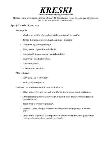 Młoda prężnie rozwijająca się firma z branży IT działająca na rynku polskim oraz europejskim poszukuje kandydatów na stanowiska: Specjalista ds. Sprzedaży Wymagania: • Absolwenci szkół wyższych bądź studenci ostatnich lat studiów. • Bardzo dobra znajomość obsługi komputera i internetu. • Znajomość języka angielskiego. • Kreatywność i dynamika w działaniu. • Umiejętność łatwego nawiązywania kontaktów. • Inicjatywa i przedsiębiorczość. • Komunikatywność. • Wysoka kultura osobista. Mile widziane: • Doświadczenie w sprzedaży. • Prawo jazdy kategorii B Osoba na tym stanowisku będzie odpowiedzialna za: • Aktywne pozyskiwanie nowych klientów i utrzymywanie z nimi kontaktów. • Sprzedaż sprzętu i rozwiązań wykorzystujących kody kreskowe w działalności przedsiębiorstw. • Raportowanie wyników sprzedaży. • Dbałość o dobre relacje z klientami oraz kreowanie pozytywnego wizerunku firmy. • Zapewnienie satysfakcji klienta poprzez właściwe identyfikowanie jego potrzeb i rekomendowanie odpowiednich rozwiązań. Oferujemy: • Ciekawą pracę w dynamicznie rozwijającej się firmie. • Szanse rozwoju. • Możliwość samorealizacji. • Biuro w dogodnej lokalizacji w Sochaczewie. • Atrakcyjne wynagrodzenie. CV (ze zdjęciem) wraz z listem motywacyjnym oraz zgodą na przetwarzanie danych osobowych prosimy przesyłać na adres: [email protected] www.kreski.pl Zastrzegamy sobie prawo odpowiedzi na wybrane zgłoszenia.