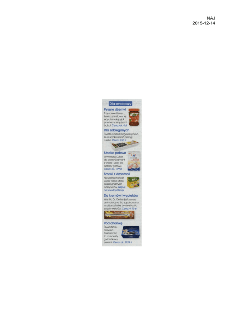 NAJ 2015-12-14 Dla smakoszy Pyszne dżemy! Trzy nowe dżemy Łowicz z limitowanej edycji smakujq jak przetwory ze spiżarni babci. Cena: ok. 4 zł Dla zabieganych Świeże ciasto Hengelein pomo że ci szybko zrobić pierogi i uszka. Cena: 5,50 zł Słodka polewa Wymieszaj Cukier do polew Diamant zwodqilukier do ozdoby gotowy. Cena: ok. 1,99 zł (m) CUKIER a U ) "vl Smaki z Amazonii Nowa linia herbat LOYDYerba Mate skusi kulinarnych odkrywców. Więcej na www.loydtea.pl Do kremów i wypieków Wanilia Dr. Oetker jest zawsze aromatyczna, bo zapakowana w szklang fiolkę, by nie straciła swych walorów. Cena: 9,90 zł Pod choinkę Śliwka Nałę czowska Solidarność to znakomity gwiazdkowy prezent. Cena: ok. 21,99 zł