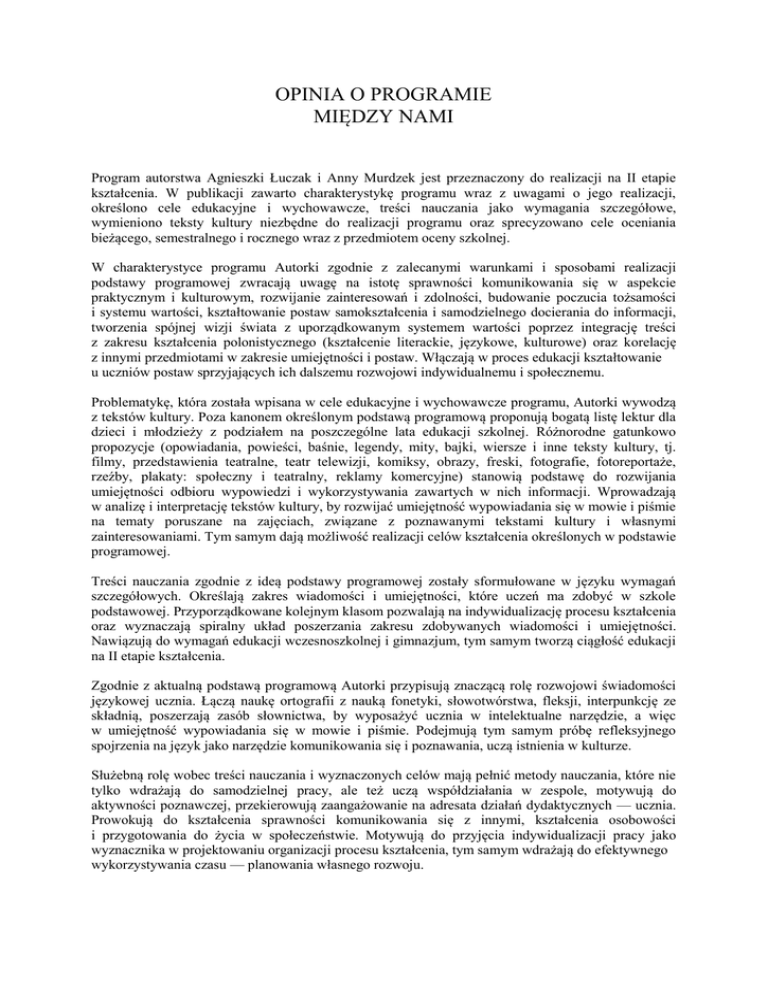 OPINIA O PROGRAMIE MIĘDZY NAMI Program autorstwa Agnieszki Łuczak i Anny Murdzek jest przeznaczony do realizacji na II etapie kształcenia. W publikacji zawarto charakterystykę programu wraz z uwagami o jego realizacji, określono cele edukacyjne i wychowawcze, treści nauczania jako wymagania szczegółowe, wymieniono teksty kultury niezbędne do realizacji programu oraz sprecyzowano cele oceniania bieżącego, semestralnego i rocznego wraz z przedmiotem oceny szkolnej. W charakterystyce programu Autorki zgodnie z zalecanymi warunkami i sposobami realizacji podstawy programowej zwracają uwagę na istotę sprawności komunikowania się w aspekcie praktycznym i kulturowym, rozwijanie zainteresowań i zdolności, budowanie poczucia tożsamości i systemu wartości, kształtowanie postaw samokształcenia i samodzielnego docierania do informacji, tworzenia spójnej wizji świata z uporządkowanym systemem wartości poprzez integrację treści z zakresu kształcenia polonistycznego (kształcenie literackie, językowe, kulturowe) oraz korelację z innymi przedmiotami w zakresie umiejętności i postaw. Włączają w proces edukacji kształtowanie u uczniów postaw sprzyjających ich dalszemu rozwojowi indywidualnemu i społecznemu. Problematykę, która została wpisana w cele edukacyjne i wychowawcze programu, Autorki wywodzą z tekstów kultury. Poza kanonem określonym podstawą programową proponują bogatą listę lektur dla dzieci i młodzieży z podziałem na poszczególne lata edukacji szkolnej. Różnorodne gatunkowo propozycje (opowiadania, powieści, baśnie, legendy, mity, bajki, wiersze i inne teksty kultury, tj. filmy, przedstawienia teatralne, teatr telewizji, komiksy, obrazy, freski, fotografie, fotoreportaże, rzeźby, plakaty: społeczny i teatralny, reklamy komercyjne) stanowią podstawę do rozwijania umiejętności odbioru wypowiedzi i wykorzystywania zawartych w nich informacji. Wprowadzają w analizę i interpretację tekstów kultury, by rozwijać umiejętność wypowiadania się w mowie i piśmie na tematy poruszane na zajęciach, związane z poznawanymi tekstami kultury i własnymi zainteresowaniami. Tym samym dają możliwość realizacji celów kształcenia określonych w podstawie programowej. Treści nauczania zgodnie z ideą podstawy programowej zostały sformułowane w języku wymagań szczegółowych. Określają zakres wiadomości i umiejętności, które uczeń ma zdobyć w szkole podstawowej. Przyporządkowane kolejnym klasom pozwalają na indywidualizację procesu kształcenia oraz wyznaczają spiralny układ poszerzania zakresu zdobywanych wiadomości i umiejętności. Nawiązują do wymagań edukacji wczesnoszkolnej i gimnazjum, tym samym tworzą ciągłość edukacji na II etapie kształcenia. Zgodnie z aktualną podstawą programową Autorki przypisują znaczącą rolę rozwojowi świadomości językowej ucznia. Łączą naukę ortografii z nauką fonetyki, słowotwórstwa, fleksji, interpunkcję ze składnią, poszerzają zasób słownictwa, by wyposażyć ucznia w intelektualne narzędzie, a więc w umiejętność wypowiadania się w mowie i piśmie. Podejmują tym samym próbę refleksyjnego spojrzenia na język jako narzędzie komunikowania się i poznawania, uczą istnienia w kulturze. Służebną rolę wobec treści nauczania i wyznaczonych celów mają pełnić metody nauczania, które nie tylko wdrażają do samodzielnej pracy, ale też uczą współdziałania w zespole, motywują do aktywności poznawczej, przekierowują zaangażowanie na adresata działań dydaktycznych — ucznia. Prowokują do kształcenia sprawności komunikowania się z innymi, kształcenia osobowości i przygotowania do życia w społeczeństwie. Motywują do przyjęcia indywidualizacji pracy jako wyznacznika w projektowaniu organizacji procesu kształcenia, tym samym wdrażają do efektywnego wykorzystywania czasu — planowania własnego rozwoju. Sprawdzanie i ocenianie osiągnięć uczniów jest zgodne z wymaganiami określonymi rozporządzeniem w sprawie warunków i sposobu oceniania, odwołuje się do konieczności przekazania informacji zwrotnej na temat poziomu osiągnięć edukacyjnych, postępu w zakresie osiągnięć, pomocy w samodzielnym planowaniu rozwoju, motywowaniu do postępów, dostarczaniu informacji rodzicom, nauczycielom o postępach, trudnościach i uzdolnieniach. Jako propozycję wdrażania do systematyczności i obiektywizmu Autorki sugerują wykorzystanie w procesie oceniania karty oceny ucznia. Przyjęcie przez Autorki takiej koncepcji programu zapewnia realizację wymagań określonych przez aktualną podstawę programową. Dzięki temu program jest dostosowany do potrzeb i możliwości rozwojowych uczniów na II etapie edukacji. Joanna Piasta-Siechowicz
