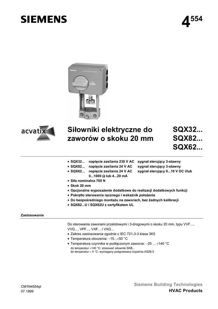 4 554 Siłowniki elektryczne do zaworów o skoku 20 mm SQX32... SQX82... SQX62... • SQX32... • SQX82... • SQX62... • • • • • • napięcie zasilania 230 V AC sygnał sterujący 3-stawny napięcie zasilania 24 V AC sygnał sterujący 3-stawny napięcie zasilania 24 V AC sygnał sterujący 0...10 V DC i/lub 0...1000 Ω lub 4...20 mA Siła nominalna 700 N Skok 20 mm Opcjonalne wyposażenie dodatkowe do realizacji dodatkowych funkcji Pokrętło sterowania ręcznego i wskaźnik położenia Do bezpośredniego montażu na zaworach, bez żadnych kalibracji SQX82...U i SQX62U z certyfikatem UL Zastosowanie Do sterowania zaworami przelotowymi i 3-drogowymi o skoku 20 mm, typu VVF..., VVG..., VPF..., VXF... i VXG... • Zakres zastosowania zgodnie z IEC 721-3-3 klasa 3K5 • Temperatura otoczenia: −15...+50 °C • Temperatura czynnika w podłączonym zaworze: −25 ... +140 °C do temperatur >140 °C: stosować siłowniki SKB... do temperatur < 0 °C: wymagany podgrzewacz trzpienia ASZ6.5 CM1N4554pl 07.1999 Siemens Building Technologies HVAC Products Działanie Sterowanie 3-stawne SQX32..., SQX82... Rewersyjny silnik synchroniczny sterowany jest sygnałem 3-stawnym poprzez zaciski Y1, Y2 i wymusza ruch przekładni, co z kolei powoduje przemieszczenie trzpienia. • Napięcie na Y1: • Napięcie na Y2: • Brak napięcia na Y1 i Y2: Chowanie trzpienia zaworu, otwieranie kanału regulacyjnego Wysuwanie trzpienia zaworu, zamykanie kanału regulacyjnego Trzpień zaworu pozostaje w bieżącej pozycji Sterowanie 0...10 V DC i/lub 0...1000 Ω lub 4...20 mA DC SQX62... SQX62... sterowany jest poprzez zaciski Y i/lub R. Sygnały te sterują silnikiem synchronicznym poprzez elektroniczne układy mikroprocesorowe. Silnik wymusza ruch przekładni, co z kolei powoduje przemieszczenie trzpienia. Wybór charakterystyki Za pomocą przełącznika (umieszczonego na obwodzie drukowanym, pod pokrywą obudowy) można zmienić charakterystykę przepływu zaworów VVF..., VVG..., VXF..., VXG... i VPF... ze „stałoprocentowej” na „liniową”. Fabrycznie układy mikroprocesorowe ustawione są tak, aby zawór w kanale regulacyjnym posiadał charakterystykę stałoprocentową (log). Charakterystyka przepływu Związek pomiędzy sygnałem sterującym 0...10 V DC lub 4...20 mA DC i strumieniem: • Sygnał sterujący Y, R wzrastający: Chowanie trzpienia zaworu, otwieranie kanału regulacyjnego • Sygnał sterujący Y, R malejący: Wysuwanie trzpienia zaworu, zamykanie kanału regulacyjnego • Sygnał sterujący Y, R stały: Trzpień zaworu pozostaje w bieżącej pozycji Siłownik V Y, R H U H V100 Sygnał zwrotny Zawór H U 4554D02pl Y V V0 0 4 0 10 V 20 mA 1000 Ω Y, R H V Kalibracja skoku . Y = 0...10 V DC V R = 4...20 mA DC lub 0...1000 Ω V 100 = U H = = 0...10 V DC lub 4...20 mA DC Skok (zaworu) V0 log lin . . = = = = Strumień objętości Strumień objętości 100 % Strumień objętości 0 % Charakterystyka stałoprocentowa zaworu Charakterystyka liniowa zaworu W celu ustalenia położenia 0 % i 100 % zaworu, podczas pierwszego uruchomienia musi zostać przeprowadzona kalibracja. Warunkiem powodzenia tej operacji jest mechaniczne połączenie siłownika SQX62 lub SQX62U z zaworem VV... lub VX... oraz zasilenie napięciem 24 V AC. Naciśnięcie przycisku S3 (dostępnego tylko po zdjęciu pokrywy obudowy) uruchamia procedurę kalibracji, która przebiega automatycznie w następujących krokach: − Siłownik przesuwa się do pozycji „0 skoku" (zawór zamknięty), miga zielona dioda − Siłownik przesuwa się do pozycji „100 skoku" (zawór otwarty), miga zielona dioda − Zmierzone wartości zapamiętane zostają w mikroprocesorze. Następnie siłownik przesuwa się do pozycji wyznaczonej sygnałem sterującym Y lub R, zapalona zielona dioda (praca normalna) 2/10 Siemens Building Technologies HVAC Products Siłowniki elektryczne do zaworów o skoku 20 mm CM1N4554pl 07.1999 − Wyjście U podczas kalibracji jest nieaktywne, tzn. wartości odpowiadają rzeczywistym pozycjom tylko wtedy, gdy dioda zacznie się świecić ciągle. Napięcie na wyjściu U ograniczone jest do 9,7 V DC ±0,2 V. Natężenie prądu na wyjściu U ograniczone jest do 20 mA ±0,5 mA. Kalibrację skoku można powtarzać dowolną ilość razy. Zestawienie typów Wersja standardowa Wersja UL Wyposażenie dodatkowe Oznaczenie typu Napięcie zasilania Sterowanie (sygnał sterujący) SQX32.00 SQX32.03 SQX82.00 SQX82.03 SQX62 230 V AC 3-stawne SQX82.00U SQX82.03U SQX62U 24 V AC 24 V AC 0...10 V DC i/lub 0...1000 Ω lub 4...20 mA DC Opis Przełącznik pomocniczy Przełącznik pomocniczy i potencjometr 1000 Ω Para przełączników pomocniczych Podgrzewacz trzpienia 24 V AC *) Czas przebiegu Otwieranie Zamykanie 150 s 150 s 35 s 35 s 150 s 150 s 35 s 35 s 35 s 35 s 3-stawne 0...10 V DC i/lub 0...1000 Ω lub 4...20 mA DC 150 s 35 s 35 s 150 s 35 s 35 s Oznaczenie typu Zastosowanie do siłowników Miejsce do montażu *) ASC9.5 SQX32..., SQX82..., SQX82...U 1 x ASC9.5 lub 1 x ASZ7.4 lub ASZ7.4 1 x ASC9.4 ASC9.4 ASZ6.5 SQX32...,SQX82...,SQX62, SQX82...U, SQX62U 1 x ASZ6.5 *) W siłowniku można zamontować tylko jeden z elementów wyposażenia dodatkowego. Wyjątek stanowi podgrzewacz trzpienia ASZ6.5, montowany dodatkowo między siłownikiem i zaworem. Zamawianie i dostawa Przy zamawianiu należy podać nazwę i oznaczenie typu siłownika i wymaganego wyposażenia dodatkowego, np.: Siłownik elektryczny SQX32.00 Siłownik, zawór i wyposażenie dodatkowe dostarczane są w oddzielnych opakowaniach i nie są zmontowane. Urządzenia współpracujące Siłowniki elektryczne SQX... mogą sterować następującymi zaworami przelotowymi i trójdrogowymi o skoku 20 mm: Typ DN [mm] PN [bar] Zawory przelotowe VV... (zawory regulacyjne i odcinające) VVF21... (kołnierzowe) 25...80 6 VVF31... (kołnierzowe) 25...80 10 VVF41... (kołnierzowe) 50 16 VVG41... (gwintowane) 15...50 16 VVF52... (kołnierzowe) 15...40 25 Zawory trójdrogowe VX... (