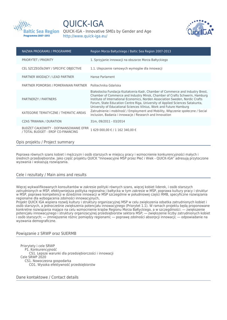 QUICK-IGA QUICK-IGA - Innovative SMEs by Gender and Age http://www.quick-iga.eu/ NAZWA PROGRAMU / PROGRAMME Region Morza Bałtyckiego / Baltic Sea Region 2007-2013 PRIORYTET / PRIORITY 1. Sprzyjanie innowacji na obszarze Morza Bałtyckiego CEL SZCZEGÓŁOWY / SPECIFIC OBJECTIVE 1.1. Ulepszenie ramowych wymogów dla innowacji PARTNER WIODĄCY / LEAD PARTNER Hanse Parlament PARTNER POMORSKI / POMERANIAN PARTNER Politechnika Gdańska PARTNERZY / PARTNERS KATEGORIE TEMATYCZNE / THEMATIC AREAS CZAS TRWANIA / DURATION Białostocka Fundacja Kształcenia Kadr, Chamber of Commerce and Industry Brest, Chamber of Commerce and Industry Minsk, Chamber of Crafts Schwerin, Hamburg Institute of International Economics, Norden Association Sweden, Nordic Crafts Forum, State Education Centre Riga, University of Applied Sciences Satakunta, University of Educational Sciences Vilnius, Work and Future Hamburg Zatrudnienie i mobilność / Employment and Mobility, Włączenie społeczne / Social inclusion, Badania i innowacje / Research and Innovation 31m, 09/2011 - 03/2014 BUDŻET CAŁKOWITY - DOFINANSOWANIE EFRR 1 629 000,00 € / 1 162 340,00 € / TOTAL BUDGET - ERDF CO-FINANCING Opis projektu / Project summary Poprawa równych szans kobiet i mężczyzn i osób starszych w miejscu pracy i wzmocnienie konkurencyjności małych i średnich przedsiębiorstw. Jako część projektu QUICK "Innowacyjne MŚP przez Płeć i Wiek - QUICK-IGA" adresują przytoczone wyzwania i wskazują rozwiązania. Cele i rezultaty / Main aims and results Więcej wykwalifikowanych konsultantów w zakresie polityki równych szans, więcej kobiet liderek, i osób starszych zatrudnionych w MŚP, efektywniejsza polityka regionalna i bałtycka w tym zakresie w MŚP, poprawa kultury pracy i struktur w MŚP, poprawa kompetencji w dziedzinie innowacji w MŚP szczególnie w południowej części RMB, specyficzne rozwiązania regionalne dla wzbogacenia zdolności innowacyjnych, Projekt QUICK IGA wspiera rozwój kultury i struktury organizacyjnej MSP w celu zwiększenia odsetka zatrudnionych kobiet i osób starszych, a jednocześnie zwiększenia potencjału innowacyjnego (Priorytet 1.1). W ramach projektu będą proponowane konkretne rozwiązania mające na celu wzmocnienie krajów Regionu Morza Bałtyckiego, a w szczególności: ― zwiększenie potencjału innowacyjnego i struktury organizacyjnej przedsiębiorstw sektora MSP; ― zwiększenie liczby zatrudnionych kobiet i osób starszych; ― zmniejszenie różnic pomiędzy regionami; ― poprawę zdolności absorpcji innowacji; ― odpowiadanie na wyzwania demograficzne. Powiązanie z SRWP oraz SUERMB Priorytety i cele SRWP P1. Konkurencyjność CS1. Lepsze warunki dla przedsiębiorczości i innowacji Cele SRWP 2020 CS1. Nowoczesna gospodarka CO1. Wysoka efektywność przedsiębiorstw Dane kontaktowe / Contact details Hanse Parlament (partner wiodący / Lead Partner) Jürgen Hogeforster Blankenser Landstraße 7, 22587 Hamburg tel.: +49 408 224 471 0 e-mail: [email protected] http://www.hanse-parlament.eu/ Politechnika Gdańska (partner pomorski / Pomeranian partner) Marzena Grzesiak Gabriela Narutowicza 11/12, 80-233 Gdańsk tel.: +48 583 471 617 e-mail: [email protected] http://www.zie.pg.gda.pl/