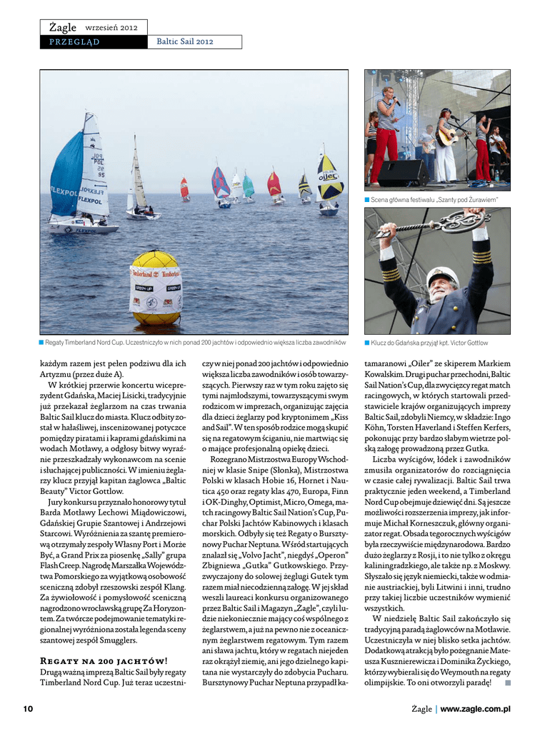 Żagle wrzesień 2012 przegląd Baltic Sail 2012 n Scena główna festiwalu „Szanty pod Żurawiem” n Regaty Timberland Nord Cup. Uczestniczyło w nich ponad 200 jachtów i odpowiednio większa liczba zawodników n Klucz do Gdańska przyjął kpt. Victor Gottlow każdym razem jest pełen podziwu dla ich Artyzmu (przez duże A). W krótkiej przerwie koncertu wiceprezydent Gdańska, Maciej Lisicki, tradycyjnie już przekazał żeglarzom na czas trwania Baltic Sail klucz do miasta. Klucz odbity został w hałaśliwej, inscenizowanej potyczce pomiędzy piratami i kaprami gdańskimi na wodach Motławy, a odgłosy bitwy wyraźnie przeszkadzały wykonawcom na scenie i słuchającej publiczności. W imieniu żeglarzy klucz przyjął kapitan żaglowca „Baltic Beauty” Victor Gottlow. Jury konkursu przyznało honorowy tytuł Barda Motławy Lechowi Miądowiczowi, Gdańskiej Grupie Szantowej i Andrzejowi Starcowi. Wyróżnienia za szantę premierową otrzymały zespoły Własny Port i Morże Być, a Grand Prix za piosenkę „Sally” grupa Flash Creep. Nagrodę Marszałka Województwa Pomorskiego za wyjątkową osobowość sceniczną zdobył rzeszowski zespół Klang. Za żywiołowość i pomysłowość sceniczną nagrodzono wrocławską grupę Za Horyzontem. Za twórcze podejmowanie tematyki regionalnej wyróżniona została legenda sceny szantowej zespół Smugglers. tamaranowi „Oiler” ze skiperem Markiem Kowalskim. Drugi puchar przechodni, Baltic Sail Nation’s Cup, dla zwycięzcy regat match racingowych, w których startowali przedstawiciele krajów organizujących imprezy Baltic Sail, zdobyli Niemcy, w składzie: Ingo Köhn, Torsten Haverland i Steffen Kerfers, pokonując przy bardzo słabym wietrze polską załogę prowadzoną przez Gutka. Liczba wyścigów, łódek i zawodników zmusiła organizatorów do rozciągnięcia w czasie całej rywalizacji. Baltic Sail trwa praktycznie jeden weekend, a Timberland Nord Cup obejmuje dziewięć dni. Są jeszcze możliwości rozszerzenia imprezy, jak informuje Michał Korneszczuk, główny organizator regat. Obsada tegorocznych wyścigów była rzeczywiście międzynarodowa. Bardzo dużo żeglarzy z Rosji, i to nie tylko z okręgu kaliningradzkiego, ale także np. z Moskwy. Słyszało się język niemiecki, także w odmianie austriackiej, byli Litwini i inni, trudno przy takiej liczbie uczestników wymienić wszystkich. W niedzielę Baltic Sail zakończyło się tradycyjną paradą żaglowców na Motławie. Uczestniczyła w niej blisko setka jachtów. Dodatkową atrakcją było pożegnanie Mateusza Kusznierewicza i Dominika Życkiego, którzy wybierali się do Weymouth na regaty olimpijskie. To oni otworzyli paradę! Regaty na 200 jachtów! Drugą ważną imprezą Baltic Sail były regaty Timberland Nord Cup. Już teraz uczestni10 czy w niej ponad 200 jachtów i odpowiednio większa liczba zawodników i osób towarzyszących. Pierwszy raz w tym roku zajęto się tymi najmłodszymi, towarzyszącymi swym rodzicom w imprezach, organizując zajęcia dla dzieci żeglarzy pod kryptonimem „Kiss and Sail”. W ten sposób rodzice mogą skupić się na regatowym ściganiu, nie martwiąc się o mające profesjonalną opiekę dzieci. Rozegrano Mistrzostwa Europy Wschodniej w klasie Snipe (Słonka), Mistrzostwa Polski w klasach Hobie 16, Hornet i Nautica 450 oraz regaty klas 470, Europa, Finn i OK-Dinghy, Optimist, Micro, Omega, match racingowy Baltic Sail Nation’s Cup, Puchar Polski Jachtów Kabinowych i klasach morskich. Odbyły się też Regaty o Bursztynowy Puchar Neptuna. Wśród startujących znalazł się „Volvo Jacht”, niegdyś „Operon” Zbigniewa „Gutka” Gutkowskiego. Przyzwyczajony do solowej żeglugi Gutek tym razem miał niecodzienną załogę. W jej skład weszli laureaci konkursu organizowanego przez Baltic Sail i Magazyn „Żagle”, czyli ludzie niekoniecznie mający coś wspólnego z żeglarstwem, a już na pewno nie z oceanicznym żeglarstwem regatowym. Tym razem ani sława jachtu, który w regatach niejeden raz okrążył ziemię, ani jego dzielnego kapitana nie wystarczyły do zdobycia Pucharu. Bursztynowy Puchar Neptuna przypadł ka- Żagle | www.zagle.com.pl