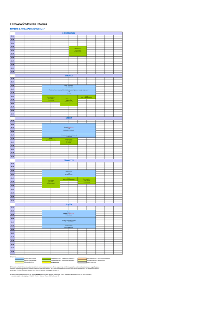I Ochrona Środowiska I stopień SEMESTR 1, ROK AKADEMICKI 2016/17 PONIEDZIAŁEK 07.00 08.00 09.00 10.00 Matematyka gr.III, s.F305 M.Jabłonowski 11.00 12.00 13.00 14.00 15.00 16.00 17.00 WTOREK 07.00 08.00 09.00 BiHP i ergonomia s. D3, W.Nowicki 10.00 Przedmiot humanistyczny "Człowiek, środowisko i higiena w rozwoju dziejowym" s.D3 I.Janicka 11.00 12.00 Chemia ogólna gr.I, s.F206 J.Makowska 13.00 Fizyka gr.III, s.F305,N.Górecka Matematyka gr.II, s.C313 M.Niebrzydowski 14.00 15.00 16.00 17.00 ŚRODA 07.00 08.00 Biologia (od 16.11) s.D3 J.Izdebska, L.Rolbiecki 09.00 10.00 11.00 Ochrona własności intelektualnej s.D3 K.Czub 12.00 Fizyka gr.I, F105,M.Miotke 13.00 Chemia ogólna gr.II, s.C210 K.Żamojć 14.00 15.00 16.00 17.00 CZWARTEK 07.00 08.00 09.00 Matematyka s.D3 M.Jabłonowski 10.00 11.00 Matematyka gr.I, s.F305 M.Jabłonowski 12.00 Fizyka gr.II, s.F206, P.Kamiński Chemia ogólna gr.III, s.F105 A.Chylewska 13.00 14.00 15.00 16.00 17.00 PIĄTEK 07.00 08.00 Fizyka WMFiI-s.3 (8.15-9.45) M.Józefowicz 09.00 10.00 Wstęp do przedsiębiorczości s.D3, A.Poszewiecki 11.00 12.00 Chemia ogólna s.D3, J.Makowska 13.00 14.00 15.00 16.00 17.00 18.00 19.00 1. Legenda: wykłady obligatoryjne; wykłady fakultatywne; lektoraty językowe obligatoryjne ćwicz. audytoryjne i seminaria; fakultatywne ćwicz. audytoryjne i seminaria; konwersatoria obligatoryjne ćwicz. laboratoryjne/terenowe fakultatywne ćwicz. laboratoryjne zajęcia terenowe 2. Wszystkie wykłady i ćwiczenia audytoryjne (o ile nie jest inaczej zaznaczone na planie) rozpoczynają się 15 minut po pełnej godzinie, jaka jest wskazana na grafiku planu, natomiast ćwiczenia laboratoryjne dokładnie o godzinie wskazanej na planie. Po każdej godzinie lekcyjnej wykładu oraz ćwiczeń audytoryjnych jest przewidziana przerwa w wymiarze 15 minut. Ćwiczenia laboratoryjne i lektoraty językowe odbywają się bez przerw. 3. Zajęcia oznaczone przed numerem sali literami WMFiI odbywają się na Wydziale Matematyki, Fizyki i Informatyki w Gdańsku-Oliwie, ul. Wita Stwosza 57; pozostałe zajęcia odbywają się na Wydziale Chemii w Gdańsku-Oliwie, ul. Wita Stwosza 63.