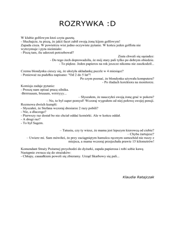 ROZRYWKA :D W klubie golfowym ktoś czyta gazetę. - Słuchajcie, tu piszą, Ŝe jakiś facet zabił swoją Ŝonę kijem golfowym! Zapada cisza. W powietrzu wisi jedno oczywiste pytanie. W końcu jeden golfista nie wytrzymuje i pyta nieśmiało: - Piszą tam, ilu uderzeń potrzebował? Ziuta chwali się sąsiadce: - Do tego Ŝech doprowadziła, Ŝe mój stary pali tylko po dobrym obiedzie. - To piękne. Jeden papieros na rok jeszcze nikomu nie zaszkodził... Czemu blondynka cieszy się, Ŝe ułoŜyła układankę puzzle w 4 miesiące? - PoniewaŜ na pudełku napisano: "Od 2 do 5 lat"! Po czym poznać, Ŝe blondynka uŜywała komputera? - Po śladach korektora na monitorze. Komisja zadaje pytanie: - Proszę nam opisać pracę silnika. -Brrrruuum, bruuum, wrrrryyy... – Słyszałem, Ŝe nauczyłeś swoją Ŝonę grać w pokera? – No, to był super pomysł! Wczoraj wygrałem od niej połowę swojej pensji. Rozmowa dwóch kumpli: - Słyszałeś, Ŝe Stefana wczoraj dresiarze 2 razy pobili? - Nie, a dlaczego? - Pierwszy raz dostał bo nie chciał oddać komórki. Ale w końcu oddał. - A drugi raz? - To był Sagem. – Tatusiu, czy ty wiesz, Ŝe mama jest lepszym kierowcą od ciebie? – Chyba Ŝartujesz? – Uwierz mi. Sam mówiłeś, Ŝe przy zaciągniętym hamulcu ręcznym samochód nie ruszy z miejsca, a mama wczoraj przejechała prawie 15 kilometrów! Komendant StraŜy PoŜarnej przychodzi do dyŜurki, zapala papierosa i robi sobie kawę. Następnie zwraca się do straŜaków: - Chłopy, caaaałkiem powoli się zbieramy. Urząd Skarbowy się pali... Klaudia Ratajczak