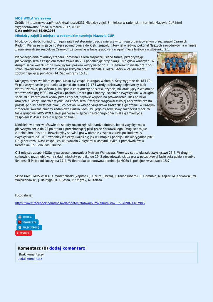 MOS WOLA Warszawa Źródło: http://moswola.pl/mos/aktualnosci/9331,Mlodzicy-zajeli-3-miejsce-w-radomskim-turnieju-Mazovia-CUP.html Wygenerowano: Środa, 8 marca 2017, 09:46 Data publikacji 19.09.2016 Młodzicy zajęli 3 miejsce w radomskim turnieju Mazovia CUP Młodzicy po dwóch dniach zmagań zajęli ostatecznie trzecie miejsce w turnieju organizowanym przez zespół Czarnych Radom. Pierwsze miejsce i patera powędrowała do Kielc, zespołu, który jako jedyny pokonał Naszych zawodników, a w finale zrewanżowali się zespołowi Czarnych za porażkę w fazie grupowej i wygrali mecz finałowy w stosunku 2:1. Pierwszego dnia młodzicy trenera Tomasza Kellera rozpoczęli słabo turniej przegrywając pierwszego seta z zespołem Metra W-wa do 20 i popełniając przy okazji 18 błędów własnych! W drugim secie weszli już na swój wysoki poziom wygrywając do 11. Tie-break to niezła gra z obu stron, zakończona atakiem z lewego skrzydła przez Michała Kuleszę, który w całym meczu zdobył najwięcej punktów- 14. Set wygrany 15:13. Kolejnym przeciwnikiem zespołu Mosu był zespół Huragan Wołomin. Sety wygrane do 18 i 19. W pierwszym secie gra punkt za punkt do stanu 17:17 i wtedy efektowny pojedynczy blok Piotra Szlęzaka, po którym piłka spadła centymetry od siatki, szybciej niż atakujący z Wołomina wprowadziła grę MOSu na wyższy poziom. Dobra gra z kontry i spokojne zwycięstwo. W drugim secie MOS kontrolował wynik przez cały set, szybkie wyjście na prowadzenie 10:3 po kilku atakach Kuleszy i kontrola wyniku do końca seta. Świetnie rozgrywał Mikołaj Karkowski często posyłając piłki nawet bez bloku, co pozwoliło wbijać Szlęzakowi siatkarskie gwoździe. W każdym z meczów świetne zmiany zadaniowe Bartka Gomułki i jego as serwisowy zakończył mecz. W fazie grupowej MOS WOLA zajął pierwsze miejsce i następnego dnia miał się zmierzyć z zespołem PLASu Kielce o wejście do finału. Niedziela w przeciwieństwie do soboty rozpoczęła się bardzo dobrze, bo od zwycięstwa w pierwszym secie do 22 po ataku z przechodzącej piłki przez Karkowskiego. Drugi set to już zupełnie inna historia. Rewelacyjny serwis i gra w obronie zespołu z Kielc poskutkowały zwycięstwem do 10. Zawodnicy kieleccy uwijali się jak w ukropie i podbijali niewiarygodne piłki. Drugi set rozbił Nasz zespół, co skutkowało 7 błędami własnymi i tylko 1 przeciwników w tiebreaku- 15:9 dla Plasu Kielce. O 3 miejsce zespół MOSu rywalizował ponownie z Metrem Warszawa. Pierwszy set to okazałe zwycięstwo 25:7. W drugim całkowicie przemeblowany skład i niestety porażka do 19. Zadecydowała słaba gra w początkowej fazie seta gdzie z wyniku 5:4 zespół Metra odskoczył na 11:4. W tiebreaku to ponowna dominacja MOSu i spokojne zwycięstwo 15:7. Skład UMKS MOS WOLA: K. Warcholiński (kapitan), J. Dziura (libero), J. Kausa (libero), B. Gomułka, M.Kajzer, M. Karkowski, W. Wojciechowski, J. Bałdyga, M. Kulesza, P. Szlęzak, M. Kolasa. Fotogaleria: https://www.facebook.com/moswola/photos/?tab=album&album_id=1158709074187986 Komentarz (0) dodaj komentarz Brak komentarzy dodaj komentarz
