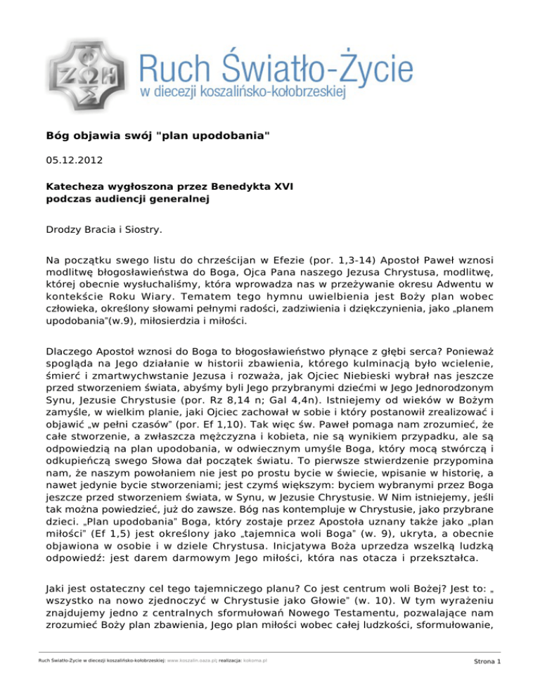 Bóg objawia swój "plan upodobania" 05.12.2012 Katecheza wygłoszona przez Benedykta XVI podczas audiencji generalnej Drodzy Bracia i Siostry. Na początku swego listu do chrześcijan w Efezie (por. 1,3-14) Apostoł Paweł wznosi modlitwę błogosławieństwa do Boga, Ojca Pana naszego Jezusa Chrystusa, modlitwę, której obecnie wysłuchaliśmy, która wprowadza nas w przeżywanie okresu Adwentu w kontekście Roku Wiary. Tematem tego hymnu uwielbienia jest Boży plan wobec człowieka, określony słowami pełnymi radości, zadziwienia i dziękczynienia, jako „planem upodobania”(w.9), miłosierdzia i miłości. Dlaczego Apostoł wznosi do Boga to błogosławieństwo płynące z głębi serca? Ponieważ spogląda na Jego działanie w historii zbawienia, którego kulminacją było wcielenie, śmierć i zmartwychwstanie Jezusa i rozważa, jak Ojciec Niebieski wybrał nas jeszcze przed stworzeniem świata, abyśmy byli Jego przybranymi dziećmi w Jego Jednorodzonym Synu, Jezusie Chrystusie (por. Rz 8,14 n; Gal 4,4n). Istniejemy od wieków w Bożym zamyśle, w wielkim planie, jaki Ojciec zachował w sobie i który postanowił zrealizować i objawić „w pełni czasów” (por. Ef 1,10). Tak więc św. Paweł pomaga nam zrozumieć, że całe stworzenie, a zwłaszcza mężczyzna i kobieta, nie są wynikiem przypadku, ale są odpowiedzią na plan upodobania, w odwiecznym umyśle Boga, który mocą stwórczą i odkupieńczą swego Słowa dał początek światu. To pierwsze stwierdzenie przypomina nam, że naszym powołaniem nie jest po prostu bycie w świecie, wpisanie w historię, a nawet jedynie bycie stworzeniami; jest czymś większym: byciem wybranymi przez Boga jeszcze przed stworzeniem świata, w Synu, w Jezusie Chrystusie. W Nim istniejemy, jeśli tak można powiedzieć, już do zawsze. Bóg nas kontempluje w Chrystusie, jako przybrane dzieci. „Plan upodobania” Boga, który zostaje przez Apostoła uznany także jako „plan miłości” (Ef 1,5) jest określony jako „tajemnica woli Boga” (w. 9), ukryta, a obecnie objawiona w osobie i w dziele Chrystusa. Inicjatywa Boża uprzedza wszelką ludzką odpowiedź: jest darem darmowym Jego miłości, która nas otacza i przekształca. Jaki jest ostateczny cel tego tajemniczego planu? Co jest centrum woli Bożej? Jest to: „ wszystko na nowo zjednoczyć w Chrystusie jako Głowie” (w. 10). W tym wyrażeniu znajdujemy jedno z centralnych sformułowań Nowego Testamentu, pozwalające nam zrozumieć Boży plan zbawienia, Jego plan miłości wobec całej ludzkości, sformułowanie, Ruch Światło-Życie w diecezji koszalińsko-kołobrzeskiej: www.koszalin.oaza.pl; realizacja: kokoma.pl Strona 1 które św. Ireneusz z Lyonu umieścił jako rdzeń swojej chrystologii: „zjednoczyć” wszystko w Chrystusie. Być może niektórzy z was pamiętają sformułowanie użyte przez papieża Piusa X, by poświęcić świat Najświętszemu Sercu Jezusowemu: „Instaurare omnia in Christo” (Wszystko odnowić w Chrystusie), odwołujące się do tego wyrażenia Pawłowego, które było dewizą tego świętego papieża. Jednakże Apostoł mówi dokładniej o zjednoczeniu wszechświata w Chrystusie, a oznacza to, że w wielkim planie stworzenia i historii Chrystus jawi się jako centrum całej drogi świata, zasadniczą oś wszystkiego, przyciągając do siebie całą rzeczywistość, by przezwyciężyć rozproszenie i ograniczenia, i doprowadzić wszystko do pełni, jakiej chce Bóg (por. Ef 1,23). Ten „plan upodobania” nie pozostał, że tak powiem w milczeniu Boga, na wyżynach Jego nieba, lecz Bóg pozwolił go poznać wchodząc w relację z człowiekiem, w której nie objawił jedynie czegoś, ale samego Siebie. Przekazał On nie tylko jakiś zestaw prawd, ale objawił nam siebie, aż do przyjęcia naszego ciała. II Sobór Watykański w konstytucji dogmatycznej Dei Verbum stwierdza: „Spodobało się Bogu w swej dobroci i mądrości objawić samego siebie i ukazać tajemnicę swej woli (por. Ef 1,9), dzięki której ludzie przez Chrystusa, Słowo, które stało się ciałem, mają dostęp do Ojca w Duchu Świętym i stają się współuczestnikami Bożej natury” (n. 2). Bóg objawia swój wielki plan miłości wkraczając w relację z człowiekiem, zbliżając się do niego tak bardzo, że stał się człowiekiem. „Niewidzialny Bóg (por. Kol 1,15, 1 Tm 1,17) – pisze dalej Dei Verbum - w swojej wielkiej miłości przemawia do ludzi jak do przyjaciół (por. Wj 33,11; J 15,14-15) i przestaje z nimi (por. Bar 3,38), aby zaprosić i przyjąć ich do wspólnoty z Sobą” (tamże). W oparciu jedynie o swoją inteligencję i zdolności człowiek nie mógłby zyskać tego, tak jasnego objawienia Bożej miłości; to Bóg otworzył swoje niebo i się uniżył, by prowadzić człowieka w głębinach swojej miłości. Święty Paweł napisał do chrześcijan w Koryncie: „Głosimy, jak zostało napisane, to, czego ani oko nie widziało, ani ucho nie słyszało, ani serce człowieka nie zdołało pojąć, jak wielkie rzeczy przygotował Bóg tym, którzy Go miłują. Nam zaś objawił to Bóg przez Ducha. Duch przenika wszystko, nawet głębokości Boga samego” (1 Kor 2,9-10). Zaś święty Jan Chryzostom, w słynnej homilii na temat początku Listu do Efezjan, zaprasza do zasmakowania całego piękna „planu upodobania” Boga objawionego w Chrystusie następującymi słowy: „Czego tobie brakuje? Stałeś się nieśmiertelnym, stałeś się wolny, stałeś się dzieckiem, stałeś się sprawiedliwym, stałeś się bratem, stałeś się współdziedzicem, z Chrystusem panujesz, z Chrystusem będziesz uwielbiony. Wszystko zostało tobie dane, i - jak to jest napisane - «jakże miałby wraz z Nim i wszystkiego nam nie darować?» (Rz 8,32). Twoje pierwszeństwo (por. 1 Kor 15,20.23) adorują aniołowie [ …]: czego tobie brakuje?”, (PG 62,11). Ta komunia w Chrystusie przez Ducha Świętego, dana przez Boga wszystkim ludziom wraz ze ś