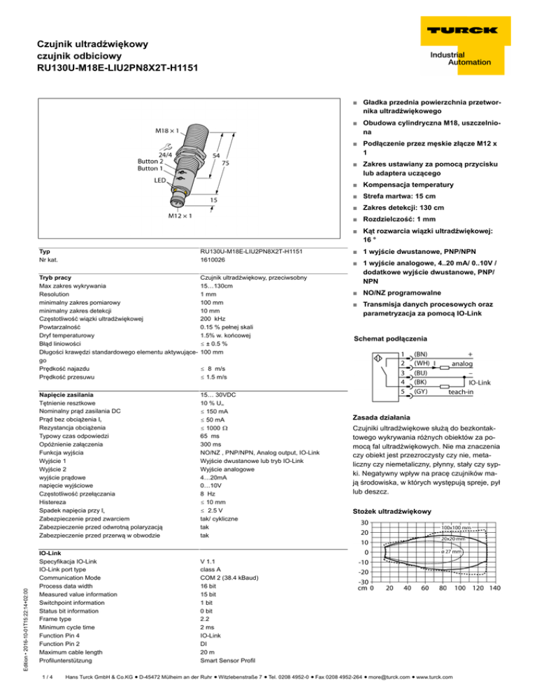 Czujnik ultradźwiękowy czujnik odbiciowy RU130U-M18E-LIU2PN8X2T-H1151 ■ Gładka przednia powierzchnia przetwornika ultradźwiękowego ■ Obudowa cylindryczna M18, uszczelniona ■ Podłączenie przez męskie złącze M12 x 1 ■ Zakres ustawiany za pomocą przycisku lub adaptera uczącego ■ Kompensacja temperatury ■ Strefa martwa: 15 cm ■ Zakres detekcji: 130 cm ■ Rozdzielczość: 1 mm Edition • 2016-10-01T15:22:14+02:00 ■ Kąt rozwarcia wiązki ultradźwiękowej: 16 ° Typ Nr kat. RU130U-M18E-LIU2PN8X2T-H1151 1610026 Tryb pracy Max zakres wykrywania Resolution minimalny zakres pomiarowy minimalny zakres detekcji Częstotliwość wiązki ultradźwiękowej Powtarzalność Dryf temperaturowy Błąd liniowości Długości krawędzi standardowego elementu aktywującego Prędkość najazdu Prędkość przesuwu Czujnik ultradźwiękowy, przeciwsobny 15…130cm 1 mm 100 mm 10 mm 200 kHz 0.15 % pełnej skali 1.5% w. końcowej ð ± 0.5 % 100 mm Napięcie zasilania Tętnienie resztkowe Nominalny prąd zasilania DC Prąd bez obciążenia I0 Rezystancja obciążenia Typowy czas odpowiedzi Opóźnienie załączenia Funkcja wyjścia Wyjście 1 Wyjście 2 wyjście prądowe napięcie wyjściowe Częstotliwość przełączania Histereza Spadek napięcia przy Ie Zabezpieczenie przed zwarciem Zabezpieczenie przed odwrotną polaryzacją Zabezpieczenie przed przerwą w obwodzie 15… 30VDC 10 % Uss ð 150 mA ð 50 mA ð 1000 ò 65 ms 300 ms NO/NZ , PNP/NPN, Analog output, IO-Link Wyjście dwustanowe lub tryb IO-Link Wyjście analogowe 4…20mA 0…10V 8 Hz ð 10 mm ð 2.5 V tak/ cykliczne tak tak IO-Link Specyfikacja IO-Link IO-Link port type Communication Mode Process data width Measured value information Switchpoint information Status bit information Frame type Minimum cycle time Function Pin 4 Function Pin 2 Maximum cable length Profilunterstützung V 1.1 class A COM 2 (38.4 kBaud) 16 bit 15 bit 1 bit 0 bit 2.2 2 ms IO-Link DI 20 m Smart Sensor Profil 1/4 ■ 1 wyjście dwustanowe, PNP/NPN ■ 1 wyjście analogowe, 4..20 mA/ 0..10V / dodatkowe wyjście dwustanowe, PNP/ NPN ■ NO/NZ programowalne ■ Transmisja danych procesowych oraz parametryzacja za pomocą IO-Link Schemat podłączenia ð 8 m/s ð 1.5 m/s Zasada działania Czujniki ultradźwiękowe służą do bezkontaktowego wykrywania różnych obiektów za pomocą fal ultradźwiękowych. Nie ma znaczenia czy obiekt jest przezroczysty czy nie, metaliczny czy niemetaliczny, płynny, stały czy sypki. Negatywny wpływ na pracę czujników mają środowiska, w których występują spreje, pył lub deszcz. Stożek ultradźwiękowy Hans Turck GmbH & Co.KG ñ D-45472 Mülheim an der Ruhr ñ Witzlebenstraße 7 ñ Tel. 0208 4952-0 ñ Fax 0208 4952-264 ñ [email protected] ñ www.turck.com Czujnik ultradźwiękowy czujnik odbiciowy RU130U-M18E-LIU2PN8X2T-H1151 gwintowany cylinder, M18 prosty 90 x Ø18 mm Metal, CuZn, Kat6Aniklowany 20 Nm tworzywo sztuczne, Żywica epoksydowa i pianka PU złącze kołnierzowe, M12 x 1, 5-przewodowy IP67 -25…+70 °C -40…+80 °C EN 60947-5-2 IEC 60068-2 202 rok/lata zgodnie z SN 29500 (Ed. 99) 40 °C Wskaźnik stanu przełączenia Object detected LED żółta LED, zielony Edition • 2016-10-01T15:22:14+02:00 Wykonanie Kierunek promieniowania Wymiary Materiał obudowy Maks. moment dokręcający prawy Transducer material Połączenie elektryczne Klasa ochrony Temperatura pracy Temperatura składowania Deklaracja zgodności EN ISO/IEC Odporność na wibracje MTTF2 Parametr MTTF 2/4 Hans Turck GmbH & Co.KG ñ D-45472 Mülheim an der Ruhr ñ Witzlebenstraße 7 ñ Tel. 0208 4952-0 ñ Fax 0208 4952-264 ñ [email protected] ñ www.turck.com Czujnik ultradźwiękowy czujnik odbiciowy RU130U-M18E-LIU2PN8X2T-H1151 Instrukcja montażu / Opis Ustawienia Czujnik ultradźwiękowy może być parametryzowany zarówno do pracy z wyjściem analogowym i dwustanowym lub dwoma wyjściami dwustanowymi. Nastaw dokonuje się za pomocą adaptera Easy-Teach lub przycisków czujnika. Obecność obiektu sygnalizowana jest przez zieloną i żółtą diodę LED. Nauka dwóch wartości granicznych. Są one wartościami granicznymi okna pomiarowego i mogą być wybierane dowolnie w całym zakresie detekcji. Za pomocą adaptera Easy-Teach ñPodłączyć adapter uczący TX1-Q20L60 pomiędzy czujnikiem a przewodem podłączeniowym ñUstawić odpowiednio obiekt w celu zaprogramowania pierwszego progu ñWcisnąć i przytrzymać przycisk na 2 do 7 s (do Ub) ñUstawić odpowiednio obiekt w celu zaprogramowania drugiego progu ñWcisnąć i przytrzymać przycisk na 2 do 7 s (do Gnd) Za pomocą przycisków ñUstawić odpowiednio obiekt w celu zaprogramowania pierwszego progu ñWcisnąć i przytrzymać przycisk 1 na 2 do 7 s ñUstawić odpowiednio obiekt w celu zaprogramowania drugiego progu ñWcisnąć i przytrzymać przycisk 2 na 2 do 7 s Po nauce zakończonej powodzeniem czujnik automatycznie przechodzi w tryb normalnej pracy. Niepowodzeni nauki jest sygnalizowane przez wolne miganie LED z częstotliwością 5 Hz. Odpowiedź diod LED W trybie pracy obie diody LED sygnalizują stan przełączania czujnika ñzielona: Obiekt w zasięgu detekcji, ale poza zakresem pomiarowym ñ żółta: Obiekt w zakresie pomiarowym Edition • 2016-10-01T15:22:14+02:00 ñwył.: Obiekt poza zakresem detekcji 3/4 Hans Turck GmbH & Co.KG ñ D-45472 Mülheim an der Ruhr ñ Witzlebenstraße 7 ñ Tel. 0208 4952-0 ñ Fax 0208 4952-264 ñ [email protected] ñ www.turck.com Czujnik ultradźwiękowy czujnik odbiciowy RU130U-M18E-LIU2PN8X2T-H1151 Akcesoria montażowe Typ Nr kat. MW-18 6945004 Rysunek wymiarowy Uchwyt montażowy dla obudów cylindrycznych, gwintowany- Edition • 2016-10-01T15:22:14+02:00 ch; materiał: Stal nierdzewna A2 1.4301 (AISI 304) 4/4 Hans Turck GmbH & Co.KG ñ D-45472 Mülheim an der Ruhr ñ Witzlebenstraße 7 ñ Tel. 0208 4952-0 ñ Fax 0208 4952-264 ñ [email protected] ñ www.turck.com
