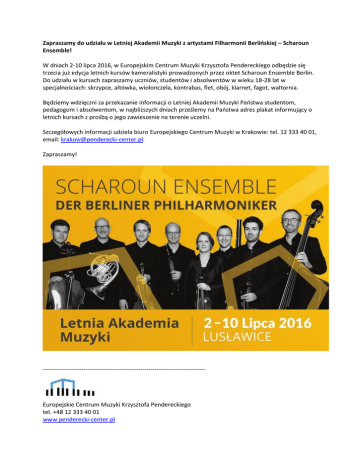 Zapraszamy do udziału w Letniej Akademii Muzyki z artystami Filharmonii Berlińskiej – Scharoun Ensemble! W dniach 2-10 lipca 2016, w Europejskim Centrum Muzyki Krzysztofa Pendereckiego odbędzie się trzecia już edycja letnich kursów kameralistyki prowadzonych przez oktet Scharoun Ensemble Berlin. Do udziału w kursach zapraszamy uczniów, studentów i absolwentów w wieku 18-28 lat w specjalnościach: skrzypce, altówka, wiolonczela, kontrabas, flet, obój, klarnet, fagot, waltornia. Będziemy wdzięczni za przekazanie informacji o Letniej Akademii Muzyki Państwa studentom, pedagogom i absolwentom, w najbliższych dniach prześlemy na Państwa adres plakat informujący o letnich kursach z prośbą o jego zawieszenie na terenie uczelni. Szczegółowych informacji udziela biuro Europejskiego Centrum Muzyki w Krakowie: tel. 12 333 40 01, email: [email protected]. Zapraszamy! -------------------------------------------------------------------------------- Europejskie Centrum Muzyki Krzysztofa Pendereckiego tel. +48 12 333 40 01 www.penderecki-center.pl
