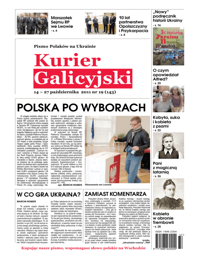 10 lat partnerstwa Opolszczyzny i Przykarpacia Marszałek Sejmu RP we Lwowie - s. 4 „Nowy” podręcznik historii Ukrainy - s. 16 - s. 8 pismo Polaków na Ukrainie kurier galicyjski O czym opowiedział Alfred? - s. 20 14 – 27 października 2011 nr 19 (143) POLSKA PO WYBORACH W ubiegłą niedzielę odbyły się w Polsce wybory parlamentarne. Obywatele RP wybierali 460 posłów do Sejmu i 100 senatorów, którzy zasiądą w Senacie RP. Frekwencja wyniosła 48,92%, co nad Wisłą jest wynikiem może nienajlepszym, ale też nie jest tragedią. Najlepszy wynik w wyborach do Sejmu uzyskała Platforma Obywatelska – 39,18% spośród oddanych, ważnych głosów, co przekłada się na 207 miejsc w izbie poselskiej. Drugie miejsce zajęła partia Prawo i Sprawiedliwość, która uzyskała 29,89% poparcia, przekładającego się na 157 mandatów poselskich. „Czarnym koniem” wyborów w Polsce okazał się być Ruch Poparcia Janusza Palikota, który zdobył 10,02% głosów i 40 mandatów w Sejmie. Jeszcze latem, na dostanie się do polskiego parlamentu nie dawano temu ugrupowaniu żadnych szans. Do Sejmu weszło też Polskie Stronnictwo Ludowe (z wynikiem 8,36% uzyskanych głosów i 28 mandatów) oraz Sojusz Lewicy Demokratycznej (8,24% uzyskanych głosów i 27 mandatów). Pozostałe, startujące w wyborach ugrupowania nie przekroczyły obowiązującego w Polsce 5% progu wyborczego. Na- tomiast 1 mandat poselski uzyskał przedstawiciel Mniejszości Niemieckiej, bowiem zgodnie z polskim prawem wyborczym, startujące w wyborach ugrupowania mniejszości narodowych zwolnione są z obowiązku przekroczenia progu wyborczego. W wyborach do Senatu RP, Platforma Obywatelska zdobyła 63 mandaty, Prawo i Sprawiedliwość 31, a Polskie Stronnictwo Ludowe 2. Cztery mandaty uzyskali kandydaci niezależni. W tym roku, po raz pierwszy, wybory do Senatu RP odbyły się w okręgach jednomandatowych. W wyborach 9 października głosowali też obywatele RP, mieszkający lub przebywający poza granicami kraju. Na Ukrainie komisje wyborcze działały we wszystkich polskich placówkach dyplomatycznych i konsularnych. W sumie oddano w nich 913 ważnych głosów, z tego 403 we Lwowie i 282 w Kijowie. Według publicystów i komentatorów polskiej sceny politycznej, najbardziej prawdopodobnym scenariuszem w Polsce będzie utrzymanie dotychczasowej koalicji rządowej PO – PSL. opr. MARCIN ROMER Kobyła, suka i kobieta z psami - s. 22 Pani z magiczną latarnią - s. 26 Głosowanie we Lwowie W CO GRA UKRAINA? ZAMIAST KOMENTARZA MARCIN ROMER To pytanie często stawiali mi dotąd moi koledzy i przyjaciele z Polski. Ostatnio jednak, coraz częściej słyszę je na Ukrainie. Do tego od ludzi o bardzo różnych, czasami przeciwstawnych poglądach. To zjawisko naprawdę niepokojące. To, że Zachód, w tym UE, nie do końca rozumie swego ukraińskiego partnera, można uznać za zjawisko w miarę naturalne. Wiedza o tej części świata wśród większości zachodnich społeczeństw, a także tamtejszych mediów i większej części klasy politycznej, jest bowiem często śladowa. Także i rosyjskie klisze nie pasu- ją. Próba nałożenia ich na ukraińską mozaikę bardzo często zawodzi. Jeśli jednak pytania takie zaczynają zadawać także obywatele Ukrainy, sprawa wydaje się niepokojąca. Świadczy to, że pytanie wstępne jest najwyraźniej źle postawione. To nie jest gra Ukrainy, ukraińskiego społeczeństwa, ukraińskich elit intelektualnych, a pewnie nawet nie gra ukraińskiej klasy politycznej. A więc czyja??? Odpowiedź da nam przyszłość, ale najgorszym scenariuszem, który mógłby być zrealizowany – to odrzucenie ukraińskich aspiracji przez Europę. A pretekst, trzeba przyznać, jest wyśmienity… Prezydent Ukrainy Wiktor Janukowycz, przebywając w czwartek, 13.10 w Kamieńcu Podolskim, przyznał na spotkaniu z dziennikarzami, że ustawodawstwo Ukrainy nie odpowiada europejskim standardom. – „Dziś, gdy ta kwestia wynikła tak ostro (w związku ze sprawą Julii Tymoszenko – red.), wszyscy zwrócili uwagę, że ustawodawstwo nie odpowiada europejskim standardom, procedury nie odpowiadają, samo prawo też i ten paragraf 365, który w świecie, w wielu państwach, został odniesiony do przewinień administracyjnych lub kwestii politycznych. Jeżeli spytacie mnie czy zgadzam się z taką oceną?, – bezsprzecznie, zgadzam się,” – powiedział prezydent. Janukowycz wspomniał przy tym, że już przed rokiem została powołana grupa robocza w celu zreformowania Kodeksu Karnego i wyraził nadzieję, że po uzyskaniu rekomendacji struktur europejskich, nowy kodeks będzie niezwłocznie rozpatrzony i przyjęty przez Radę Najwyższą. Prezydent wspomniał też, że reforma kodeksu karnego była jednym ze zobowiązań, przyjętych przez Ukrainę przy wejściu do Rady Europy. Prezydent wyjaśnił następnie, że ewentualna apelacja w sprawie wyroku na Tymoszenko może być rozpatrywana na podstawie nowego, zmienianego obecnie kodeksu karnego. „Nie ma wątpliwości, że sprawa Tymoszenko jest specyficzna i przyciąga wiele uwagi, ale sąd apelacyjny będzie ją rozpatrywał według prawa, które będzie obowiązywało w czasie rozprawy apelacyjnej” – powiedział. źródło: „Ukraińskie nowiny”, PAP Kupując nasze pismo, wspomagasz słowo polskie na Wschodzie Kobieta w obronie Trembowli - s. 28 Przegląd wydarzeń 2 kurier galicyjski * 14 – 27 października 2011 nr 19 (143) SZCZYT ROZCZAROWANIA AGNIESZKA SAWICZ tekst www.president.gov.ua zdjęcie Szczyt Partnerstwa Wschodniego, który odbył się w dniach 29-30 września 2011 roku w Warszawie, stał się wydarzeniem, wobec którego były wielkie oczekiwania, jako najważniejszego politycznego spotkania podczas polskiej prezydencji w Unii Europejskiej. A tymczasem pozostało po nim, jak podkreślają media w ślad za politykami, równie wielkie rozczarowanie. I nie tylko dlatego, że obrady zbojkotowali Białorusini, których ambasador naw