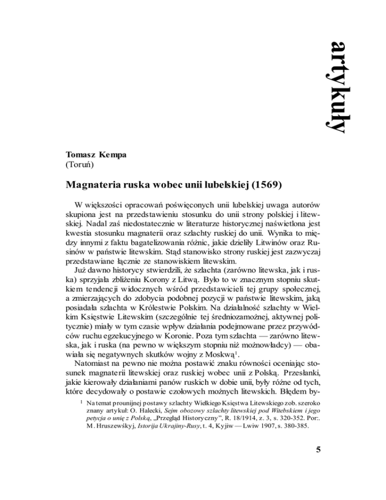 artykuły Tomasz Kempa (Toruń) Magnateria ruska wobec unii lubelskiej (1569) W większości opracowań poświęconych unii lubelskiej uwaga autorów skupiona jest na przedstawieniu stosunku do unii strony polskiej i litewskiej. Nadal zaś niedostatecznie w literaturze historycznej naświetlona jest kwestia stosunku magnaterii oraz szlachty ruskiej do unii. Wynika to między innymi z faktu bagatelizowania różnic, jakie dzieliły Litwinów oraz Rusinów w państwie litewskim. Stąd stanowisko strony ruskiej jest zazwyczaj przedstawiane łącznie ze stanowiskiem litewskim. Już dawno historycy stwierdzili, że szlachta (zarówno litewska, jak i ruska) sprzyjała zbliżeniu Korony z Litwą. Było to w znacznym stopniu skutkiem tendencji widocznych wśród przedstawicieli tej grupy społecznej, a zmierzających do zdobycia podobnej pozycji w państwie litewskim, jaką posiadała szlachta w Królestwie Polskim. Na działalność szlachty w Wielkim Księstwie Litewskim (szczególnie tej średniozamożnej, aktywnej politycznie) miały w tym czasie wpływ działania podejmowane przez przywódców ruchu egzekucyjnego w Koronie. Poza tym szlachta — zarówno litewska, jak i ruska (na pewno w większym stopniu niż możnowładcy) — obawiała się negatywnych skutków wojny z Moskwą1 . Natomiast na pewno nie można postawić znaku równości oceniając stosunek magnaterii litewskiej oraz ruskiej wobec unii z Polską. Przesłanki, jakie kierowały działaniami panów ruskich w dobie unii, były różne od tych, które decydowały o postawie czołowych możnych litewskich. Błędem by1 Na temat prounijnej postawy szlachty Wielkiego Księstwa Litewskiego zob. szeroko znany artykuł: O. Halecki, Sejm obozowy szlachty litewskiej pod Witebskiem i jego petycja o unię z Polską, „Przegląd Historyczny”, R. 18/1914, z. 3, s. 320-352. Por:. M . Hruszewśkyj, Istorija Ukrajiny-Rusy, t. 4, Kyjiw — Lwiw 1907, s. 380-385. 5 łoby zresztą także niedostrzeganie różnic dzielących czołowych przedstawicieli litewskiej elity politycznej w kwestii unijnej. Podobnie stanowisko samych tylko ruskich możnych trudno uznać za jednolite. Kogo więc można uznać za przedstawiciela ruskiej części możnowładztwa w państwie litewskim? Odpowiedź na tak postawione pytanie wymaga określenia kryteriów przynależności do tej grupy. Zgodnie z ówczesnym rozumieniem tego pojęcia, przyjąłem za g ł ó w n y wyznacznik przynależności do tej grupy czynnik wyznaniowy2 . A więc za przedstawicieli magnaterii ruskiej uważam magnatów prawosławnych, także tych pochodzenia litewskiego, którzy od dawna pozostawali wyznawcami prawosławia. W związku z tym do możnowładztwa ruskiego zaliczam między innymi kniaziów słuckich Olelkowiczów. Tak traktowali przedstawicieli tego rodu, wywodzącego się od Giedymina, na przykład Radziwiłłowie3 . Oczywiście w odniesieniu do okresu, w którym tak szybko rozwijała się w Wielkim Księstwie Litewskim reformacja, kryterium wyznaniowe nie może nam wystarczyć. Pamiętać bowiem trzeba, że pewna grupa możnych ruskich4 przeszła wówczas na wyznania protestanckie (głównie kalwinizm). Porzucenie prawosławia czy to na rzecz reformacji, czy wkrótce też na rzecz katolicyzmu, prowadziło z reguły do polonizacji magnaterii ruskiej. Jednak lata 60. XVI wieku stanowią nadal jeszcze fazę początkową tego procesu. Wszakże spektakularne akty konwersji na wyznania ewangelickie wśród możnych w Wielkim Księstwie Litewskim miały miejsce od połowy lat 50. Dopiero w związku z dalszym rozwojem reformacji oraz unią brzeską można mówić o „kształtowaniu się wyobrażenia, iż tożsamość ruska nie jest tym samym co tożsamość prawosławna”5 . 2 3 4 5 6 Zgadzam się (w odniesieniu do interesującego nas okresu historycznego) z twierdzeniem Jana Jakubowskiego, iż „przedział, jaki istniał dawniej pomiędzy rdzenną Litwą a Rusią opierał się nie tyle na odrębności etnicznej i językowej, co na różnicy wyznania”. Dopiero rozwój reformacji wyraźnie skomplikował tę sytuację , J. Jakubowski, Studia nad stosunkami narodowościowemi na Litwie przed Unią Lubelską, Warszawa 1912, s. 62. Określenia „Grek” użył w stosunku do ks. słuckiego Jerzego M ikołaj Krzysztof Radziwiłł „Sierotka”, zob.: M . K. Radziwiłł do M . Radziwiłła 29 lipca 1572 r. z Knyszyna, A. Traczewskij, Polskoje biezkorolewije po priekraszczenii dinastii Jagiełłonow, M oskwa 1869, dodatki, nr 6, s. 96. Por.: T. Chynczewska-Hennel, Świadomość narodowa szlachty ukraińskiej i kozackiej od schyłku XVI do połowy XVII wieku, Warszawa 1985, s. 115. Warto jednak zauważyć, iż niewielu magnatów ruskich pochodzących z południowych ziem ruskich w składzie państwa litewskiego (a więc tych słabiej zespolonych z Wielkim Księstwem Litewskim) przeszło na wyznania protestanckie. Większość konwersji dotyczyła przedstawicieli litewskich rodów p ochodzących z centralnej Litwy, którzy wcześniej stali się wyznawcami prawosławia, np. Chodkiewiczów, Sapiehów, Hornostajów, Hlebowiczów. J. Borzęcki, Unia lubelska jako czynnik kształtowania się ukraińskiej świadomości narodowej, [w:] Unia lubelska i tradycje integracyjne w Europie środkowo-wschod- Istotnym kryterium pozwalającym wyodrębnić grupę ruskich magnatów stanowi również czynnik pochodzenia, a więc możliwość określenia, na jakim obszarze mieściły się pierwotne gniazda rodowe możnych rodzin. Część ziem ruskich, które wcześniej znalazły się w składzie Wielkiego Księstwa Litewskiego (Ruś Czarna i Ruś Biała), były silniej złączone z państwowością litewską. Pozostałe ziemie ruskie w granicach państwa litewskiego (Wołyń, Kijowszczyzna, wschodnie Podole) były dużo słabiej zespolone z Litwą i długo zachowywały pewne odrębności ustrojowe. Szczególnie dotyczy to Wołynia, gdzie jeszcze do połowy XVI wieku zbierały się oddzielne „sojmy” miejscowy