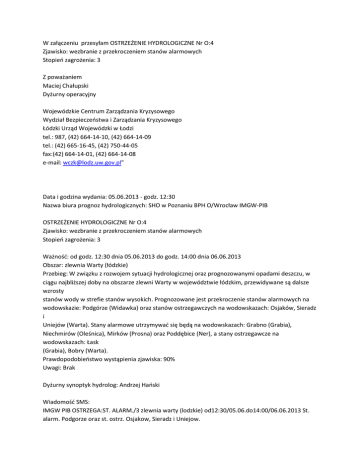W załączeniu przesyłam OSTRZEŻENIE HYDROLOGICZNE Nr O:4 Zjawisko: wezbranie z przekroczeniem stanów alarmowych Stopień zagrożenia: 3 Z poważaniem Maciej Chałupski Dyżurny operacyjny Wojewódzkie Centrum Zarządzania Kryzysowego Wydział Bezpieczeństwa i Zarządzania Kryzysowego Łódzki Urząd Wojewódzki w Łodzi tel.: 987, (42) 664-14-10, (42) 664-14-09 tel.: (42) 665-16-45, (42) 750-44-05 fax:(42) 664-14-01, (42) 664-14-08 e-mail: [email protected]" Data i godzina wydania: 05.06.2013 - godz. 12:30 Nazwa biura prognoz hydrologicznych: SHO w Poznaniu BPH O/Wrocław IMGW-PIB OSTRZEŻENIE HYDROLOGICZNE Nr O:4 Zjawisko: wezbranie z przekroczeniem stanów alarmowych Stopień zagrożenia: 3 Ważność: od godz. 12:30 dnia 05.06.2013 do godz. 14:00 dnia 06.06.2013 Obszar: zlewnia Warty (łódzkie) Przebieg: W związku z rozwojem sytuacji hydrologicznej oraz prognozowanymi opadami deszczu, w ciągu najbliższej doby na obszarze zlewni Warty w województwie łódzkim, przewidywane są dalsze wzrosty stanów wody w strefie stanów wysokich. Prognozowane jest przekroczenie stanów alarmowych na wodowskazie: Podgórze (Widawka) oraz stanów ostrzegawczych na wodowskazach: Osjaków, Sieradz i Uniejów (Warta). Stany alarmowe utrzymywać się będą na wodowskazach: Grabno (Grabia), Niechmirów (Oleśnica), Mirków (Prosna) oraz Poddębice (Ner), a stany ostrzegawcze na wodowskazach: Łask (Grabia), Bobry (Warta). Prawdopodobieństwo wystąpienia zjawiska: 90% Uwagi: Brak Dyżurny synoptyk hydrolog: Andrzej Hański Wiadomość SMS: IMGW PIB OSTRZEGA:ST. ALARM./3 zlewnia warty (lodzkie) od12:30/05.06.do14:00/06.06.2013 St. alarm. Podgorze oraz st. ostrz. Osjakow, Sieradz i Uniejow.