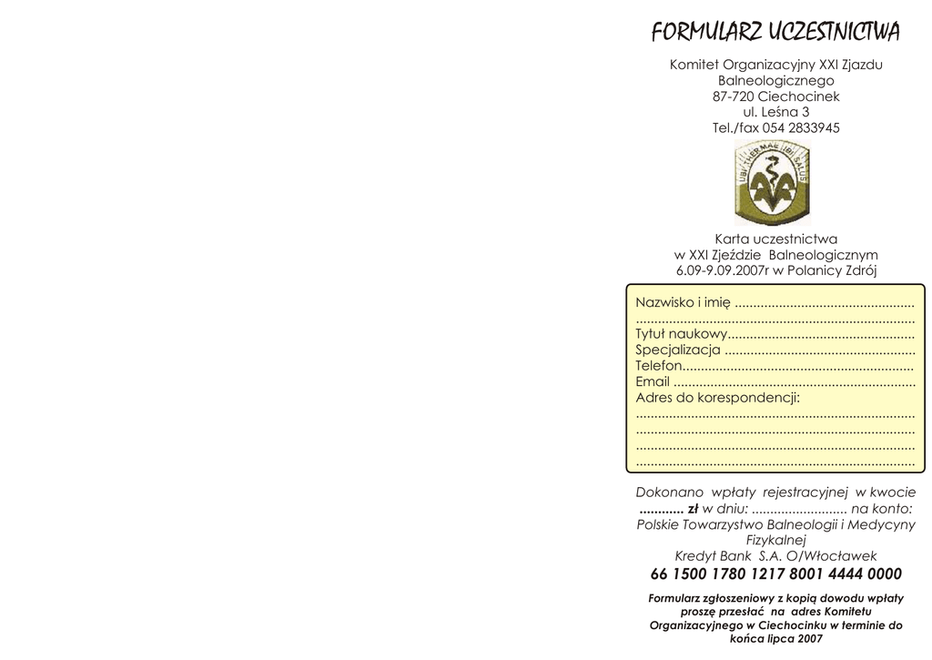 FORMULARZ UCZESTNICTWA Komitet Organizacyjny XXI Zjazdu Balneologicznego 87-720 Ciechocinek ul. Leśna 3 Tel./fax 054 2833945 Karta uczestnictwa w XXI Zjeździe Balneologicznym 6.09-9.09.2007r w Polanicy Zdrój Nazwisko i imię ................................................. ............................................................................ Tytuł naukowy................................................... Specjalizacja .................................................... Telefon............................................................... Email .................................................................. Adres do korespondencji: ............................................................................ ............................................................................ ............................................................................ ............................................................................ Dokonano wpłaty rejestracyjnej w kwocie ............ zł w dniu: .......................... na konto: Polskie Towarzystwo Balneologii i Medycyny Fizykalnej Kredyt Bank S.A. O/Włocławek 66 1500 1780 1217 8001 4444 0000 Formularz zgłoszeniowy z kopią dowodu wpłaty proszę przesłać na adres Komitetu Organizacyjnego w Ciechocinku w terminie do końca lipca 2007