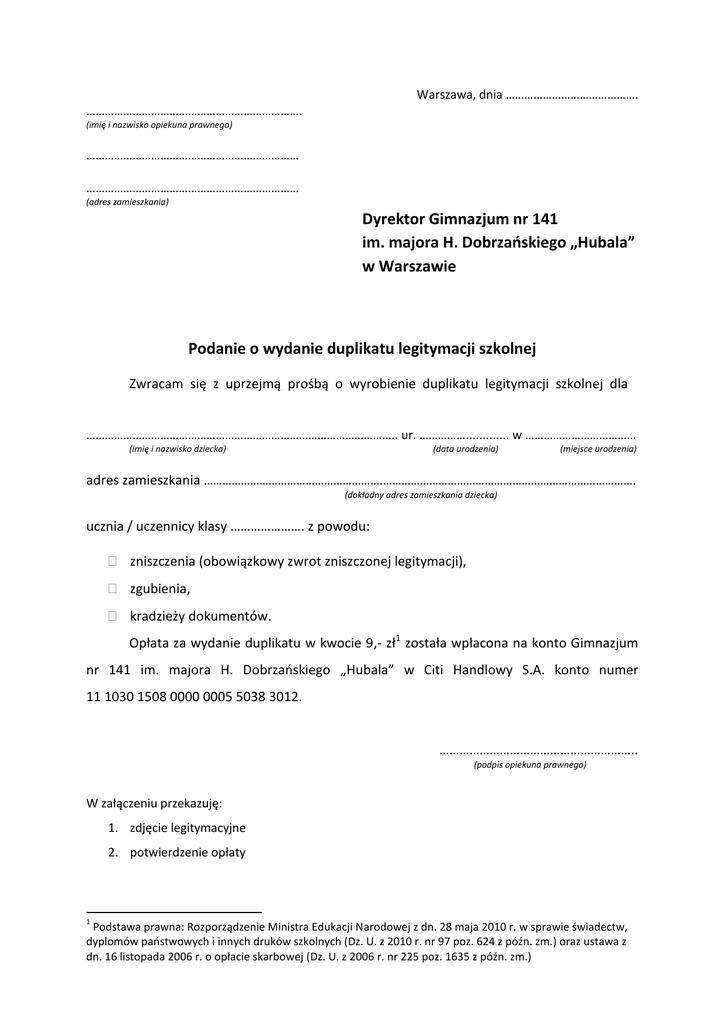 Warszawa, dnia ……………………………………. ……………………………………………………………. (imię i nazwisko opiekuna prawnego) …………………………………………………………… …………………………………………………………… (adres zamieszkania) Dyrektor Gimnazjum nr 141 im. majora H. Dobrzańskiego „Hubala” w Warszawie Podanie o wydanie duplikatu legitymacji szkolnej Zwracam się z uprzejmą prośbą o wyrobienie duplikatu legitymacji szkolnej dla ……………………………………………………………………………………….. ur. ……………............. w ……………………………… (imię i nazwisko dziecka) (data urodzenia) (miejsce urodzenia) adres zamieszkania ………………………………………………….………………………………………………………………………. (dokładny adres zamieszkania dziecka) ucznia / uczennicy klasy …………………. z powodu: zniszczenia (obowiązkowy zwrot zniszczonej legitymacji), zgubienia, kradzieży dokumentów. Opłata za wydanie duplikatu w kwocie 9,- zł1 została wpłacona na konto Gimnazjum nr 141 im. majora H. Dobrzaoskiego „Hubala” w Citi Handlowy S.A. konto numer 11 1030 1508 0000 0005 5038 3012. ………………………………………………….. (podpis opiekuna prawnego) W załączeniu przekazuję: 1. zdjęcie legitymacyjne 2. potwierdzenie opłaty 1 Podstawa prawna: Rozporządzenie Ministra Edukacji Narodowej z dn. 28 maja 2010 r. w sprawie świadectw, dyplomów paostwowych i innych druków szkolnych (Dz. U. z 2010 r. nr 97 poz. 624 z późn. zm.) oraz ustawa z dn. 16 listopada 2006 r. o opłacie skarbowej (Dz. U. z 2006 r. nr 225 poz. 1635 z późn. zm.)