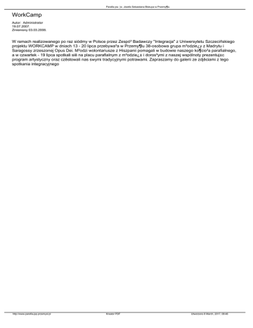 Parafia pw. ¦w. Józefa Sebastiana Biskupa w Przemy¶lu WorkCamp Autor: Administrator 19.07.2007. Zmieniony 03.03.2008. W ramach realizowanego po raz siódmy w Polsce przez Zespó³ Badawczy "Integracja" z Uniwersytetu Szczeciñskiego projektu WORKCAMP w dniach 13 - 20 lipca przebywa³a w Przemy¶lu 38-osobowa grupa m³odzie¿y z Madrytu i Saragossy zrzeszonej Opus Dei. M³odzi wolontariusze z Hiszpanii pomagali w budowie naszego ko¶cio³a parafialnego, a w czwartek - 19 lipca spotkali siê na placu parafialnym z m³odzie¿± i doros³ymi z naszej wspólnoty prezentuj±c program artystyczny oraz czêstowali nas swymi tradycyjnymi potrawami. Zapraszamy do galerii ze zdjêciami z tego spotkania integracyjnego http://www.parafia-jsp.przemysl.pl Kreator PDF Utworzono 8 March, 2017, 08:46