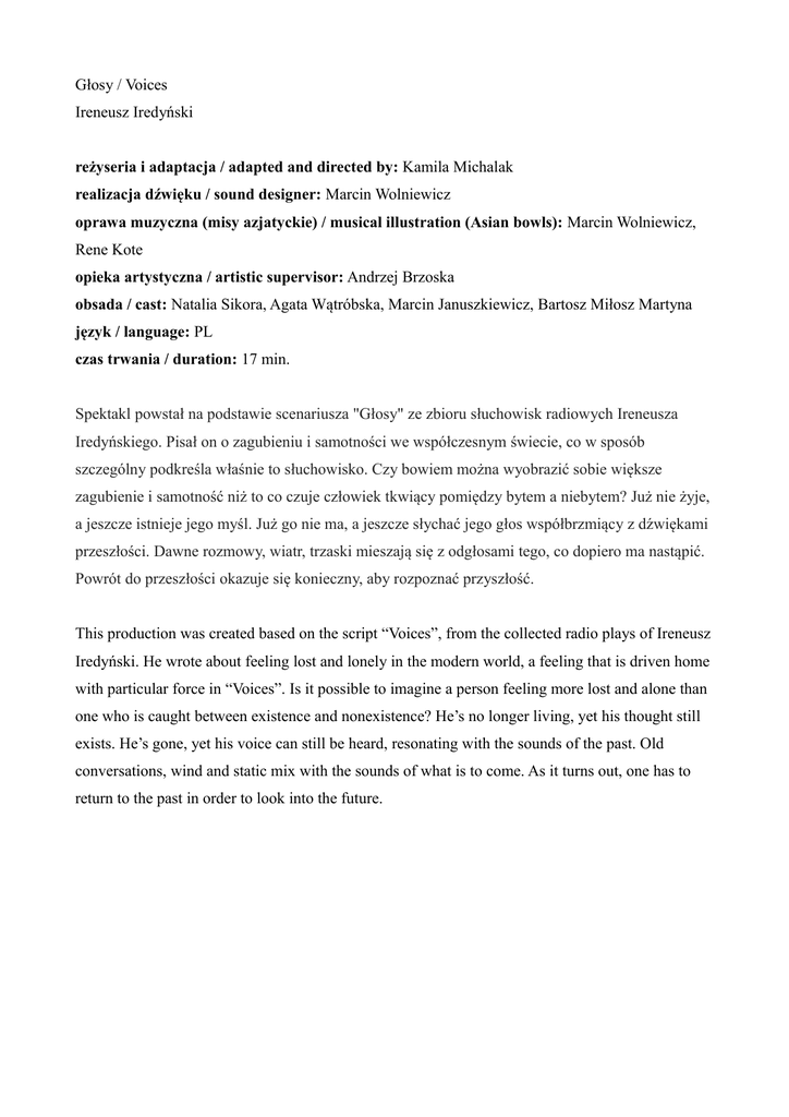 Głosy / Voices Ireneusz Iredyński reżyseria i adaptacja / adapted and directed by: Kamila Michalak realizacja dźwięku / sound designer: Marcin Wolniewicz oprawa muzyczna (misy azjatyckie) / musical illustration (Asian bowls): Marcin Wolniewicz, Rene Kote opieka artystyczna / artistic supervisor: Andrzej Brzoska obsada / cast: Natalia Sikora, Agata Wątróbska, Marcin Januszkiewicz, Bartosz Miłosz Martyna język / language: PL czas trwania / duration: 17 min. Spektakl powstał na podstawie scenariusza "Głosy" ze zbioru słuchowisk radiowych Ireneusza Iredyńskiego. Pisał on o zagubieniu i samotności we współczesnym świecie, co w sposób szczególny podkreśla właśnie to słuchowisko. Czy bowiem można wyobrazić sobie większe zagubienie i samotność niż to co czuje człowiek tkwiący pomiędzy bytem a niebytem? Już nie żyje, a jeszcze istnieje jego myśl. Już go nie ma, a jeszcze słychać jego głos współbrzmiący z dźwiękami przeszłości. Dawne rozmowy, wiatr, trzaski mieszają się z odgłosami tego, co dopiero ma nastąpić. Powrót do przeszłości okazuje się konieczny, aby rozpoznać przyszłość. This production was created based on the script “Voices”, from the collected radio plays of Ireneusz Iredyński. He wrote about feeling lost and lonely in the modern world, a feeling that is driven home with particular force in “Voices”. Is it possible to imagine a person feeling more lost and alone than one who is caught between existence and nonexistence? He’s no longer living, yet his thought still exists. He’s gone, yet his voice can still be heard, resonating with the sounds of the past. Old conversations, wind and static mix with the sounds of what is to come. As it turns out, one has to return to the past in order to look into the future.