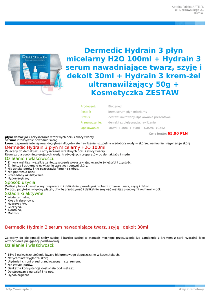 Apteka Polska APTE.PL ul. Derdowskiego 21 Rumia Dermedic Hydrain 3 płyn micelarny H2O 100ml + Hydrain 3 serum nawadniające twarz, szyję i dekolt 30ml + Hydrain 3 krem-żel ultranawilżający 50g + Kosmetyczka ZESTAW Producent: Biogened Postać: krem,serum,płyn micelarny Status: Zestaw limitowany,Opakowanie prezentowe Przeznaczenie: demakijaż,pielęgnacja,nawilżanie Opakowanie: 100ml + 30ml + 50ml + KOSMETYCZKA Cena brutto: 65,90 PLN płyn: demakijaż i oczyszczanie wrażliwych oczu i skóry twarzy serum: intensywnie nawadnia skórę krem: zapewnia intensywne, dogłębne i długotrwałe nawilżenie, uzupełnia niedobory wody w skórze, wzmacnia i regeneruje skórę Dermedic Hydrain 3 płyn micelarny H2O 100ml Zalecany do demakijażu i oczyszczania wrażliwych oczu i skóry twarzy. Również dla osób nietolerujących wody, tradycyjnych preparatów do demakijażu i mydeł. Działanie i właściwości: Zmywa makijaż i wszelkie zanieczyszczenia pozostawiając uczucie świeżości i czystości. Zmiękcza i utrzymuje nawilżenie warstwy rogowej skóry. Nie zatyka porów i nie pozostawia filmu na skórze. Nie podrażnia oczu. Przebadany okulistycznie. Hypoalergiczny. Sposób użycia: Zwilżyć płatek kosmetyczny preparatem i delikatnie, powolnymi ruchami zmywać twarz, szyję i dekolt. Do oczu przyłożyć wilgotny płatek, chwilę przytrzymać i delikatnie zmywać makijaż pionowymi ruchami w dół. Składniki aktywne: Woda termalna, Kwas hialuronowy, Hydroveg VV, Gliceryna, Alantoina, Mocznik. Dermedic Hydrain 3 serum nawadniające twarz, szyję i dekolt 30ml Zalecany do pielęgnacji skóry suchej i bardzo suchej w stanach mocnego przesuszenia lub zamiennie z kremem z serii Hydrain3 jako wzmocnienie pielęgnacji podstawowej. Działanie i właściwości: 15% ? najwyższe stężenie kwasu hialuronowego dopuszczalne w kosmetykach. Natychmiast wygładza skórę. Ujędrnia i chroni przed przedwczesnym starzeniem. Nie zatyka porów. Delikatna konsystencja doskonała pod makijaż. Do stosowania na dzień i na noc. Hypoalergiczne. http://www.apte.pl sklep internetowy Apteka Polska APTE.PL ul. Derdowskiego 21 Rumia Sposób użycia: Nanieść na twarz, szyję i dekolt równomierną warstwę preparatu i pozostawić do wchłonięcia. Składniki aktywne: Woda termalna, Kwas hialuronowy 15%, Olej migdałowy, Witamina E, Gliceryna, Phytosqualan ? Skwalan. Dermedic Hydrain 3 krem-żel ultranawilżający 50g Zalecany do każdego rodzaju skóry wymagającej nawilżenia, w tym skóry trądzikowej, oraz w trakcie terapii dermatologicznych. Działanie i właściwości: Zapewnia intensywne, dogłębne i długotrwałe nawilżenie odczuwalne przez 48 godzin po zastosowaniu. Uzupełnia niedobory wody w skórze i ogranicza jej transepidermalną utratę (TEWL). Wzmacnia i regeneruje skórę. Do każdego rodzaju skóry wymagającej nawilżenia. Lekka, nietłusta, kremowo-żelowa konsystencja. Doskonały pod makijaż. Nie zatyka porów. Sposób użycia: Nanieść na twarz, szyję i dekolt równomierną warstwę preparatu i pozostawić do wchłonięcia. Składniki aktywne: Woda termalna, Kwas hialuronowy, AqualareTM, Mocznik-UREA, Gliceryna, Dub Diol, Betaina, Phytosqualan ? Skwalan, Witamina E. http://www.apte.pl sklep internetowy