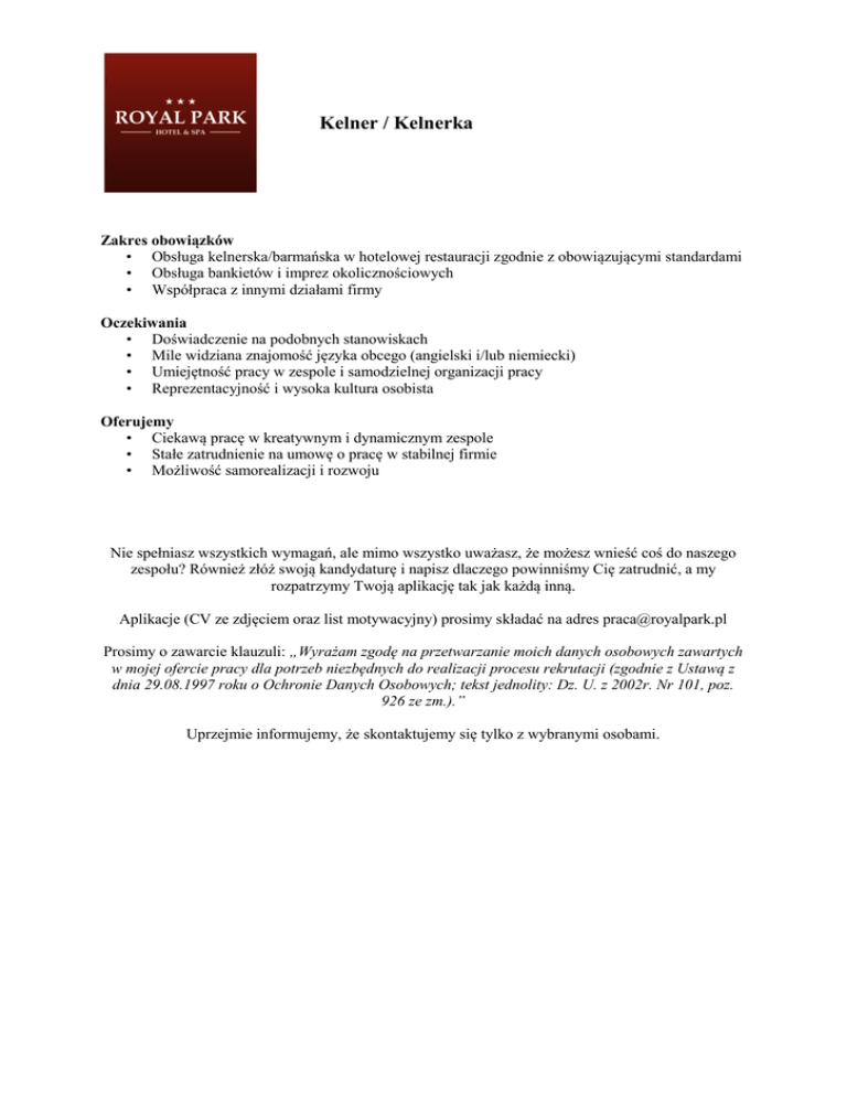 Kelner / Kelnerka Zakres obowiązków • Obsługa kelnerska/barmańska w hotelowej restauracji zgodnie z obowiązującymi standardami • Obsługa bankietów i imprez okolicznościowych • Współpraca z innymi działami firmy Oczekiwania • Doświadczenie na podobnych stanowiskach • Mile widziana znajomość języka obcego (angielski i/lub niemiecki) • Umiejętność pracy w zespole i samodzielnej organizacji pracy • Reprezentacyjność i wysoka kultura osobista Oferujemy • Ciekawą pracę w kreatywnym i dynamicznym zespole • Stałe zatrudnienie na umowę o pracę w stabilnej firmie • Możliwość samorealizacji i rozwoju Nie spełniasz wszystkich wymagań, ale mimo wszystko uważasz, że możesz wnieść coś do naszego zespołu? Również złóż swoją kandydaturę i napisz dlaczego powinniśmy Cię zatrudnić, a my rozpatrzymy Twoją aplikację tak jak każdą inną. Aplikacje (CV ze zdjęciem oraz list motywacyjny) prosimy składać na adres [email protected] Prosimy o zawarcie klauzuli: „Wyrażam zgodę na przetwarzanie moich danych osobowych zawartych w mojej ofercie pracy dla potrzeb niezbędnych do realizacji procesu rekrutacji (zgodnie z Ustawą z dnia 29.08.1997 roku o Ochronie Danych Osobowych; tekst jednolity: Dz. U. z 2002r. Nr 101, poz. 926 ze zm.).” Uprzejmie informujemy, że skontaktujemy się tylko z wybranymi osobami.