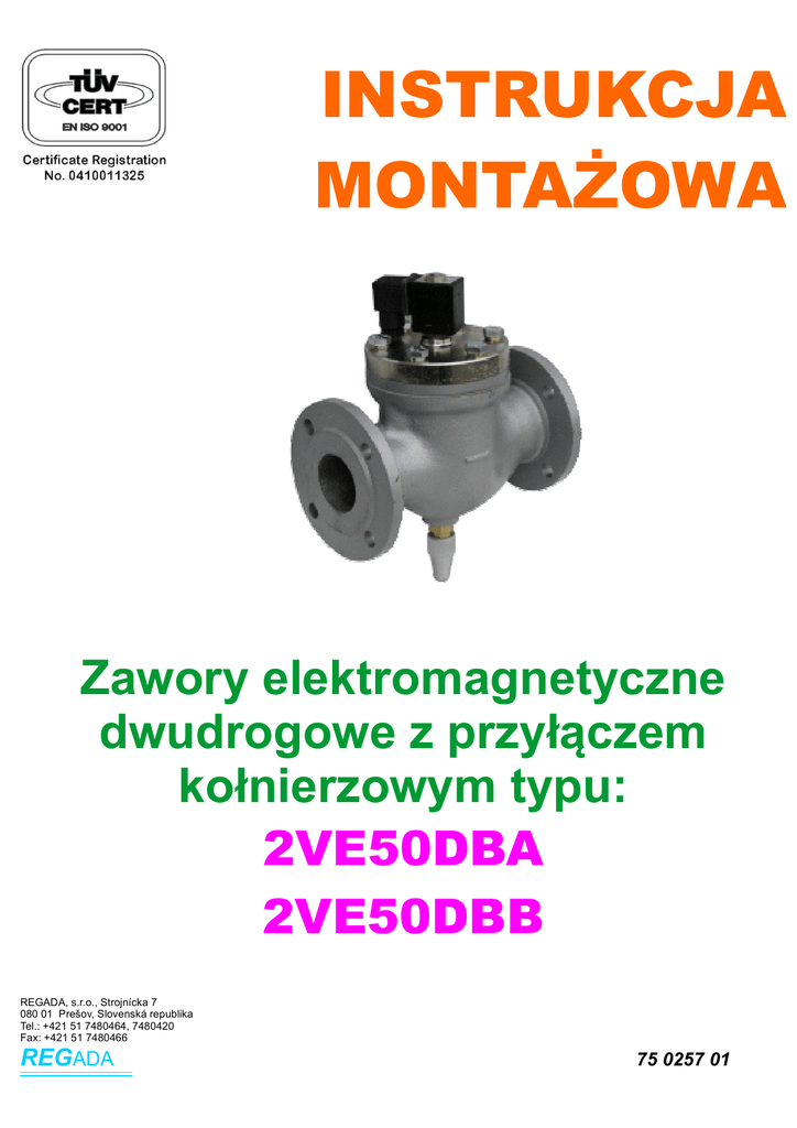 INSTRUKCJA MONTAŻOWA Zawory elektromagnetyczne dwudrogowe z przyłączem kołnierzowym typu: 2VE50DBA 2VE50DBB REGADA, s.r.o., Strojnícka 7 080 01 Prešov, Slovenská republika Tel.: +421 51 7480464, 7480420 Fax: +421 51 7480466 REGADA 75 0257 01 2VE50DBA; 2VE50DBB Instrukcja montażowa Zawory elektromagnetyczne dwudrogowe typu 2VE50DBA stosuje się do dwupołożeniowej regulacji przepływem gazów, natomiast zawory typu 2VE50DBB stosuje się do dwupołożeniowej regulacji przepływem płynów. Sygnałem sterującym zaworem jest lub płynów. Sygnałem sterującym zaworem jest sygnał elektryczny. 2 Parametry techniczne Prześwit znamionowy ….........................…… DN 50 Max. ciśnienie robocze (pp)……........……….. 1 MPa Min. ciśnienie robocze ……………………….. od 0,05 MPa do 1 MPa dla zaworu 2VE50DBA od 0,1 MPa do 1 MPa dla zaworu 2VE50DBB Max. częstotliwość załączeń .....……………. 10 załączeń/min. Przepływające medium……….………………. gazy i płyny które nie wchodzą w reakcje z materiałami użytymi do budowy zaworu Materiały użyte do budowy zaworu Korpus, przyłącze ………........….……………. żeliwo Trzpień, prowadnica trzpienia, gniazdo, nity, sprężyna .............................................… stal nierdzewna Uszczelka, membrana…..………………......... NBR 80 Tłok ................................................................ mosiądz Przyłącze 2VE50DBA .................................... aluminium 2VE50DBB .................................... mosiądz Pobór mocy cewki …………………………..… 15 VA; 10W Napięcie zasilania…….....……………………. wg zamówienia podane na tab. znamionowej Obciążenie cewki.......................................…. ciągłe Temperatura otoczenia ................................. od 0 °C do +50 °C Temperatura medium ....……………………… max. 60°C Przyłącze ....................................................... kołnierzowe 3 Budowa i opis działania Zawór zbudowany jest z korpusu (9), przyłącza kołnierzowego (6), we wnętrzu zaworu znajduje się tłok (8) sterujący przepływem medium i cewki sterującej (1). Sterowane medium podawane jest do zaworu przez otwór w tłoku do przestrzeni nad tłokiem, która jest połączona z przestrzenią trzpienia sterującego elektrozaworu, zawór jest zamknięty. Po podaniu zasilania na cewkę elektrozaworu trzpień sterujący elektromagnesu przesunie się do góry i otworzy przepływ medium, ciśnienie nad tłokiem zrówna się z ciśnieniem pod tłokiem umożliwiając przepływ medium. Zawór do otwarcia i poprawnej pracy potrzebuje miedzy wejściem i wyjściem różnicę ciśnień. 2 Instrukcja montażowa 2VE50DBA; 2VE50DBB Legenda: 1 - cewka 2 - prowadnica trzpienia 3 - trzpień 4 - uszczelka 5 - membrana 6 - kołnierz przyłączeniowy 7 - prowadnica łożyskowana 8 - tłok 9 - korpus 10 - sterowanie ręczne 11,12 - „O” ring 14 - manszeta 3 2VE50DBA; 2VE50DBB Instrukcja montażowa 4 Montaż - Zawory można montować w położeniu z cewką do góry. Dopuszczalna odchyłka od standardowego położenia 15°. - Medium musi płynąć w kierunku oznaczonym na zaworze strzałką. - Cewka elektrozaworu nie może być pod napięciem w czasie montażu zaworu. - Cewka elektrozaworu nie może być zasilana innym napięciem niż podane na tabliczce znamionowej. - Złączka konektorowa ma dwa zaciski na podłażenie napięcia zasilania i jedną do podłączenia przewodu ochronnego - Złączka konektorowa ma wyprowadzenie przewodów na zewnątrz przepustem P9. Istnieje możliwość obrócenia złączki o 4 x 90°. Cewkę na zaworze po zluzowaniu nakrętki na osłonie trzpienia można dowolnie obracać o kąt 360°. - Instalacja elektryczna powinna spełniać wymogi norm STN EN 341010. - Aby uchronić zawór od zanieczyszczeń mechanicznych powinno się założyć przed elektrozaworem filtr mechaniczny (wymiar oczka 0,2 x 0,2 mm). 5 Przygotowanie do pracy Przed podaniem ciśnienia do rur na których zamontowany jest elektrozawór należy skontrolować poprawność montażu mechanicznego i elektrycznego. (po podłączeniu napięcia zasilania powinniśmy usłyszeć stukot przyciąganego trzpienia). Do prawidłowej pracy musi być zabezpieczony spadek ciśnienia, 0,05 MPa dla typu 2VE50DBA i 0,1 MPa dla typu 2VE50DBB. 6 Obsługa Po prawidłowym podłączeniu i sprawdzeniu poprawności działania zawór nie wymaga żadnej obsługi. W przypadku awarii zawór można sterować ręcznie nakrętką (10) znajdującą się pod zaworem. 7 Utrzymanie W przypadku złej pracy zaworu (nieszczelność, brak reakcji na podanie zasilania) można przejrzeć cały elektrozawór. Przyczyną usterek może być uszkodzenie cewki elektrycznej, uszczelki lub trzpienia zaworu. Wszystkie elementy zaworu są wymienne i można je wymienić na nowe. Przeglądów powinni dokonywać przeszkoleni pracownicy, po odłączeniu napięcia zasilania i zamknięciu dopływu medium do zaworu. 7 Części zamienne Części zamienne można zamawiać u producenta. W zamówieniu podać typ zaworu oraz nazwę części którą chcemy zamówić zgodnie z rysunkiem elektrozaworu oraz ilość jaką chcemy zamówić, w przypadku cewki napięcie zasilania. 8 Gwarancja. Producent udziela 12 miesięcznej gwarancji na sprawne działanie elektrozaworu. Wydanie: 10/2003 Zastrzegamy sobie prawo do zmian. 4 Numer ewidencyjny: 75 0262 01
