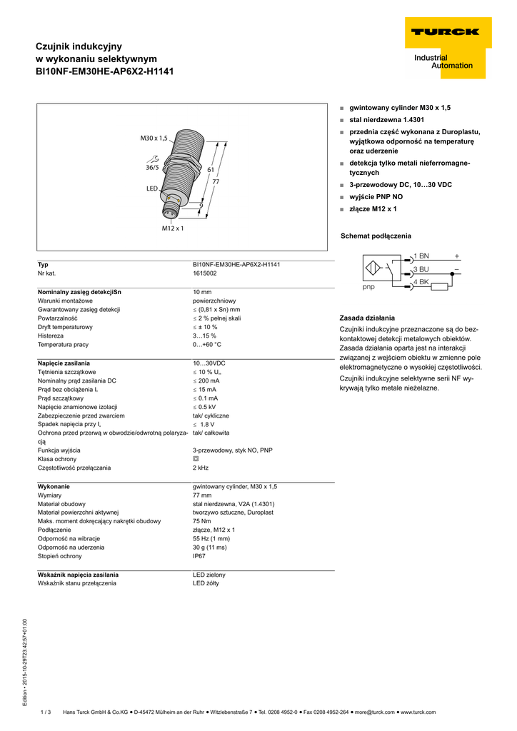 Czujnik indukcyjny w wykonaniu selektywnym BI10NF-EM30HE-AP6X2-H1141 ■ gwintowany cylinder M30 x 1,5 ■ stal nierdzewna 1.4301 ■ przednia część wykonana z Duroplastu, wyjątkowa odporność na temperaturę oraz uderzenie ■ detekcja tylko metali nieferromagnetycznych ■ 3-przewodowy DC, 10…30 VDC ■ wyjście PNP NO ■ złącze M12 x 1 Schemat podłączenia Typ Nr kat. BI10NF-EM30HE-AP6X2-H1141 1615002 Nominalny zasięg detekcjiSn Warunki montażowe Gwarantowany zasięg detekcji Powtarzalność Dryft temperaturowy Histereza Temperatura pracy 10 mm powierzchniowy ð (0,81 x Sn) mm ð 2 % pełnej skali ð ± 10 % 3…15 % 0…+60 °C Napięcie zasilania Tętnienia szczątkowe Nominalny prąd zasilania DC Prąd bez obciążenia I0 Prąd szczątkowy Napięcie znamionowe izolacji Zabezpieczenie przed zwarciem Spadek napięcia przy Ie Ochrona przed przerwą w obwodzie/odwrotną polaryzacją Funkcja wyjścia Klasa ochrony Częstotliwość przełączania 10…30VDC ð 10 % Uss ð 200 mA ð 15 mA ð 0.1 mA ð 0.5 kV tak/ cykliczne ð 1.8 V tak/ całkowita Wykonanie Wymiary Materiał obudowy Materiał powierzchni aktywnej Maks. moment dokręcający nakrętki obudowy Podłączenie Odporność na wibracje Odporność na uderzenia Stopień ochrony gwintowany cylinder, M30 x 1,5 77 mm stal nierdzewna, V2A (1.4301) tworzywo sztuczne, Duroplast 75 Nm złącze, M12 x 1 55 Hz (1 mm) 30 g (11 ms) IP67 Wskaźnik napięcia zasilania Wskaźnik stanu przełączenia LED zielony LED żółty Zasada działania Czujniki indukcyjne przeznaczone są do bezkontaktowej detekcji metalowych obiektów. Zasada działania oparta jest na interakcji związanej z wejściem obiektu w zmienne pole elektromagnetyczne o wysokiej częstotliwości. Czujniki indukcyjne selektywne serii NF wykrywają tylko metale nieżelazne. Edition • 2015-10-29T23:42:57+01:00 3-przewodowy, styk NO, PNP ÷ 2 kHz 1/3 Hans Turck GmbH & Co.KG ñ D-45472 Mülheim an der Ruhr ñ Witzlebenstraße 7 ñ Tel. 0208 4952-0 ñ Fax 0208 4952-264 ñ [email protected] ñ www.turck.com Czujnik indukcyjny w wykonaniu selektywnym BI10NF-EM30HE-AP6X2-H1141 2xB Dystans W 3 x Sn Dystans T 3xB Dystans S 1,5 x B Dystans G 6 x Sn Średnica powierzchni aktywnej B Ø 30 mm Edition • 2015-10-29T23:42:57+01:00 Dystans D 2/3 Hans Turck GmbH & Co.KG ñ D-45472 Mülheim an der Ruhr ñ Witzlebenstraße 7 ñ Tel. 0208 4952-0 ñ Fax 0208 4952-264 ñ [email protected] ñ www.turck.com Czujnik indukcyjny w wykonaniu selektywnym BI10NF-EM30HE-AP6X2-H1141 Akcesoria montażowe Typ Nr kat. QM-30 6945103 Rysunek wymiarowy element montażowy szybkiej instalacji z wymuszoną pozycją czujnika; materiał: chromowany mosiądz; gwint męski M36 x 1.5. Uwaga: Zakres detekcji czujników zbliżeniowych może zostać zredukowany, gdy stosowane są elementy montażowe szybkiej instalacji. BST-30B 6947216 Klamra montażowa z blokadą dla obudów cylindrycznych, gwintowanych; materiał: PA6 MW-30 6945005 Uchwyt montażowy dla obudów cylindrycznych, gwintowanych; materiał: Stal nierdzewna A2 1.4301 (AISI 304) BSS-30 6901319 Uchwyt montażowy dla obudów cylindrycznych, gładkich i Edition • 2015-10-29T23:42:57+01:00 gwintowanych; materiał: Polipropylen 3/3 Hans Turck GmbH & Co.KG ñ D-45472 Mülheim an der Ruhr ñ Witzlebenstraße 7 ñ Tel. 0208 4952-0 ñ Fax 0208 4952-264 ñ [email protected] ñ www.turck.com