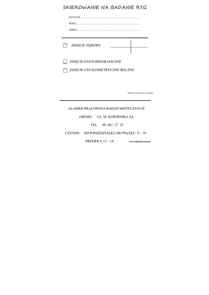 SKIEROWANIE NA BADANIE RTG PAN/PANI.................................................................................................. PESEL........................................................................................................ ADRES....................................................................................................... ZDJĘCIE ZĘBOWE ZDJĘCIE PANTOMOGRAFICZNE ZDJĘCIE CEFALOMETRYCZNE BOCZNE PODPIS I PIECZĄTKA LEKARZA ALAMED PRACOWNIA BADAŃ MEDYCZNYCH GRÓJEC UL. M. KOPERNIKA 8A TEL. CZYNNE: 48 661 27 33 OD PONIEDZIAŁKU DO PIĄTKU 9 – 18 PRZERWA 13 – 14 www.alamed.com.pl
