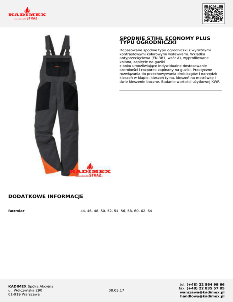 SPODNIE STIHL ECONOMY PLUS TYPU OGRODNICZKI Dopasowane spodnie typu ogrodniczki z wyraźnymi kontrastowymi kolorowymi wstawkami. Wkładka antyprzecięciowa (EN 381, wzór A), wyprofilowane kolana, zapięcie na guziki z boku umożliwiające indywidualne dostosowanie szerokości i rozporek zapinany na guziki. Praktyczne rozwiązania do przechowywania drobiazgów i narzędzi: kieszeń w klapie, kieszeń tylna, kieszeń na metrówkę i dwie kieszenie boczne. Badanie wartości użytkowej KWF. DODATKOWE INFORMACJE Rozmiar KADIMEX Spóka Akcyjna ul. Wólczyńska 290 01-919 Warszawa 44, 46, 48, 50, 52, 54, 56, 58, 60, 62, 64 08.03.17 tel. (+48) 22 864 99 66 fax. (+48) 22 835 57 85 [email protected] [email protected]
