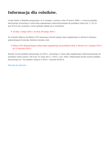 Informacja dla rolników. Urząd Gminy w Babiaku przypomina, że w związku z ustawą z dnia 10 marca 2006 r. o zwrocie podatku akcyzowego zawartego w cenie oleju napędowego wykorzystywanego do produkcji rolnej (Dz. U. Nr 52, poz.379 ze zm.) wniosek o zwrot podatku składa się w terminach: od dnia 1 lutego 2016 r. do dnia 29 lutego 2016 r. Do wniosku dołącza się faktury VAT stanowiące dowód zakupu oleju napędowego w okresie 6 miesięcy poprzedzających miesiąc złożenia wniosku czyli: faktury VAT dokumentujące zakup oleju napędowego do produkcji rolnej w okresie od 1 sierpnia 2015 r. do 31 stycznia 2016 r. Stawka zwrotu podatku akcyzowego na 2016 r. zawartego w cenie oleju napędowego wykorzystywanego do produkcji rolnej wynosi 1,00 zł na 1/1 oleju (Dz.U. z 2015 r. poz. 2042). Maksymalna kwota zwrotu podatku akcyzowego na 1 ha użytków rolnych w 2016 r. wyniesie 86,00 zł. Wniosek do pobrania.