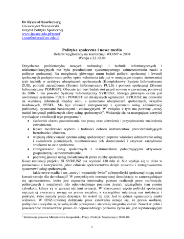 Dr Ryszard Szarfenberg Uniwersytet Warszawski Instytut Polityki Społecznej www.ips.uw.edu.pl/rszarf [email protected] Polityka społeczna i nowe media Referat wygłoszony na konferencji WDiNP w 2004 Wersja z 22.12.04 Dotychczas problematyka nowych technologii i technik informatycznych i telekomunikacyjnych nie była przedmiotem systematycznego zainteresowania nauki o polityce społecznej. Na marginesie głównego nurtu badań polityki społecznej i kwestii społecznych podejmowano próby opisu wdrożenia (ale już w mniejszym stopniu stosowania) tych technik w praktyce ubezpieczeń społecznych (Kompleksowy System Informatyczny ZUS), polityki zatrudnienia (System Informatyczny PULS) i pomocy społecznej (System Informatyczny POMOST). Obecnie ten nurt badań stoi przed nowym wyzwaniem, ponieważ do 2006 r. ma powstać Systemy Informatyczny SYRIUSZ, którego głównym celem jest uwolnienie systemów PULS i POMOST od dzisiejszych ograniczeń. SYRIUSZ ma pozwolić na wymianę informacji między nimi, a systemami ubezpieczeń społecznych, urzędów skarbowych, PESEL. Ma być również zintegrowany z systemem usług administracji publicznej, systemami bankowymi i edukacyjnymi. W związku z tym ma powstać „nowy model instytucji publicznych sfery usług społecznych”. Wskazuje się na następujące korzyści wynikające z realizacji tego programu1: • skrócenie okresu pozostawania bez pracy oraz ułatwienie i przyspieszenie znalezienia zatrudnienia, • lepsze możliwości wyboru i trafności doboru instrumentów przeciwdziałających bezrobociu i ubóstwu, • większą efektywność sytemu usług społecznych poprzez właściwe adresowanie usług i świadczeń pieniężnych, monitorowanie ich skuteczności i aktywne zarządzanie środkami na cele społeczne, • zintegrowanie usług społecznych z instrumentami pobudzającymi aktywność gospodarczą i samozatrudnienie, • poprawę jakości usług świadczonych przez służby społeczne. Koszt realizacji projektu SI SYRIUSZ ma wynieść 130 mln zł. Nie wydaje się to dużo w porównaniu z korzyściami, jakie odniesie społeczeństwo dzięki nowemu i zintegrowanemu systemowi usług społecznych. Jakie nowe media i ten „nowy i wspaniały świat” cyberpolityki społecznej mogą mieć konsekwencje dla demokracji? W perspektywie normatywnej demokracja to samoregulujące się społeczeństwo, które jest zapewnia minimalny poziom realizacji praw osobistych, politycznych i socjalnych (do odpowiedniego poziomu życia), szczególnie tym swoim członkom, którzy są w gorszej niż inni sytuacji. W klasycznym ujęciu polityki społecznej najczęściej zwracamy uwagę na prawa socjalne, a szczególnie interesują nas instytucje i praktyki, które narosły przez dziesiątki lat wokół tej idei. Jest to jednak ograniczony punkt widzenia. W ONZ-towskiej doktrynie praw człowieka uznaje się, że prawa osobiste, polityczne i socjalne są ze sobą ściśle powiązane i stanowią integralną całość. Nawet w pełni i powszechnie zrealizowane prawo do odpowiedniego poziomu życia nie jest wystarczającym 1 Informacja prasowa Ministerstwa Gospodarki, Pracy i Polityki Społecznej z 30.06.04. 1 warunkiem dobrego życia. Przekonaliśmy się na własnej skórze o tym, że brak poszanowania, ochrony i realizacji praw osobistych i politycznych może być równie dolegliwy, jak bieda, głód i choroba. Ponadto, wiemy coraz lepiej, że poszanowanie, ochrona i realizacja praw pierwszej generacji (osobiste i polityczne) jest również wielkim i kosztownym wyzwaniem, wbrew temu co twierdzą zwolennicy koncepcji utożsamiania tych praw z prawami negatywnymi. Nie należy przy tym pomijać praw trzeciej generacji, na które zaczęto zwracać większą uwagę w kontekście procesów globalizacji. Wynika stąd, że tradycyjna perspektywa polityki społecznej koncentrująca się jedynie na drugiej generacji praw (a i tu głównie na prawach socjalnych) jest zbyt ograniczona, aby dać nam odpowiedź na pytania, które sobie dzisiaj zadajemy. Nowe technologie i techniki są ludzkimi wytworami, które mogą być wykorzystane do robienia ludziom i dla ludzi przez ludzi różnie ocenianych rzeczy. Uznaję więc, że nie są one ani dobre, ani złe ze swojej natury, a ocenie podlegają tylko sposoby i konsekwencje ich stosowania głównie w wymiarze zbiorowym, tzn. wpływ ich stosowania na poszanowanie, ochronę i realizację praw człowieka z uwzględnieniem rozwarstwienia społecznego2. Ze względu na wielofunkcyjność nowych mediów jednostki mogą czerpać wielowymiarowe korzyści z ich wykorzystywania do własnych celów. Jeżeli zidentyfikujemy zbiorowość korzystających długo i intensywnie z nowych mediów i tych, którzy w ogóle z nich nie korzystają i porównamy ze sobą te populacje, to zapewne okaże się, że wśród pierwszych będzie większość tych, którzy należą do warstw średnich i wyższych, a wśród tych drugich przeważać będą członkowie klas niższych i zbiorowości zmarginalizowanych. Dlaczego tak musi być, przynajmniej w początkowej fazie wchłaniania nowych technologii przez samoregulujące się społeczeństwo? Internet pod pewnymi względami jest dobrem publicznym, np. po wprowadzeniu pewnych ograniczeń jest niekonkurencyjny w użytkowaniu, ale pod innymi jest dobrem prywatnym, ponieważ dość łatwo jest wykluczyć z korzystania tych, którzy nie zapłacą. To zdecydowało o tym, że powstał rynek na dostęp do globalnej sieci. Przy dużym popycie i licznych niedoskonałościach naszego rynku telekomunikacyjnego cena dostępu musiała być i nadal jest wysoka. Nasze społeczeństwo zaś już na tyle się rozwarstwiło pod względem dochodowym, że w 2003 r. 39% Polaków, którzy chcieli mieć dostęp nie mogło sobie na to pozwolić3. Jeżeli uznamy, że posiadanie dostępu do cyberprzestrzeni jest społecznie niezbędne, to ten wskaźnik można nazwać stopą ubóstwa relatywnego w tym wymiarze. Opłacenie dostępu to 