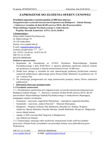 Nr sprawy: ZP/2503/07/2013 Andrychów, dnia 23.05.2013r. ZAPROSZENIE DO ZŁOŻENIA OFERTY CENOWEJ Przedmiot zapytania o wartości poniżej 14 000 Euro dotyczy: Zorganizowania wycieczki turystyczno-krajoznawczej Budapeszt – Zakole Dunaju - 3 dniowej w terminie od dnia 06-08 czerwca 2013r. dla 50 pracowników Wojewódzkiego Szpitala Psychiatrycznego w Andrychowie. Wspólny Słownik Zamówień (CPV): 63.51.10.00-4 1.Zamawiający: Wojewódzki Szpital Psychiatryczny ul. Dąbrowskiego 19 34-120 Andrychów Strona: www.szpital.info.pl E-mail: [email protected] Godziny urzędowania: 7 00 – 14 35 Tel: 33/875 -24-46 fax. 33/875-45-59 NIP 551-21-23-091 REGON 000805666 Podstawa opracowania: 1. Regulamin do Zarządzenia nr 23/2011 Dyrektora Wojewódzkiego Szpitala Psychiatrycznego z dnia 30.09.2011r. w sprawie udzielania zamówień, których wartość nie przekracza wyrażonej w złotych równowartości kwoty 14 000 euro. 2. Średni kurs złotego w stosunku do euro stanowiącego podstawę przeliczania wartości zamówień publicznych, ogłoszonego przez Prezesa Rady Ministrów na podstawie art. 35 ust. 3 ustawy Pzp. 3. Do niniejszego postępowania nie mają zastosowania przepisy ustawy Prawo zamówień publicznych. I. Informacje dotyczące postępowania: 1.1 Przedmiot zamówienia 1.1.1 Przedmiotem zamówienia jest zorganizowanie wycieczki turystyczno-krajoznawczej Budapeszt-Zakole Dunaju – 3 – dniowej w terminie od dnia 06-08 czerwca 2013r. dla 50 pracowników Wojewódzkiego Szpitala Psychiatrycznego w Andrychowie obejmującej następujące miejsca zwiedzania: − Esztergom – nazywany węgierskim Watykanem – największa węgierska bazylika; − Szentendre – nazywane „małym Paryżem” – Muzeum Marcepanu, − Budapeszt – Wzgórze Gellerta, Plac Bohaterów, Bazylika św. Stefana, Wzgórze Zamkowe, Baszty Rybackie, Katedra Macieja, Zamek Budziński, Wyspa św. Małgorzaty, − nocny objazd miasta, − zakupy w XIX wiecznej Hali Targowej w Budapeszcie, − rejs statkiem po Dunaju. 1.1.2 Zamawiający zastrzega sobie możliwość zmniejszenia liczby osób bez podania przyczyny. Zmiana liczby uczestników nie powoduje zmiany ceny jednostkowej przez Wykonawcę. NIP 551-21-23-091 www.szpital.info.pl REGON 000805666 e-mail [email protected] 1 Nr sprawy: ZP/2503/07/2013 Andrychów, dnia 23.05.2013r. 1.1.3 Wykonawca w swoje ofercie przedstawi ramowy program wycieczki, który będzie obejmował miejsca wymienione powyżej biorąc pod uwagę, że wyjazd uczestników do Budapesztu nastąpi dnia 06 czerwca w godzinach wczesnych rannych, jak również przewidywał powrót do Andrychowa w godzinach wieczornych 08 czerwca. Kolejność i program zwiedzania może ulec zmianie z uwagi na warunki atmosferyczne oraz dostępność zwiedzanych obiektów i nie stanowi zmiany umowy, ale wymaga akceptacji opiekuna grupy z ramienia Zamawiającego. 1.1.4 Wykonawca w cenie oferty zapewni: − przejazd autokarem turystycznym LUX, − opłaty drogowe i parkingowe, opłatę klimatyczną – jeśli dotyczy, − opieka pilota na całej trasie, − realizowanie programu przez lokalnego licencjonowanego przewodnika, − 2 noclegi w hotelu o minimalnym standardzie *** w pokojach dwuosobowych z łazienkami, (hotel w Budapeszcie lub odległość od miasta max. do10 km), − 2 śniadania, − 1 obiadokolacja, − 1 kolacja w regionalnej karczmie lub restauracji przy muzyce węgierskiej na żywo, − ubezpieczenie KL, NNW. 1.1.5 W cenie oferty należy nie uwzględniać cen biletów wstępu do zwiedzanych obiektów. 2. Oferty częściowe. Zamawiający nie dopuszcza składania oferty częściowej. 3. Termin wykonania zamówienia Wymagany termin realizacji zamówienia od dnia 06 – 08 czerwca 2013r. II. Informacje o oświadczeniach i dokumentach, jakie mają dostarczyć wykonawcy: 1. Aktualny odpis z właściwego rejestru lub z centralnej ewidencji i informacji o działalności gospodarczej, jeżeli odrębne przepisy wymagają wpisu do rejestru lub ewidencji, wystawionego nie wcześniej niż 6 miesięcy przed upływem terminu składania ofert. 2. Zaświadczenie o wpisie do rejestru organizatorów turystyki i pośredników turystycznych zgodnie z właściwymi postanowieniami ustawy z dnia 29 sierpnia 1997r. o usługach turystycznych (t.j. Dz.U.2004.223.2268 z późn. zm.) ze wskazaniem: zasięgu terytorialnego wykonywania działalności obejmującego miejsca realizacji niniejszego przedmiotu zamówienia i proponowanej trasy wycieczki. 3. Program wycieczki, który będzie obejmował swoim zakresem wszystkie miejsca wymienione w ppkt. 1.1.1 zaproszenia do złożenia oferty cenowej wraz z podaniem nazwy, standardu i adresu hotelu w jakim będą zakwaterowani uczestnicy wycieczki. 4. Wykaz wykonanych usług - zgodnie z załącznikiem nr 3. Zamawiający uzna powyższy warunek za spełniony, jeżeli Wykonawca wykaże minimum dwie usługi - organizacja wycieczki zagranicznej dla minimum 40 osób o wartości nie mniejszej niż 25 000 zł. brutto każda. 5. Polisę, a w przypadku jej braku inny dokument potwierdzający, że Wykonawca jest ubezpieczony od odpowiedzialności cywilnej w zakresie prowadzonej działalności. NIP 551-21-23-091 www.szpital.info.pl REGON 000805666 e-mail [email protected] 2 Nr sprawy: ZP/2503/07/2013 Andrychów, dnia 23.05.2013r. 6. Prawidłowo wypełniony i podpisany Formularz oferty stanowiący załącznik nr 1 7. Oświadczenie stanowiące załącznik nr 2 8. Zaakceptowany projekt umowy - stanowiący załącznik nr 4 III. Pracownicy Zamawiającego uprawnieni do bezpośredniego kontaktowania się z wykonawcami : w sprawach przedmiotu zamówienia: Elżbieta Krasuska tel. 33/875-24-46 wew. 232 w sprawach postępowania: Marzena Bury tel. 33/875-75-42 Zbigniew Mamica tel. 33/875-75-42 IV. Sposób przygotowania oferty oraz informacje dotyczące warunków składania ofert: 1. Oferta powinna być sporządzona w języku polskim; wskazane jest by była sporządzona na maszynie, komputerze lub nieścieralnym atramentem