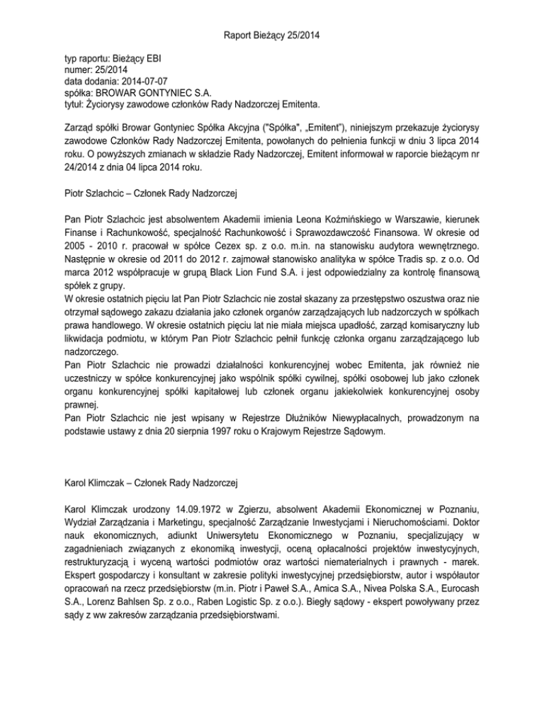 Zarząd spółki Browar Gontyniec Spółka Akcyjna ("Spółka", „Emitent”), niniejszym przekazuje życiorysy