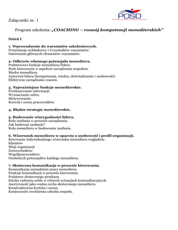 Załączniki nr. 1 Program szkolenia: „COACHING – rozwój kompetencji menedżerskich” Dzień I 1. Wprowadzenie do warsztatów szkoleniowych. Prezentacja wykładowcy i Uczestników warsztatów. Omówienie głównych elementów warsztatów. 2. Odkrycie własnego potencjału menedżera. Podstawowe funkcje menedżera/lidera. Style kierowania w aspekcie zarządzania zespołem. Marka menedżera. Autorytet lidera (kompetencja, wiedza, doświadczenie i osobowość). Efektywne zarządzanie czasem. 3. Najważniejsze funkcje menedżerskie. Przekazywanie informacji. Wyznaczanie celów. Motywowanie. Rozwój i ocena pracowników. 4. Błędne strategie menedżerskie. 5. Budowanie wiarygodności lidera. Rola zaufania w procesie zarządzania. Jak budować zaufanie? Rola menedżera w budowaniu zaufania. 6. Wizerunek menedżera w oparciu o osobowość i profil organizacji. Kreowanie indywidualnego wizerunku menedżera względem: Klientów Misji organizacji Zwierzchników Współpracowników Osobistych potencjałów każdego menedżera. 7. Skuteczna komunikacja w procesie kierowania. Komunikacja narzędziem pracy menedżera. Funkcje komunikacji w procesie kierowania. Podstawy skutecznego przekazu. Sztuka radzenia sobie w różnych sytuacjach komunikacyjnych. Asertywność jako ważna cecha skutecznego menedżera. Konstruktywna krytyka i ocena. Konieczność zwolnienia członka zespołu. DZIEŃ II 8. Planowanie i wyznaczanie celów. Proces planowania celów i określanie priorytetów. Monitorowanie realizacji celów – podejście sytuacyjne. 9. Tworzenie skutecznego, dynamicznego zespołu. Schemat realizacji zespołu. Określenie misji, celów, wartości i reguł panujących w zespole pod kątem realizacji celów. Odpowiedni dobór członków zespołu pod kątem postawy, kompetencji oraz umiejętności interakcji międzyludzkiej. Metody poprawiania efektywności istniejącego zespołu. Odpowiednia reakcja na niekorzystne zjawiska w organizacji. 10. Zarządzanie sytuacyjne w praktyce menedżerskiej. Specyfika działania menedżera w czterech stylach zarządzania. Cykl komunikacji z pracownikiem – dopasowanie stylu do etapu rozwoju pracownika. Planowanie, zlecanie, delegowanie. Ocena i informacja zwrotna. Odpowiedzialność – jak ją kreować 11. Warsztat symulacyjny kierowania zespołem: Prezentacja rezultatów pracy grup Wnioski uczestników Wnioski trenera, przywołanie analogicznych przypadków z warsztatu do konkretnych przypadków z rzeczywistych organizacji. 12. Skuteczne delegowanie zadań – główne zasady. Przygotowanie do delegowania zadań. Wyznaczenie obszaru zdań do delegowania – nasze cele i priorytety. Ocena kompetencji pracownika przed delegowaniem zadania. Klasyfikacja pracowników: podwładny o wysokiej świadomości i odpowiedzialności, pracownik o niskiej świadomości własnej wartości. 13.Sztuka motywowania pracownika. Wybrane koncepcje motywowania pracowników i ich przełożenie na funkcjonowanie organizacji. Rozpoznawanie indywidualnych wzorców komunikowania się menedżerów i ich konsekwencji dla procesów motywowania pracowników. Bycie rozpoznanym, zauważonym jako podstawowa potrzeba człowieka. Jak motywować – czego potrzebują ludzie, by efektywnie pracować? Motywowanie pracowników metodą kanapki Wzorzec tworzenia systemu motywacyjnego dla pracowników. 14. Rozwijanie samodzielności pracowników – ćwiczenia praktyczne. Kreowanie wartościowego pracownika – jak obudzić w pracownikach chęć do myślenia i działania. Zakres odpowiedzialności pracownika jako podstawa do pobudzenia go do działania. Rozwijanie, inspirowanie pomysłowości i kreatywności personelu. Złota zasada 3x8. 15. Konflikt w zespole - przeciwstawne poglądy drogą do kreowania nowych rozwiązań. Przyczyny konfliktów Style reakcji na konflikt Zasady rozwiązywania konfliktów Strategie radzenia sobie z konfliktem. Konflikty w grupie. Od konfliktu do negocjacji. 2 3