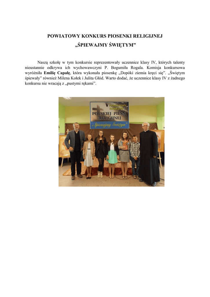 POWIATOWY KONKURS PIOSENKI RELIGIJNEJ „ŚPIEWAJMY ŚWIĘTYM” Naszą szkołę w tym konkursie reprezentowały uczennice klasy IV, których talenty nieustannie odkrywa ich wychowawczyni P. Bogumiła Rogala. Komisja konkursowa wyróżniła Emilię Capałę, która wykonała piosenkę „Dopóki ziemia kręci się”. „Świętym śpiewały” również Milena Kołek i Julita Głód. Warto dodać, że uczennice klasy IV z żadnego konkursu nie wracają z „pustymi rękami”.