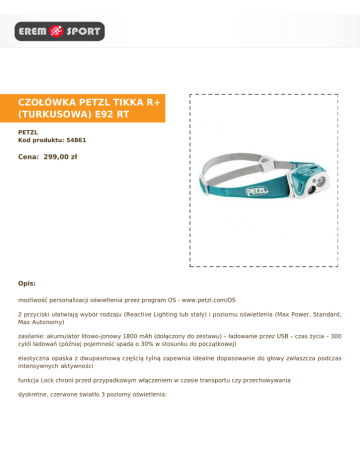 CZOŁÓWKA PETZL TIKKA R+ (TURKUSOWA) E92 RT PETZL Kod produktu: 54861 Cena: 299,00 zł Opis: możliwość personalizacji oświetlenia przez program OS - www.petzl.com/OS 2 przyciski ułatwiają wybór rodzaju (Reactive Lighting lub stały) i poziomu oświetlenia (Max Power, Standard, Max Autonomy) zasilanie: akumulator litowo-jonowy 1800 mAh (dołączony do zestawu) – ładowanie przez USB – czas życia – 300 cykli ładowań (później pojemność spada o 30% w stosunku do początkowej) elastyczna opaska z dwupasmową częścią tylną zapewnia idealne dopasowanie do głowy zwłaszcza podczas intensywnych aktywności funkcja Lock chroni przed przypadkowym włączeniem w czasie transportu czy przechowywania dyskretne, czerwone światło 3 poziomy oświetlenia: MAX POWER – priorytet na moc światła STANDARD – zrównoważony (moc/czas świecenia) MAX AUTONOMY – priorytet na czas świecenia Wodoodporność: IPX4 Kabel: USB 30 cm Waga: 115 g Certyfikacja: CE