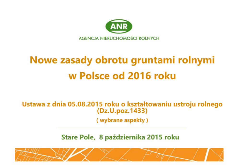 Nowe zasady obrotu gruntami rolnymi w Polsce od 2016 roku Ustawa z dnia 05.08.2015 roku o kształtowaniu ustroju rolnego (Dz.U.poz.1433) ( wybrane aspekty ) Stare Pole, 8 października 2015 roku www.anr.gov.pl Agencja Nieruchomości Rolnych Oddział Terenowy w Gdańsku 83-000 Pruszcz Gdański ul. Powstańców Warszawy 28 tel. 58 300-48-41 fax 58 300-48-43 e-mail: [email protected] Sekcje Zamiejscowe Gospodarowania Zasobem w: • Bytowie, • Malborku, • Skarszewach • Słupsku Zapraszamy od poniedziałku do piątku w godzinach: 7.45 - 15.45 www.anr.gov.pl Agencja Nieruchomości Rolnych jest państwową osobą prawną, której Skarb Państwa powierzył wykonywanie prawa własności i innych praw rzeczowych na jego rzecz w stosunku do mienia państwowego w rolnictwie. www.anr.gov.pl Agencja Nieruchomości Rolnych działa na podstawie : • ustawy o gospodarowaniu nieruchomościami rolnymi Skarbu Państwa • ustawy o kształtowaniu ustroju rolnego a także rozporządzeń wydanych do tych ustaw. www.anr.gov.pl Ustawa z dnia 05.08.2015 roku o kształtowaniu ustroju rolnego www.anr.gov.pl Dwa główne obszary regulowane ustawą o kształtowaniu ustroju rolnego I/ Dzierżawa oraz obrót nieruchomościami rolnymi na rynku prywatnym II/ Gospodarowanie Zasobem WRSP www.anr.gov.pl 1. Ustawa wprowadza m.in. nowy sposób liczenia powierzchni użytków rolnych. 2. Ilekroć w ustawie jest mowa o użytkach rolnych należy przez to rozumieć użytki rolne w rozumieniu przepisów o geodezji i kartografii. www.anr.gov.pl Art. 3 ust. 1 Za gospodarstwo rodzinne uważa się gospodarstwo rolne: 1) prowadzone przez rolnika indywidualnego oraz 2) w którym łączna powierzchnia użytków rolnych jest nie większa niż 300 ha. www.anr.gov.pl Art. 4 ust. 1 Za rolnika indywidualnego, o którym mowa w art. 3 ust. 1 pkt 1, uważa się osobę fizyczną będącą właścicielem, użytkownikiem wieczystym, samoistnym posiadaczem lub dzierżawcą nieruchomości rolnych, których łączna powierzchnia użytków rolnych nie przekracza 300 ha, posiadającą kwalifikacje rolnicze oraz co najmniej od 5 lat zamieszkałą w gminie, na obszarze której jest położona jedna z nieruchomości rolnych wchodzących w skład gospodarstwa rolnego, i prowadzącą przez ten okres osobiście to gospodarstwo. www.anr.gov.pl Art. 5 ust. 1 - 4 1. 2. 3. 4. Dowodem potwierdzającym osobiste prowadzenie gospodarstwa rolnego jest pisemne oświadczenie prowadzącego to gospodarstwo. Dowodem potwierdzającym zamieszkanie jest zaświadczenie o zamieszkaniu wydane przez organ właściwy w sprawach ewidencji ludności. Dowodem potwierdzającym powierzchnię posiadanych użytków rolnych są pisemne oświadczenia nabywcy i zbywcy nieruchomości rolnej zawierające informacje dotyczące numeru działki ewidencyjnej, jej położenia i powierzchni oraz klasy i rodzaju użytków rolnych, a także numeru księgi wieczystej albo zbioru dokumentów, o ile są prowadzone. Dowodem potwierdzającym posiadanie kwalifikacji rolniczych mogą być również odpowiednie dokumenty wydane przez właściwe organy lub instytucje państw członkowskich Europejskiego Obszaru Gospodarczego oraz Konfederacji Szwajcarskiej. www.anr.gov.pl Art. 6 ust. 1 Jeżeli wskutek przeniesienia własności nieruchomości rolnej albo jej części miałby nastąpić podział gospodarstwa rolnego, przeniesienie własności nieruchomości rolnej albo jej części może nastąpić w przypadku, gdy: 1) powierzchnia użytków rolnych, które pozostaną własnością zbywcy, będzie nie mniejsza niż powierzchnia użytków rolnych niezbędna do prowadzenia działalności rolniczej (podstawowa norma obszarowa użytków rolnych w gospodarstwie rolnym), a zbywana nieruchomość rolna albo jej część wraz z nieruchomościami rolnymi nabywcy utworzą bądź powiększą gospodarstwo rolne lub www.anr.gov.pl Art. 6 ust. 1 (cd.) 2) powierzchnia nabywanych użytków rolnych wraz z nieruchomościami rolnymi nabywcy stanowiącymi jego własność będzie większa niż powierzchnia użytków rolnych, które pozostaną własnością zbywcy, lub 3) zbywana nieruchomość rolna albo jej część obejmuje użytki rolne nieprzylegające do innych użytków rolnych wchodzących w skład tego samego gospodarstwa rolnego zbywcy, ale przylegające do nieruchomości rolnej wchodzącej w skład gospodarstwa rolnego i stanowiącej własność nabywcy, lub www.anr.gov.pl Art. 6 ust. 1 (cd.) 4) przy umowie zamiany różnica powierzchni zamienianych użytków rolnych liczonych w hektarach przeliczeniowych, o których mowa w przepisach o podatku rolnym, nie przekracza 10%, lub 5) ma na celu racjonalne ukształtowanie granicy między nieruchomościami rolnymi, lub www.anr.gov.pl Art. 6 ust. 1 (cd.) 6) własnością zbywcy pozostanie grunt pod budynkiem mieszkalnym wraz z innymi obiektami budowlanymi oraz gruntami do nich przyległymi, niezbędnymi do właściwego korzystania z budynku mieszkalnego, których łączna powierzchnia nie przekracza 0,5 ha, oraz zbywana nieruchomość rolna albo jej część wraz z nieruchomościami rolnymi nabywcy utworzą bądź powiększą gospodarstwo rolne. www.anr.gov.pl Art. 6 ust. 4 Dyrektor Oddziału stwierdza, w drodze decyzji, że dopuszczalny jest podział gospodarstwa rolnego. www.anr.gov.pl Art. 6 ust. 8 Do postępowań dotyczących wzruszenia decyzji ostatecznych wydanych na podstawie niniejszej ustawy, nie stosuje się art. 145–145b oraz art. 154–156 Kodeksu postępowania administracyjnego, jeżeli od dnia, w którym decyzje te stały się ostateczne, upłynęło 5 lat. www.anr.gov.pl Art. 6 ust. 9 Minister właściwy do spraw rozwoju wsi określi, w drodze rozporządzenia, podstawową normę obszarową użytków rolnych w gospodarstwie rolnym dla każdego województwa, mając na uwadze średnią powierzchnię gruntów rolnych wchodzących w skład gospodarstw rolnych w poszczególnych województwach i w kraju, ogłoszoną na podstawie przepisów o płatnościach w rama